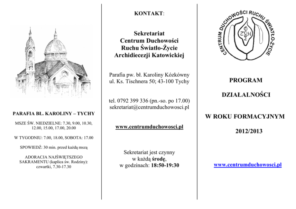 KONTAKT: Sekretariat Centrum Duchowości Ruchu Światło-Życie Archidiecezji Katowickiej Parafia pw. bł. Karoliny Kózkówny ul. Ks. Tischnera 50; 43-100 Tychy PROGRAM DZIAŁALNOŚCI tel. 0792 399 336 (pn.-so. po 17.00) [email protected] PARAFIA BŁ. KAROLINY – TYCHY MSZE ŚW. NIEDZIELNE: 7.30, 9.00, 10.30, 12.00, 15.00, 17.00, 20.00 W ROKU FORMACYJNYM www.centrumduchowosci.pl 2012/2013 W TYGODNIU: 7.00, 18.00, SOBOTA: 17.00 SPOWIEDŹ: 30 min. przed każdą mszą ADORACJA NAJŚWIĘTSZEGO SAKRAMENTU (kaplica św. Rodziny): czwartki, 7.30-17.30 Sekretariat jest czynny w każdą środę, w godzinach: 18:50-19:30 www.centrumduchowosci.pl SESJE SZKOŁY MODLITWY SEMINARIUM ODNOWY WIARY SPOTKANIA MODLITEWNE Początek sesji o godzinie 12.30, zakończenie ok. 19.15 SESJA I „Wiara, czyli o tym, kiedy cuda stają się możliwe” 15 września 2012 r. (sobota) SESJA II „I wszyscy zostali napełnieni Duchem Świętym ...” (Dz 2, 4a) Rekolekcje „w domu” dla dorosłych od 16 lutego 2013 r. do 11 maja 2013 r. Cotygodniowe, sobotnie spotkanie rozpoczyna się o godzinie 18.15 i obejmują: • spotkanie w małej grupie • konferencję • wspólną modlitwę przed spotkaniem o godz. 17.00 okazja do mszy świętej w kościele bł. Karoliny „U źródeł medytacji chrześcijańskiej” Spotkania modlitewne dla wszystkich chętnych prowadzi w każdy czwartek, w godzinach od 18.50 do 19.30 (w kaplicy św. Rodziny), Diakonia Modlitwy z parafii p.w. bł. Karoliny. TYSKIE WIECZORY UWIELBIENIA 20 października 2012 r., 26 stycznia 2013 r., 1 czerwca 2013 r. plan czuwania: Spotkanie organizacyjne: 10 listopada 2012 r. (sobota) SESJA III „Dar języków – Duch Święty, czy psychologia” 15 grudnia 2012 r. (sobota) SESJA IV „Wiara jako tęsknota za ojcem i matką, czyli o potrzebie prawdziwego ojcostwa i macierzyństwa w XXI wieku” 12 stycznia 2013 r. (sobota) Koszt jednej sesji: ofiara dobrowolna Zapisy w sekretariacie Centrum Duchowości (osobiście, telefonicznie, www.centrumduchowosci.pl) Zapisy przyjmowane są do środy poprzedzającej wydarzenie. 18.15 – Eucharystia 16 lutego 2013 r., godz. 18.15 w parafii p.w. bł. Karoliny (kaplica św. Rodziny pod kościołem). Zapisy w sekretariacie oraz na stronie www.centrumduchowosci.pl do dnia: 13. 02. 2013 r. Koszt : materiały 25zł WSPÓLNOTA DOROSŁYCH RUCHU ŚWIATŁO-ŻYCIE Spotkanie odbywa się w każdy II czwartek miesiąca. Spotkania w roku formacyjnym 2012/2013: 20.09.2012, 11.10.2012, 08.11.2012, 13.12.2012, 10.01.2013, 07.02.2013, 14.03.2013, 11.04.2013, 09.05.2013, 20.06.2013 Plan spotkań: 18.00 – Eucharystia 18.50 – wspólna modlitwa w kaplicy św. Rodziny 19.30 – konferencja – spotkania w grupach ok. 21.30 – zakończenie ok. 19.15 – czuwanie modlitewne - modlitwa uwielbienia - modlitwa o uzdrowienie (za chorych) ok. 21.30 – Apel Jasnogórski Czuwanie modlitewne poprowadzi Diakonia Modlitwy z parafii p.w. bł. Karoliny wraz z zaproszonymi kapłanami i muzykami KIERMASZ LITERATURY RELIGIJNEJ „Czytaj dobrą książkę” Kiermasz odbywa się dwa razy w roku: 28 październik 2012 r. 21 kwietnia 2013 r. w kościele p.w. bł. Karoliny w Tychach