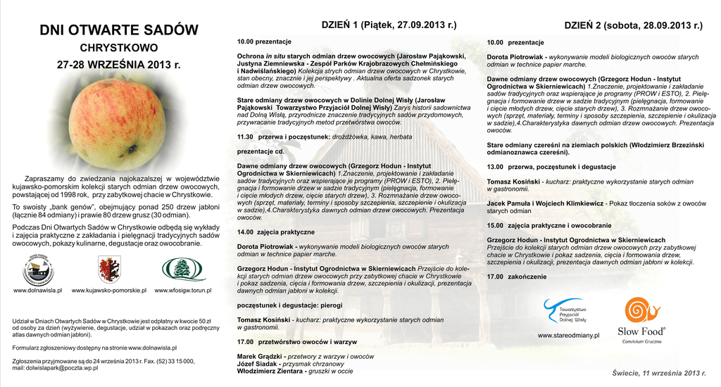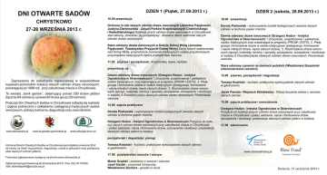 DZIEŃ 1 (Piątek, 27.09.2013 r.) DNI OTWARTE SADÓW CHRYSTKOWO 27-28 WRZEŚNIA 2013 r. DZIEŃ 2 (sobota, 28.09.2013 r.) 10.00 prezentacje 10.00 prezentacje Ochrona in situ starych odmian drzew owocowych (Jarosław Pająkowski, Justyna Ziemniewska - Zespół Parków Krajobrazowych Chełmińskiego i Nadwiślańskiego) Kolekcja strych odmian drzew owocowych w Chrystkowie, stan obecny, znacznie i jej perspektywy . Aktualna oferta sadzonek starych odmian drzew owocowych. Dorota Piotrowiak - wykonywanie modeli biologicznych owoców starych odmian w technice papier marche. Stare odmiany drzew owocowych w Dolinie Dolnej Wisły (Jarosław Pająkowski Towarzystwo Przyjaciół Dolnej Wisły) Zarys historii sadownictwa nad Dolną Wisłą, przyrodnicze znaczenie tradycyjnych sadów przydomowych, przywracanie tradycyjnych metod przetwórstwa owoców. Dawne odmiany drzew owocowych (Grzegorz Hodun - Instytut Ogrodnictwa w Skierniewicach) 1.Znaczenie, projektowanie i zakładanie sadów tradycyjnych oraz wspierające je programy (PROW i ESTO), 2. Pielęgnacja i formowanie drzew w sadzie tradycyjnym (pielęgnacja, formowanie i cięcie młodych drzew, cięcie starych drzew), 3. Rozmnażanie drzew owocowych (sprzęt, materiały, terminy i sposoby szczepienia, szczepienie i okulizacja w sadzie),4.Charakterystyka dawnych odmian drzew owocowych. Prezentacja owoców. 11.30 przerwa i poczęstunek: drożdżówka, kawa, herbata prezentacje cd. Zapraszamy do zwiedzania najokazalszej w województwie kujawsko-pomorskim kolekcji starych odmian drzew owocowych, powstającej od 1998 rok, przy zabytkowej chacie w Chrystkowie. To swoisty „bank genów”, obejmujący ponad 250 drzew jabłoni (łącznie 84 odmiany) i prawie 80 drzew grusz (30 odmian). Podczas Dni Otwartych Sadów w Chrystkowie odbędą się wykłady i zajęcia praktyczne z zakładania i pielęgnacji tradycyjnych sadów owocowych, pokazy kulinarne, degustacje oraz owocobranie. www.dolnawisla.pl www.kujawsko-pomorskie.pl www.wfosigw.torun.pl Dawne odmiany drzew owocowych (Grzegorz Hodun - Instytut Ogrodnictwa w Skierniewicach) 1.Znaczenie, projektowanie i zakładanie sadów tradycyjnych oraz wspierające je programy (PROW i ESTO), 2. Pielęgnacja i formowanie drzew w sadzie tradycyjnym (pielęgnacja, formowanie i cięcie młodych drzew, cięcie starych drzew), 3. Rozmnażanie drzew owocowych (sprzęt, materiały, terminy i sposoby szczepienia, szczepienie i okulizacja w sadzie),4.Charakterystyka dawnych odmian drzew owocowych. Prezentacja owoców. Stare odmiany czereśni na ziemiach polskich (Włodzimierz Brzeziński odmianoznawca czereśni). 13.00 przerwa, poczęstunek i degustacje Tomasz Kosiński - kucharz: praktyczne wykorzystanie starych odmian w gastronomii. Jacek Pamuła i Wojciech Klimkiewicz - Pokaz tłoczenia soków z owoców starych odmian 15.00 zajęcia praktyczne i owocobranie 14.00 zajęcia praktyczne Dorota Piotrowiak - wykonywanie modeli biologicznych owoców starych odmian w technice papier marche. Grzegorz Hodun - Instytut Ogrodnictwa w Skierniewicach Przejście do kolekcji starych odmian drzew owocowych przy zabytkowej chacie w Chrystkowie i pokaz sadzenia, cięcia i formowania drzew, szczepienia i okulizacji, prezentacja dawnych odmian jabłoni w kolekcji. Grzegorz Hodun - Instytut Ogrodnictwa w Skierniewicach Przejście do kolekcji starych odmian drzew owocowych przy zabytkowej chacie w Chrystkowie i pokaz sadzenia, cięcia i formowania drzew, szczepienia i okulizacji, prezentacja dawnych odmian jabłoni w kolekcji. 17.00 zakończenie poczęstunek i degustacje: pierogi Udział w Dniach Otwartych Sadów w Chrystkowie jest odpłatny w kwocie 50 zł od osoby za dzień (wyżywienie, degustacje, udział w pokazach oraz podręczny atlas dawnych odmian jabłoni). Tomasz Kosiński - kucharz: praktyczne wykorzystanie starych odmian w gastronomii. www.stareodmiany.pl 17.00 przetwórstwo owoców i warzyw Formularz zgłoszeniowy dostępny na stronie www.dolnawisla.pl Zgłoszenia przyjmowane są do 24 września 2013 r. Fax. (52) 33 15 000, mail: [email protected] Marek Grądzki - przetwory z warzyw i owoców Józef Siadak - przysmak chrzanowy Włodzimierz Zientara - gruszki w occie Świecie, 11 września 2013 r.