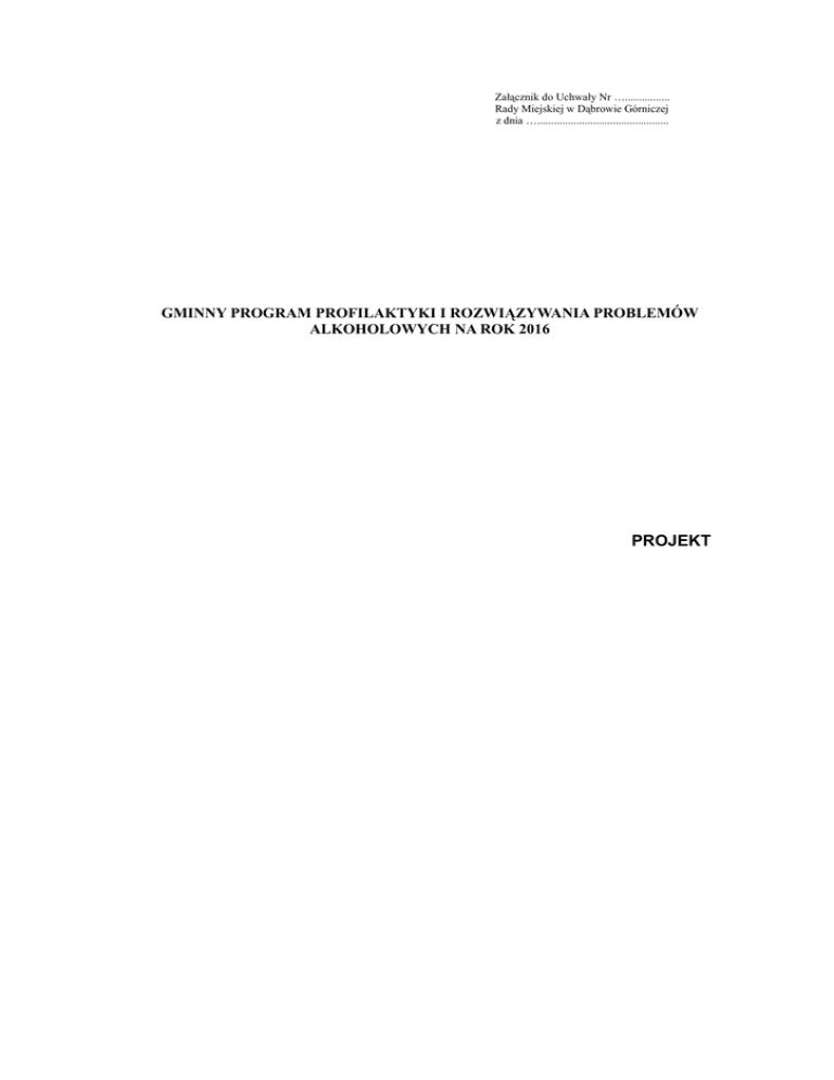 Załącznik do Uchwały Nr …................ Rady Miejskiej w Dąbrowie Górniczej z dnia …............................................... GMINNY PROGRAM PROFILAKTYKI I ROZWIĄZYWANIA PROBLEMÓW ALKOHOLOWYCH NA ROK 2016 PROJEKT WPROWADZENIE Podstawę prawną rozwiązywania problemów alkoholowych stanowi Ustawa o wychowaniu w trzeźwości i przeciwdziałaniu alkoholizmowi z dnia 26 października 1982 r. (tekst jednolity Dz. U. z 2012 r. poz.1356, z późn. zm.). Ustawa określa kierunki polityki państwa wobec alkoholu. Reguluje ona w sposób kompleksowy zagadnienia dotyczące profilaktyki i rozwiązywania problemów alkoholowych, wskazuje zadania z tego zakresu oraz podmioty odpowiedzialne za ich realizację. Określa również źródła finansowania tych zadań. Dokument opisuje funkcjonowanie rynku napojów alkoholowych. Reguluje dziedzinę promocji i reklamy napojów alkoholowych, a także formułuje przepisy karne dotyczące obrotu alkoholem i reklamy alkoholu. Wprowadza regulacje dotyczące postępowania wobec osób nadużywających alkoholu i określa podstawy lecznictwa odwykowego. Podmiotami wyznaczonymi przez ustawodawcę do realizacji zadań w przedmiotowym zakresie są organy administracji rządowej i jednostek samorządu terytorialnego. Zadania samorządów gminnych ujmowane są w formie gminnych programów profilaktyki i rozwiązywania problemów alkoholowych, które określają lokalną strategię w zakresie profilaktyki oraz minimalizacji szkód społecznych i indywidualnych, wynikających z nadużywania alkoholu. Do zadań tych zgodnie z art. 41 ustawy należy w szczególności: 1) zwiększanie dostępności pomocy terapeutycznej i rehabilitacyjnej dla osób uzależnionych od alkoholu, 2) udzielanie rodzinom, w których występują problemy alkoholowe, pomocy psychospołecznej i prawnej, a w szczególności ochrony przed przemocą w rodzinie, 3) prowadzenie profilaktycznej działalności informacyjnej i edukacyjnej w zakresie rozwiązywania problemów alkoholowych, w szczególności dla dzieci i młodzieży, w tym prowadzenie pozalekcyjnych zajęć sportowych, a także działań na rzecz dożywiania dzieci uczestniczących w pozalekcyjnych programach opiekuńczo-wychowawczych i socjoterapeutycznych, 4) wspomaganie działalności instytucji, stowarzyszeń i osób fizycznych, służącej rozwiązywaniu problemów alkoholowych, 5) wspieranie zatrudnienia socjalnego poprzez organizowanie i finansowanie centrów integracji społecznej. W myśl powyższego, corocznie opracowany zostaje dla Dąbrowy Górniczej Gminny Program Profilaktyki i Rozwiązywania Problemów Alkoholowych. Program koresponduje ze Strategią Rozwiązywania Problemów Społecznych Dąbrowy Górniczej przyjętą do realizacji zgodnie z art. 17 ust. 1 pkt 1 oraz art. 19 ust. 1 ustawy z dnia 12 marca 2004 roku o pomocy społecznej. Sporządzony został w oparciu o raport pn.: „Diagnoza lokalnych zagrożeń społecznych na terenie Miasta Dąbrowa Górnicza”. Przedmiotowy Program zawiera wykaz zadań z obszaru przeciwdziałania alkoholizmowi, których realizacja rozpoczęła się w latach ubiegłych i jest kontynuowana nadal, oraz zawiera propozycje nowych zadań do realizacji w 2016 roku, pochodzące od lokalnych instytucji, placówek oświatowych, organizacji pozarządowych i innych podmiotów prowadzących działalność pożytku publicznego, zaangażowanych w sprawy związane z rozwiązywaniem problemów alkoholowych. Program został poddany konsultacjom społecznym z organizacjami pozarządowymi, działającymi na rzecz problematyki uzależnień na terenie miasta, będącymi ważnym partnerem w realizacji określonych w nim zadań. Adresatami są wszyscy mieszkańcy Dąbrowy Górniczej, a w szczególności: - dzieci i młodzież szkolna, - osoby uzależnione od alkoholu, - członkowie rodzin osób z problemem alkoholowym, - osoby pijące alkohol szkodliwie bądź ryzykownie. Zadania ujęte w Programie finansowane są ze środków pozyskanych z pobieranych opłat za korzystanie z zezwoleń na sprzedaż detaliczną napojów alkoholowych, które stanowią dodatkowe dochody gminy. Zgodnie z art. 18² pkt. 2 ustawy o wychowaniu w trzeźwości i przeciwdziałaniu alkoholizmowi w 2016 r. z ww. środków finansowane będą również zadania realizowane przez placówkę wsparcia dziennego, o której mowa w przepisach o wspieraniu rodziny i systemie pieczy zastępczej. Jednostką koordynującą realizację Gminnego Programu Profilaktyki i Rozwiązywania Problemów Alkoholowych na rok 2016 jest Urząd Miejski – Wydział Zdrowia, Polityki Społecznej i Aktywizacji Zawodowej w Dąbrowie Górniczej. CEL I ZADANIA PROGRAMU CELEM PROGRAMU JEST OGRANICZANIE ZDROWOTNYCH I SPOŁECZNYCH SKUTKÓW WYNIKAJĄCYCH Z NADUŻYWANIA ALKOHOLU I UŻYWANIA INNYCH ŚRODKÓW PSYCHOAKTYWNYCH POPRZEZ PODNOSZENIE POZIOMU WIEDZY I ŚWIADOMOŚCI MIESZKAŃCÓW; PODEJMOWANIE DZIAŁAŃ ZMIERZAJĄCYCH DO ZMIANY STRUKTURY SPOŻYCIA NAPOJÓW ALKOHOLOWYCH ORAZ PROWADZENIE SKOORDYNOWANYCH DZIAŁAŃ PROFILAKTYCZNYCH, TERAPEUTYCZNYCH I REHABILITACYJNYCH. Cel Programu realizowany będzie poprzez pracę w nw. obszarach przy efektywnym wykorzystaniu zasobów instytucjonalnych w wybranych inicjatywach lokalnych: • Profilaktyki uniwersalnej – adresowanej do wszystkich mieszkańców, bez względu na stopień indywidualnego ryzyka występowania problemów związanych z używaniem alkoholu i innych substancji psychoaktywnych, • Profilaktyki selektywnej – adresowanej do jednostek lub grup o podwyższonym ryzyku wystąpienia problemów psychoaktywnych, związanych z używaniem alkoholu i innych substancji • Profilaktyki wskazującej – adresowanej do osób lub grup, które ujawniają pierwsze symptomy problemów związanych z używaniem substancji psychoaktywnych, ale nie spełniają kryteriów diagnostycznych picia szkodliwego lub uzależnienia, • Terapii – obejmującej z uzależnieniem. osoby wymagające specjalistycznej pomocy w związku