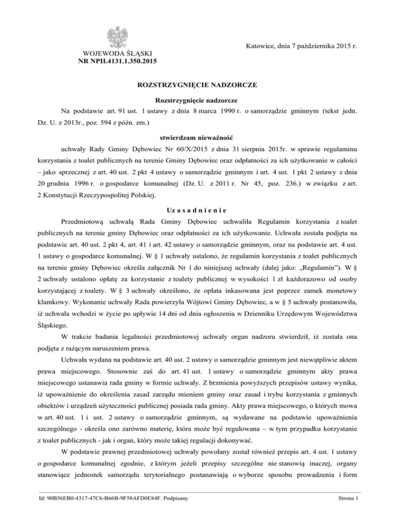 Katowice, dnia 7 października 2015 r. WOJEWODA ŚLĄSKI NR NPII.4131.1.350.2015 ROZSTRZYGNIĘCIE NADZORCZE Rozstrzygnięcie nadzorcze Na podstawie art. 91 ust. 1 ustawy z dnia 8 marca 1990 r. o samorządzie gminnym (tekst jedn. Dz. U. z 2013r., poz. 594 z późn. zm.) stwierdzam nieważność uchwały Rady Gminy Dębowiec Nr 60/X/2015 z dnia 31 sierpnia 2015r. w sprawie regulaminu korzystania z toalet publicznych na terenie Gminy Dębowiec oraz odpłatności za ich użytkowanie w całości – jako sprzecznej z art. 40 ust. 2 pkt 4 ustawy o samorządzie gminnym i art. 4 ust. 1 pkt 2 ustawy z dnia 20 grudnia 1996 r. o gospodarce komunalnej (Dz. U. z 2011 r. Nr 45, poz. 236.) w związku z art. 2 Konstytucji Rzeczypospolitej Polskiej. Uz a s a d n i e n i e Przedmiotową uchwałą Rada Gminy Dębowiec uchwaliła Regulamin korzystania z toalet publicznych na terenie gminy Dębowiec oraz odpłatności za ich użytkowanie. Uchwała została podjęta na podstawie art. 40 ust. 2 pkt 4, art. 41 i art. 42 ustawy o samorządzie gminnym, oraz na podstawie art. 4 ust. 1 ustawy o gospodarce komunalnej. W § 1 uchwały ustalono, że regulamin korzystania z toalet publicznych na terenie gminy Dębowiec określa załącznik Nr 1 do niniejszej uchwały (dalej jako: „Regulamin”). W § 2 uchwały ustalono opłatę za korzystanie z toalety publicznej w wysokości 1 zł każdorazowo od osoby korzystającej z toalety. W § 3 uchwały określono, że opłata inkasowana jest poprzez zamek monetowy klamkowy. Wykonanie uchwały Rada powierzyła Wójtowi Gminy Dębowiec, a w § 5 uchwały postanowiła, iż uchwała wchodzi w życie po upływie 14 dni od dnia ogłoszenia w Dzienniku Urzędowym Województwa Śląskiego. W trakcie badania legalności przedmiotowej uchwały organ nadzoru stwierdził, iż została ona podjęta z rażącym naruszeniem prawa. Uchwała wydana na podstawie art. 40 ust. 2 ustawy o samorządzie gminnym jest niewątpliwie aktem prawa miejscowego. Stosownie zaś do art. 41 ust. 1 ustawy o samorządzie gminnym akty prawa miejscowego ustanawia rada gminy w formie uchwały. Z brzmienia powyższych przepisów ustawy wynika, iż upoważnienie do określenia zasad zarządu mieniem gminy oraz zasad i trybu korzystania z gminnych obiektów i urządzeń użyteczności publicznej posiada rada gminy. Akty prawa miejscowego, o których mowa w art. 40 ust. 1 i ust. 2 ustawy o samorządzie gminnym, są wydawane na podstawie upoważnienia szczególnego - określa ono zarówno materię, która może być regulowana – w tym przypadku korzystanie z toalet publicznych - jak i organ, który może takiej regulacji dokonywać. W podstawie prawnej przedmiotowej uchwały powołany został również przepis art. 4 ust. 1 ustawy o gospodarce komunalnej zgodnie, z którym jeżeli przepisy szczególne nie stanowią inaczej, organy stanowiące jednostek samorządu terytorialnego postanawiają o wyborze sposobu prowadzenia i form —————————————————————————————————————————————————————— Id: 90B56EB0-4317-47C6-B66B-9F58AFD0E84F. Podpisany Strona 1 gospodarki komunalnej oraz o wysokości cen i opłat albo o sposobie ustalania cen i opłat za usługi komunalnego charakterze użyteczności publicznej oraz za korzystanie z obiektów i urządzeń użyteczności publicznej jednostek samorządu terytorialnego. Uprawnienia, o których mowa w ust. 1 pkt 2, organy stanowiące jednostek samorządu terytorialnego mogą powierzyć organom wykonawczym tych jednostek. Organ nadzoru zauważa jednakże, iż przepis art. 4 ust. 1 pkt 2 ustawy o gospodarce komunalnej nie stanowi podstawy do podjęcia uchwały o charakterze aktu prawa miejscowego. Stosownie do tego przepisu rada gminy ma kompetencje do uregulowania wysokości cen i opłat za usługi komunalne o charakterze użyteczności publicznej oraz za korzystanie z obiektów i urządzeń użyteczności publicznej jednostek samorządu terytorialnego. Uchwały tej treści nie można zaliczyć do kategorii aktów prawa miejscowego również z uwagi na brak przymiotu powszechnego obowiązywania jej norm. Jest ona zatem aktem kierownictwa wewnętrznego, gdyż wiąże jedynie podmioty znajdujące się w strukturze organizacyjnej, w której akt został wydany. W trakcie postępowania nadzorczego Gmina Dębowiec złożyła wyjaśnienia, prezentując orzecznictwo administracyjno-sądowe oraz poglądy doktryny, dotyczące wykładni przepisu art. 4 ust. 1 ustawy o gospodarce komunalnej jako podstawy do wydania aktu prawa miejscowego. Organ nadzoru podtrzymuje jednakże, ugruntowane od lat w tej materii poglądy wyrażane w orzecznictwie, iż przepis art. 4 ustawy z 20 grudnia 1996 roku o gospodarce komunalnej nie stanowi podstawy do podjęcia uchwały o charakterze aktu prawa miejscowego (por. wyrok NSA w Warszawie z dnia 24 sierpnia 2011r., sygn. akt II GSK 758/10, wyrok NSA z dnia 29 listopada 2001 roku, sygn. akt SA/Wr 1415/01, wyrok WSA w Łodzi z dnia 5 października 2007 r. sygn. akt II SA/Łd 665/07, opublikowane w CBOSA). Jak orzekł Wojewódzki Sąd Administracyjny w Szczecinie (wyrok z dnia 12 września 2012r., sygn. akt II SA/Sz 743/12 - utrzymany w mocy orzeczeniem NSA z dnia 5 marca 2014r., sygn. akt II GSK 2122/12, CBOSA) – „ (…) Zaskarżona uchwała jest zatem aktem kierownictwa wewnętrznego organu gminy, nie zaś aktem prawa miejscowego, na co w szczególności wskazuje art. 4 ust. 2 ustawy o gospodarce komunalnej. W myśl tego przepisu uprawnienia, o których mowa w ust. 1 pkt 2, organy stanowiące jednostek samorządu terytorialnego, mogą powierzyć organom wykonawczym tych jednostek. Gdyby uprawnienie o którym mowa w art. 4 ust. 1 pkt 2 powołanej ustawy, realizowało się w trybie aktu prawa miejscowego, uprawnienie to nie mogłoby być skutecznie scedowane na organ wykonawczy danej jednostki. Do aktów prawa miejscowego stanowionych przez organy gminy zalicza s