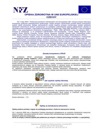 OPIEKA ZDROWOTNA W UNII EUROPEJSKIEJ CZECHY Od 1 maja 2004 r. Polska jest państwem członkowskim Unii Europejskiej (UE) i stosuje przepisy dotyczące koordynacji systemów zabezpieczenia społecznego. Każde państwo członkowskie posiada własny powszechny system opieki zdrowotnej, dlatego wprowadzone zostały wspólne przepisy koordynujące zasady udzielania świadczeń zdrowotnych osobom uprawnionym na podstawie ustawodawstw państw członkowskich. Zasady te określają przede wszystkim: rozporządzenie Parlamentu Europejskiego i Rady (WE) 883/2004 z dnia 29 kwietnia 2004 r. oraz rozporządzenie Parlamentu Europejskiego i Rady (WE) 987/2009 z dnia 16 września 2009 r. Przepisy te obowiązują w 27 państwach członkowskich Unii Europejskiej - Austria, Belgia, Bułgaria, Cypr, Czechy, Dania, Estonia, Finlandia, Francja, Grecja, Hiszpania, Holandia, Irlandia Litwa, Luksemburg, Łotwa, Malta, Niemcy, Polska, Portugalia, Rumunia, Słowacja, Słowenia, Szwecja, Węgry, Wielka Brytania, Włochy. Dzięki przepisom unijnym, prawo do korzystania ze świadczeń zdrowotnych niezbędnych z medycznego punktu widzenia z tytułu posiadania statusu świadczeniobiorcy w Polsce jest realizowane w obrębie całej UE. Dokumentem, na podstawie którego, w trakcie czasowego pobytu w innym państwie członkowskim, można skorzystać ze świadczeń zdrowotnych niezbędnych z medycznego punktu widzenia świadczonych przez lekarzy, przychodnie lub szpitale działające w ramach powszechnego systemu opieki zdrowotnej w danym kraju, jest Europejska Karta Ubezpieczenia Zdrowotnego lub Certyfikat Zastępujący Europejską Kartę Ubezpieczenia Zdrowotnego (dalej w tekście będzie używany skrót EKUZ, również w odniesieniu do Certyfikatu Zastępującego EKUZ) Zasady korzystania z EKUZ Na podstawie EKUZ przysługują świadczenia medyczne w zakresie niezbędnym z medycznego punktu widzenia. Lekarz udzielający pomocy ustala, czy dane świadczenie jest niezbędne w konkretnym przypadku, biorąc pod uwagę jego charakter oraz przewidywany okres pobytu ubezpieczonego w danym państwie członkowskim. Każde państwo członkowskie ustala własne kryteria i zasady udzielania świadczeń medycznych, dlatego polski świadczeniobiorca udający się do Republiki Czeskiej będzie, w zakresie prawa do świadczeń medycznych, traktowany jak osoba, która jest ubezpieczona w czeskim systemie opieki zdrowotnej. W niektórych państwach wymagane jest okazanie dowodu tożsamości (preferowany paszport) wraz z EKUZ oraz pozostawienie lekarzowi kserokopii karty, dlatego warto jest mieć przy sobie kilka jej kserokopii. Jak uzyskać opiekę lekarską Z leczenia należy korzystać w placówkach ochrony zdrowia mających umowy z kasami chorych. Ich adresy dostępne są w kasie chorych (zdravotna pojišťovna). Na leczenie szpitalne kieruje specjalista. W nagłych przypadkach można zgłaszać się bezpośrednio do szpitala. Należy przedstawić lekarzowi EKUZ oraz dowód tożsamości. Na podstawie karty lekarz wypisuje zaświadczenie (Potvrzení o nároku), na którym należy podać przewidywany okres pobytu w Czechach oraz podpisać oświadczenie, że pobyt na terenie Czech nie jest związany z planowym leczeniem. Numer alarmowy – 112 Opłaty za świadczenia zdrowotne: Opłaty podane poniżej z reguły nie podlegają zwrotowi, chyba że zaznaczono inaczej. Od 1 stycznia 2008 roku w Republice Czeskiej obowiązuje współpłacenie za uzyskane świadczenia medyczne, pobyt w szpitalu, wezwanie lekarza do domu i wydanie leku refundowanego przepisanego na receptę. Wysokość opłat jest następująca: 30 Kč za wizytę u lekarza (opłata jest pobierana po wizycie u lekarza pierwszego kontaktu i u specjalisty). Departament Współpracy Międzynarodowej, Centrala NFZ Grójecka 186, 02 390 Warszawa Tel +48 22 572 62 68, Fax +48 22 572 63 19 60 Kč za dzień pobytu w szpitalu lub sanatorium. Dzień przyjęcia jak i dzień wypisania ze szpitala liczone są każde jako jeden dzień pobytu w szpitalu. Poza nagłymi przypadkami lekarz musi wypisać skierowanie do szpitala. 90 Kč za wizytę w ambulatorium; dyżurującym oddziale specjalistycznym w godz. 17.00 do 7.00 w dni powszednie, soboty, niedziele i święta; wizytę domową lekarza dyżurującego. 30 Kč za wydanie każdego przepisanego na recepcie leku (nie pobiera się opłat za leki nierefundowane i dostępne bez recepty). Transport sanitarny na terytorium Czech jest nieodpłatny, natomiast koszty transportu powrotnego do Polski generalnie musi pokryć pacjent. Ratownictwo górskie jest odpłatne! Zalecane jest posiadanie polisy prywatnego ubezpieczenia pokrywającej świadczenia związane z wypadkiem narciarskim. UWAGA! EKUZ nie zapewnia pokrycia kosztów transportu medycznego do Polski oraz obowiązujących w Republice Czeskiej opłat za świadczenia medyczne, dlatego aby uniknąć obciążenia tymi kosztami, wskazane jest wykupienie dodatkowego prywatnego ubezpieczenia. Recepty Uprawnionym do wystawienia recepty objętej refundacją jest każdy lekarz. Leczenie prywatne Koszty leczenia w placówce nieposiadającej umowy z kasą chorych należy pokryć we własnym zakresie. Dokumenty niezbędne do uzyskania zwrotu poniesionych kosztów W przypadku obciążenia opłatą za usługi medyczne (o ile nie jest to wkład własny) można uzyskać zwrot tych kosztów po powrocie do Polski składając wniosek o zwrot kosztów do właściwego oddziału wojewódzkiego NFZ. W celu uzyskania zwrotu kosztów leczenia należy przedstawić oryginały rachunków, dowodów zapłaty oraz wszystkie inne dokumenty otrzymane od lekarza. Miejsce, gdzie w razie wątpliwości można uzyskać informacje Wszelkie informacje można uzyskać w kasach chorych (zdravotna pojišťovna) bądź w instytucji łącznikowej: Centrum Mezistátních Úhrad (CMU) Nám. W. Churchilla 2 113 59 Praha 3, Czech Republic Tel. 00420 234462041 Fax 00420 222734951 www.cmu.cz UWAGA!!! W przypadku konieczności przedłużenia okresu 