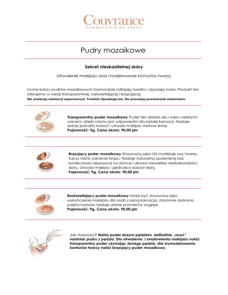 Pudry mozaikowe Sekret nieskazitelnej skóry Utrwalenie makijażu oraz modelowanie konturów twarzy Liczne kolory pudrów mozaikowych harmonijnie odbijają światło i ożywiają twarz. Produkt ten oferujemy w wersji transparentnej, rozświetlającej i brązującej. Nie zawierają substancji zapachowych. Produkty hipoalergiczne. Nie powodują powstawania zaskórników. Transparentny puder mozaikowy Puder ten składa się z wielu cielistych odcieni, dzięki czemu jest odpowiedni dla każdej karnacji. Nadaje skórze jednolity koloryt i utrwala makijaż, matowi skórę. Pojemność: 9g, Cena około: 90,00 pln Brązujący puder mozaikowy Stosowany jako róż modeluje rysy twarzy. Łączy różne odcienie brązu. Nadaje naturalną opaleniznę bez konieczności ekspozycji na słońce i ukrywa niewielkie niedoskonałości skóry. Utrwala makijaż i ujednolica koloryt skóry. Pojemność: 9g, Cena około: 90,00 pln Rozświetlający puder mozaikowy Może być stosowany jako wykończenie makijażu dla osób z jasną karnacją, starannie dobrana paleta kolorów nadaje skórze promienny wygląd. Pojemność: 9g, Cena około: 90,00 pln Jak stosować? Nałóż puder dużym pędzlem, delikatnie „zrzuć” nadmiar pudru z pędzla. Dla utrwalenia i zmatowienia makijażu nałóż transparentny puder używając dużego pędzla, dla wymodelowania konturów twarzy nałóż brązujący puder mozaikowy.
