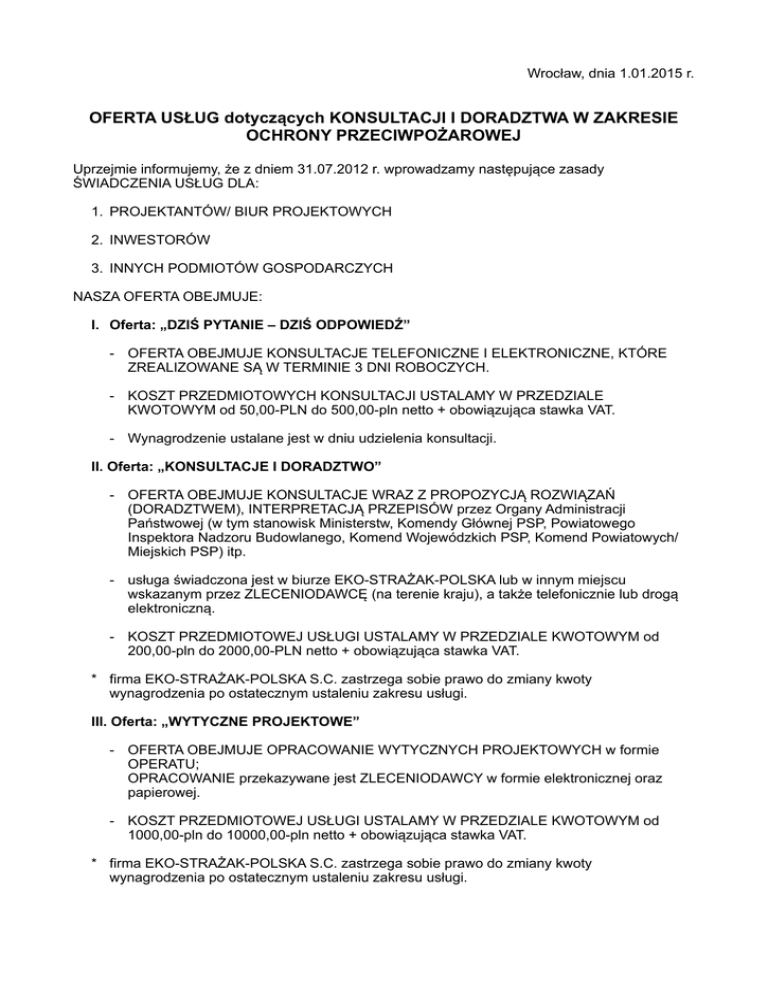 Wrocław, dnia 1.01.2015 r. OFERTA USŁUG dotyczących KONSULTACJI I DORADZTWA W ZAKRESIE OCHRONY PRZECIWPOŻAROWEJ ! Uprzejmie informujemy, że z dniem 31.07.2012 r. wprowadzamy następujące zasady ŚWIADCZENIA USŁUG DLA: ! 1. PROJEKTANTÓW/ BIUR PROJEKTOWYCH ! 2. INWESTORÓW 3. INNYCH PODMIOTÓW GOSPODARCZYCH !NASZA OFERTA OBEJMUJE: ! I. Oferta: „DZIŚ PYTANIE – DZIŚ ODPOWIEDŹ” ! - OFERTA OBEJMUJE KONSULTACJE TELEFONICZNE I ELEKTRONICZNE, KTÓRE ZREALIZOWANE SĄ W TERMINIE 3 DNI ROBOCZYCH. ! - KOSZT PRZEDMIOTOWYCH KONSULTACJI USTALAMY W PRZEDZIALE KWOTOWYM od 50,00-PLN do 500,00-pln netto + obowiązująca stawka VAT. ! - Wynagrodzenie ustalane jest w dniu udzielenia konsultacji. ! II. Oferta: „KONSULTACJE I DORADZTWO” ! - OFERTA OBEJMUJE KONSULTACJE WRAZ Z PROPOZYCJĄ ROZWIĄZAŃ ! (DORADZTWEM), INTERPRETACJĄ PRZEPISÓW przez Organy Administracji Państwowej (w tym stanowisk Ministerstw, Komendy Głównej PSP, Powiatowego Inspektora Nadzoru Budowlanego, Komend Wojewódzkich PSP, Komend Powiatowych/ Miejskich PSP) itp. - usługa świadczona jest w biurze EKO-STRAŻAK-POLSKA lub w innym miejscu wskazanym przez ZLECENIODAWCĘ (na terenie kraju), a także telefonicznie lub drogą elektroniczną. ! - KOSZT PRZEDMIOTOWEJ USŁUGI USTALAMY W PRZEDZIALE KWOTOWYM od do 2000,00-PLN netto + obowiązująca stawka VAT. ! * firma200,00-pln EKO-STRAŻAK-POLSKA S.C. zastrzega sobie prawo do zmiany kwoty wynagrodzenia po ostatecznym ustaleniu zakresu usługi. ! III. Oferta: „WYTYCZNE PROJEKTOWE” ! !* !! - OFERTA OBEJMUJE OPRACOWANIE WYTYCZNYCH PROJEKTOWYCH w formie OPERATU; OPRACOWANIE przekazywane jest ZLECENIODAWCY w formie elektronicznej oraz papierowej. - KOSZT PRZEDMIOTOWEJ USŁUGI USTALAMY W PRZEDZIALE KWOTOWYM od 1000,00-pln do 10000,00-pln netto + obowiązująca stawka VAT. firma EKO-STRAŻAK-POLSKA S.C. zastrzega sobie prawo do zmiany kwoty wynagrodzenia po ostatecznym ustaleniu zakresu usługi. !! „STAŁA UMOWA WSPÓŁPRACY” ! IV. -Oferta: OFERTA SKIEROWANA JEST DO BIUR PROJEKTOWYCH, które nie są zainteresowane ! każdorazowym rozliczaniem usługi polegającej na telefonicznym, elektronicznym lub innym sposobem udzielania konsultacji, doradztwa czy uzgodnień dokumentacji projektowych w zakresie ochrony przeciwpożarowej. - ROZLICZENIA odbywają się w systemie miesięcznym lub po zakończeniu zadania (projektu), obejmują całokształt usług wykonanych przez firmę EKO-STRAŻAK-POLSKA na rzecz ZLECENIODAWCY. ! - WZÓR UMOWY oraz zakres czynności jak i wynagrodzenia ustalany jest w porozumieniu ze ZLECENIODAWCĄ. ! V. Oferta: „UZGADNIANIE DOKUMENTACJI PROJEKTOWEJ W ZAKRESIE ZGODNOŚCI Z PRZEPISAMI O OCHRONIE PRZECIWPOŻAROWEJ” ! - OFERTA realizowana jest pod następującymi warunkami: ! * uzgadniamy dokumentacje projektowe wyłącznie przesłane drogą elektroniczną ! ! ! ! zawierające opis jak i rysunki w DWG lub dostarczone na nośniku CD/USB /dopuszcza się do weryfikacji dostarczenie projektu tylko w wersji papierowej po wcześniejszym uzgodnieniu * dokumentacji nie uzgadniamy w dniu jej przesłania czy dostarczenia (przedmiotowy warunek dot. także dokumentacji dostarczonej w wersji papierowej) * po zapoznaniu się z dokumentacją w terminie 3 dni roboczych wyznaczamy termin uzgodnienia dokumentacji z rzeczoznawcą ds. zabezpieczeń przeciwpożarowych * jeżeli dokumentacja zawiera błędy/ braki lub inne wady informujemy drogą elektroniczną o konieczności naniesienia poprawek. - KWOTA ZA PRZEDMIOTOWĄ USŁUGĘ JEST KAŻDORAZOWO USTALANA po otrzymaniu dokumentacji drogą elektroniczną, min. koszt uzgodnienia wynosi 300,00-pln netto + obowiązująca stawka VAT. „EKSPERTYZA TECHNICZNA” ! VI.-Oferta: OFERTA OBEJMUJE SPORZĄDZENIE OPRACOWANIA W MYŚL § 2 ust. 2 i 3a ! rozporządzenia Ministra Infrastruktury z dn. 12 kwietnia 2002 r. [Dz.U. nr 75 poz. 690 z późn.zm.] oraz innych obowiązujących PROCEDUR; Usługa świadczona jest PRZEZ RZECZOZNAWCÓW WSPÓŁPRACUJĄCYCH Z FIRMĄ EKO-STRAŻAK-POLSKA S.C. - KWOTA ZA PRZEDMIOTOWĄ USŁUGĘ USTALANA JEST W POROZUMIENIU ZE ZLECENIODAWCĄ PO ZAPOZNANIU SIĘ ZE SZCZEGÓŁAMI dot. wystąpienia do Wojewódzkiego Komendanta PSP i uzyskaniem POSTANOWIENIA WYRAŻAJĄCEGO ZGODĘ NA SPEŁNIENIE WYMAGAŃ Z ZAKRESU OCHRONY PRZECIWPOŻAROWEJ W SPOSÓB INNY, tj. zaproponowany w ekspertyzie technicznej. ! POZOSTAJEMY DO PAŃSTWA DYSPOZYCJI: OD PONIEDZIAŁKU DO PIĄTKU W GODZ. od 8:00 do 16:00 tel. 71 78 30 801 tel./fax 71 716 58 85 mail: [email protected] ! - ZESPÓŁ EKO-STRAŻAK-POLSKA -