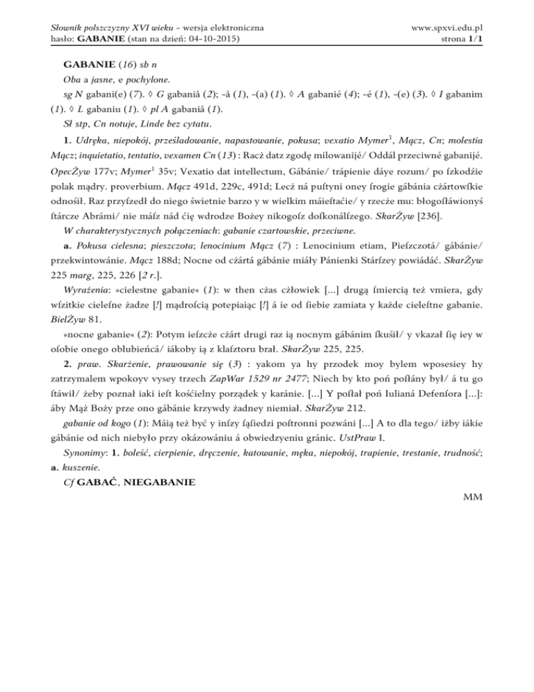 Słownik polszczyzny XVI wieku - wersja elektroniczna hasło: GABANIE (stan na dzień: 04-10-2015) www.spxvi.edu.pl strona 1/1 GABANIE (16) sb n Oba a jasne, e pochylone. sg N gabani(e) (7). ◊ G gabaniå (2); -å (1), -(a) (1). ◊ A gabanié (4); -é (1), -(e) (3). ◊ I gabanim (1). ◊ L gabaniu (1). ◊ pl A gabaniå (1). Sł stp, Cn notuje, Linde bez cytatu. 1. Udręka, niepokój, prześladowanie, napastowanie, pokusa; vexatio Mymer1, Mącz, Cn; molestia Mącz; inquietatio, tentatio, vexamen Cn (13) : Racż datz zgodę milowanijé/ Oddál przeciwné gabanijé. OpecŻyw 177v; Mymer1 35v; Vexatio dat intellectum, Gábánie/ trápienie dáye rozum/ po ſzkodźie polak mądry. proverbium. Mącz 491d, 229c, 491d; Lecż ná puſtyni oney ſrogie gábánia cżártowſkie odnośił. Raz przyſzedł do niego świetnie barzo y w wielkim máieſtaćie/ y rzecże mu: błogoſłáwionyś ſtárcze Abrámi/ nie máſz nád ćię wdrodze Bożey nikogoſz doſkonálſzego. SkarŻyw [236]. W charakterystycznych połączeniach: gabanie czartowskie, przeciwne. a. Pokusa cielesna; pieszczota; lenocinium Mącz (7) : Lenocinium etiam, Pieſzczotá/ gábánie/ przekwintowánie. Mącz 188d; Nocne od cżártá gábánie miáły Pánienki Stárſzey powiádáć. SkarŻyw 225 marg, 225, 226 [2 r.]. Wyrażenia: »cielestne gabanie« (1): w then cżas cżłowiek [...] drugą ſmiercią też vmiera, gdy wſzitkie cieleſne żadze [!] mądroſcią potepiaiąc [!] á ie od ſiebie zamiata y każde cieleſtne gabanie. BielŻyw 81. »nocne gabanie« (2): Potym ieſzcże cżárt drugi raz ią nocnym gábánim ſkuśił/ y vkazał ſię iey w oſobie onego oblubieńcá/ iákoby ią z klaſztoru brał. SkarŻyw 225, 225. 2. praw. Skarżenie, prawowanie się (3) : yakom ya hy przodek moy bylem wposesiey hy zatrzymalem wpokoyv vysey trzech ZapWar 1529 nr 2477; Niech by kto poń poſłány był/ á tu go ſtáwił/ żeby poznał iaki ieſt kośćielny porządek y karánie. [...] Y poſłał poń Iulianá Defenſora [...]: áby Mąż Boży prze ono gábánie krzywdy żadney niemiał. SkarŻyw 212. gabanie od kogo (1): Máią też być y inſzy ſąſiedzi poſtronni pozwáni [...] A to dla tego/ iżby iákie gábánie od nich niebyło przy okázowániu á obwiedzyeniu gránic. UstPraw I. Synonimy: 1. boleść, cierpienie, dręczenie, katowanie, męka, niepokój, trapienie, trestanie, trudność; a. kuszenie. Cf GABAĆ, NIEGABANIE MM
