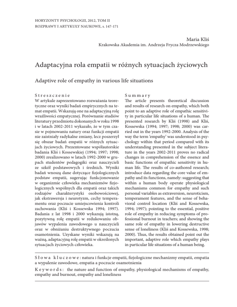 HORYZONTY PSYCHOLOGII, 2012, TOM II ROZPRAWY I ARTYKUŁY NAUKOWE, s. 147-171 Maria Kliś Krakowska Akademia im. Andrzeja Frycza Modrzewskiego Adaptacyjna rola empatii w różnych sytuacjach życiowych Adaptive role of empathy in various life situations Streszczenie W artykule zaprezentowano rozważania teoretyczne oraz wyniki badań empirycznych na temat empatii. Wskazują one na adaptacyjną rolę wrażliwości empatycznej. Porównanie studiów literatury przedmiotu dokonanych w roku 1998 i w latach 2002-2011 wykazało, że w tym czasie w pojmowaniu natury oraz funkcji empatii nie zaistniały radykalne zmiany, lecz poszerzył się obszar badań empatii w różnych sytuacjach życiowych. Prezentowane współautorskie badania Kliś i Kossewskiej (1994; 1997; 1998; 2000) zrealizowano w latach 1992-2000 w grupach studentów pedagogiki oraz nauczycieli ze szkół podstawowych i średnich. Wyniki badań wnoszą dane dotyczące fizjologicznych podstaw empatii, sugerując funkcjonowanie w organizmie człowieka mechanizmów fizjologicznych wspólnych dla empatii oraz takich rodzajów charakterystyki osobowościowej, jak ekstrawersja i neurotyzm, cechy temperamentu oraz poczucie umiejscowienia kontroli zachowania (Kliś i Kossewska 1994; 1997). Badania z lat 1998 i 2000 wykazują istotną, pozytywną rolę empatii w redukowaniu objawów wypalenia zawodowego u nauczycieli oraz w obniżaniu destruktywnego poczucia osamotnienia. Uzyskane wyniki wskazują na ważną, adaptacyjną rolę empatii w określonych sytuacjach życiowych człowieka. Summary The article presents theoretical discussion and results of research on empathy, which both point to an adaptive role of empathic sensitivity in particular life situations of a human. The presented research by Kliś (1998) and Kliś, Kossewska (1994; 1997; 1998; 2000) was carried out in the years 1992-2000. Analysis of the way the term ‘empathy’ was understood in psychology within that period compared with its understanding presented in the subject literature in the years 2002-2011 proves no radical changes in comprehension of the essence and basic functions of empathic sensitivity in human life. The results of co-authored research; introduce data regarding the core value of empathy and its functions, namely: suggesting that within a human body operate physiological mechanisms common for empathy and such personal variables as extraversion, neuroticism, temperament features, and the sense of behavioral control location (Kliś and Kossewska, 1994; 1997); pointing to the essential, positive role of empathy in reducing symptoms of professional burnout in teachers; and showing the same role of empathy in lowering destructive sense of loneliness (Kliś and Kossewska, 1998; 2000). Thus, the results obtained point out the important, adaptive role which empathy plays in particular life situations of a human being. S ł o w a k l u c z o w e : natura i funkcje empatii, fizjologiczne mechanizmy empatii, empatia a wypalenie zawodowe, empatia a poczucie osamotnienia K e y w o r d s : the nature and function of empathy, physiological mechanisms of empathy, empathy and burnout, empathy and loneliness 148 M. Kliś, Adaptacyjna rola empatii w różnych sytuacjach życiowych (na podstawie badań... HORYZONTY PSYCHOLOGII, 2012, TOM II – ROZPRAWY I ARTYKUŁY NAUKOWE Wprowadzenie Rozumienie pojęcia „empatia” do dziś ewoluuje – od chwili wprowadzenia go w roku 1909 do psychologii przez Titchenera. Obecnie empatia pojmowana jest przez większość zainteresowanych nią badaczy jako wielowymiarowe, interpsychiczne zjawisko, którego natura polega na zdolności współbrzmienia z emocjami drugiej osoby, doznawania jej wewnętrznych przeżyć bez utożsamiania się z nią oraz zdolności rozumienia przekonań, postaw i ról pełnionych przez innych, jak również na umiejętności równoczesnego koordynowania tych dwóch aspektów – emocjonalnego i poznawczego. W psychologii trwa dyskusja nad znaczeniem empatii w działaniach podejmowanych przez człowieka w różnych sytuacjach życiowych. Większość doniesień wskazuje na pozytywne oddziaływania wrażliwości empatycznej na prospołeczne, altruistyczne postawy i zachowania, skłonność do przestrzegania zasad moralnych, ułatwienia w komunikacji werbalnej oraz w realizowaniu tzw. zawodów pomagających. Jednakże przywoływane są również przykłady negatywnego oddziaływania empatii, np. narastania agresji w stosunku do osoby, która jest źródłem pobudzenia empatycznego. Znacznie mniejsza liczba prac badawczych poświęcona jest poszukiwaniu fizjologicznych podstaw doznawania empatii. Celem niniejszego artykułu jest przedstawienie podsumowania współautorskich badań Kliś i Kossewskiej, zrealizowanych w latach 1992-2000. Wyniki badań z roku 1994 oraz 1997 zachęcają do refleksji i podjęcia dalszych studiów nad fizjologicznymi podstawami wrażliwości empatycznej. Zdają się one sugerować występowanie w organizmie człowieka mechanizmów fizjologicznych wspólnych dla empatii oraz pewnych cech osobowości i temperamentu, związanych z funkcjonowaniem tzw. istoty siateczkowatej w pniu mózgu. Wyniki innych współautorskich badań (Kliś, Kossewska, 1998; 2000) wykazały – obok relacji, jakie kształtują się między empatią a innymi cechami osobowości – pozytywne, adaptacyjne oddziaływania wrażliwości empatycznej w dwóch ważnych dla człowieka sytuacjach życiowych, takich jak: zmaganie się z objawami zespołu wypalenia zawodowego oraz przezwyciężanie destruktywnego poczucia osamotnienia. Rola empatii w tego typu sytuacjach życiowych, nie była – jak dotąd – przedmiotem badań. Podkreślenie tej właśnie, adaptacyjnej funkcji empatii, to główne novum obecnej publikacji – w stosunku do prac wcześniejszych. Wyniki, które uzyskano, mają istotne, praktyczne aplikacje: wskazują na potrzebę rozwijania wrażliwości empatycznej w środowisku nauczycielskim jako jednego z 
