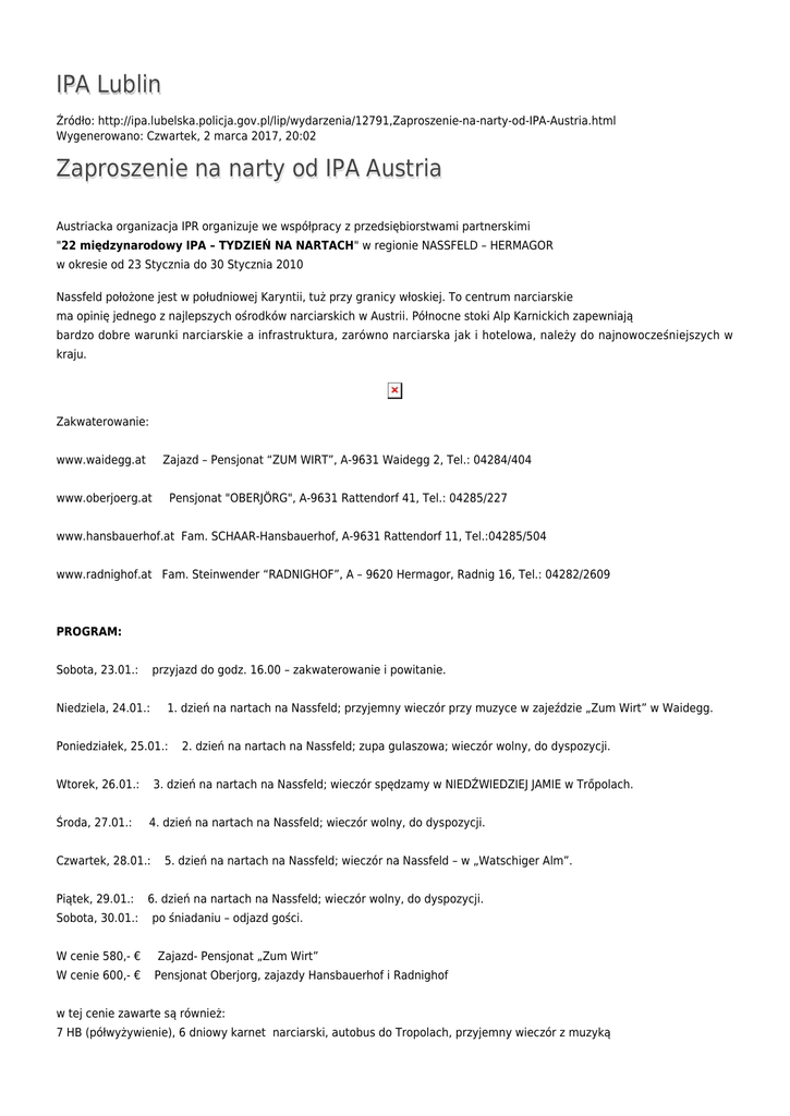 IPA Lublin Źródło: http://ipa.lubelska.policja.gov.pl/lip/wydarzenia/12791,Zaproszenie-na-narty-od-IPA-Austria.html Wygenerowano: Czwartek, 2 marca 2017, 20:02 Zaproszenie na narty od IPA Austria Austriacka organizacja IPR organizuje we współpracy z przedsiębiorstwami partnerskimi "22 międzynarodowy IPA – TYDZIEŃ NA NARTACH" w regionie NASSFELD – HERMAGOR w okresie od 23 Stycznia do 30 Stycznia 2010 Nassfeld położone jest w południowej Karyntii, tuż przy granicy włoskiej. To centrum narciarskie ma opinię jednego z najlepszych ośrodków narciarskich w Austrii. Północne stoki Alp Karnickich zapewniają bardzo dobre warunki narciarskie a infrastruktura, zarówno narciarska jak i hotelowa, należy do najnowocześniejszych w kraju. Zakwaterowanie: www.waidegg.at Zajazd – Pensjonat “ZUM WIRT”, A-9631 Waidegg 2, Tel.: 04284/404 www.oberjoerg.at Pensjonat "OBERJÖRG", A-9631 Rattendorf 41, Tel.: 04285/227 www.hansbauerhof.at Fam. SCHAAR-Hansbauerhof, A-9631 Rattendorf 11, Tel.:04285/504 www.radnighof.at Fam. Steinwender “RADNIGHOF”, A – 9620 Hermagor, Radnig 16, Tel.: 04282/2609 PROGRAM: Sobota, 23.01.: przyjazd do godz. 16.00 – zakwaterowanie i powitanie. Niedziela, 24.01.: 1. dzień na nartach na Nassfeld; przyjemny wieczór przy muzyce w zajeździe „Zum Wirt” w Waidegg. Poniedziałek, 25.01.: Wtorek, 26.01.: Środa, 27.01.: 3. dzień na nartach na Nassfeld; wieczór spędzamy w NIEDŹWIEDZIEJ JAMIE w Trőpolach. 4. dzień na nartach na Nassfeld; wieczór wolny, do dyspozycji. Czwartek, 28.01.: Piątek, 29.01.: Sobota, 30.01.: 2. dzień na nartach na Nassfeld; zupa gulaszowa; wieczór wolny, do dyspozycji. 5. dzień na nartach na Nassfeld; wieczór na Nassfeld – w „Watschiger Alm”. 6. dzień na nartach na Nassfeld; wieczór wolny, do dyspozycji. po śniadaniu – odjazd gości. W cenie 580,- € Zajazd- Pensjonat „Zum Wirt” W cenie 600,- € Pensjonat Oberjorg, zajazdy Hansbauerhof i Radnighof w tej cenie zawarte są również: 7 HB (półwyżywienie), 6 dniowy karnet narciarski, autobus do Tropolach, przyjemny wieczór z muzyką w Zajeździe „Zum Wirt”, wieczór w Watschiger Alm, transport do i z Nassfeld, zupa gulaszowa, Tiroler – Grostlessen, Kaiserschmarren, drobny upominek dla gości. Dodatek do pokoju 1-osobowego: 40 € na tydzień (ilość pokoi 1 osobowych ograniczona). Życzenia dotyczące zakwaterowania będą uwzględniane po przedłożeniu zameldowania. Opieka narciarzy zapewniona jest przez kolegów IPA w Oberkarnten. Dla początkujących dysponujemy miejscową szkółką. Zmiany Programu zastrzeżone Uczestnictwo w organizowanym wyjeździe na WŁASNE RYZYKO! Organizator nie ponosi żadnej odpowiedzialności! W Storno znajdują się również biura podróży. Dane banku: RAIKA Hermagor, transfer z Austrii, Nr konta: 1000 47902, BLZ: 39543 Transfer z zagranicy: Informacja: IBAN AT02 3954 3001 0004 7902 / BIC RZKTAT2K543. IPA Karyntia, biuro łącznikowe w Górnej Karyntii, Ewald Grollitsch, A-9620 Hermagor, Radnig 59, Tel./Fax Nr.: +43 4282 3804 lub Georg Rindler, A-9853 Gmünd, Gries 2, tel. / fax: +43 4732 3843. Tel. / fax +43 4732 3843 Rejestracja: e-mail: Ewald Grollitsch, termin: 15. grudnia 2009 [email protected] lub [email protected] Formularz rejestracyjny ……………………………... Nadawca ......................................................... Miejsce, data International Police Association Landesgruppe Kärnten Radnig 59 A-9620 Hermagor REJESTRACJA na międzynarodowy IPA – tydzień narciarski w Karyntii w okresie od dnia 23 Stycznia do 30 Stycznia 2010. Nazwisko: ……………………………… Imię: ……………………………………. Zamieszkanie:…………………………………………………………………………………………… Tel.: …………………………… IPA-VB-St.: ……………………………………. Osoby towarzyszące ………………………………………………………………………………………………………………………………………..…………………………… Zamawiam pokój Jednoosobowy ........ Dwuosobowy .......... Wieloosobowy .......... lub apartament na ............ osób. Ubezpieczenie grupowe podczas jazdy na nartach: □ TAK □ NIE Zaliczkę na ........ osób na konto IPA Vbst. Oberkärnten, w RAIKA Hermagor Przelewy z Austrii: Konto nr: 1000 47902, BLZ: 39543 Przelewy z zagranicy: Wydatki przelano. IBAN AT02 3954 3001 0004 7902 BIC RZKTAT2K543 Termin składania: 15 Grudzień 2009 z jednoczesnym wpłaceniem 150, - EURO za osobę ..................................................... Podpis Ocena: 0/5 (0) Tweetnij