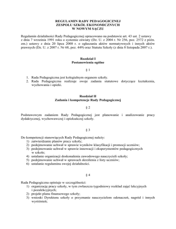 REGULAMIN RADY PEDAGOGICZNEJ ZESPOŁU SZKÓŁ EKONOMICZNYCH W NOWYM SĄCZU Regulamin działalności Rady Pedagogicznej opracowano na podstawie art. 43 ust. 2 ustawy z dnia 7 września 1991 roku o systemie oświaty (Dz. U. z 2004 r. Nr 256, poz. 2572 z późn. zm.) ustawy z dnia 20 lipca 2000 r. o ogłaszaniu aktów normatywnych i innych aktów prawnych (Dz. U. z 2007 r. Nr 68, poz. 449) oraz Statutu Szkoły (z dnia 8 listopada 2007 r.). Rozdział I Postanowienia ogólne §1 1. Rada Pedagogiczna jest kolegialnym organem szkoły. 2. Rada Pedagogiczna realizuje swoje zadania statutowe dotyczące kształcenia, wychowania i opieki. Rozdział II Zadania i kompetencje Rady Pedagogicznej §2 Podstawowym zadaniem Rady Pedagogicznej jest planowanie i analizowanie pracy dydaktycznej, wychowawczej i opiekuńczej szkoły. §3 Do kompetencji stanowiących Rady Pedagogicznej należy: 1) zatwierdzanie planów pracy szkoły; 2) podejmowanie uchwał w sprawie wyników klasyfikacji i promocji uczniów; 3) podejmowanie uchwał w sprawie innowacji i eksperymentów pedagogicznych w szkole; 4) ustalanie organizacji doskonalenia zawodowego nauczycieli szkoły; 5) podejmowanie uchwał w sprawach skreślenia z listy uczniów; 6) ustalanie regulaminu swojej działalności. §4 Rada Pedagogiczna opiniuje w szczególności: 1) organizację pracy szkoły, w tym zwłaszcza tygodniowy rozkład zajęć lekcyjnych i pozalekcyjnych; 2) projekt planu finansowego szkoły; 3) wnioski Dyrektora szkoły o przyznanie nauczycielom odznaczeń, nagród i innych wyróżnień; 4) propozycje Dyrektora szkoły w sprawach przydziału nauczycielom stałych prac i zajęć w ramach wynagrodzenia zasadniczego oraz dodatkowo płatnych zajęć dydaktycznych, wychowawczych i opiekuńczych. §5 Rada Pedagogiczna przygotowuje projekt Statutu Szkoły albo jego zmian. §6 Rada Pedagogiczna może wystąpić z wnioskiem o odwołanie nauczyciela ze stanowiska dyrektora lub z innego stanowiska kierowniczego w szkole. W tym celu Rada Pedagogiczna wyłania jednego przedstawiciela do komisji konkursowej w celu przeprowadzenia konkursu na stanowisko Dyrektora szkoły. §7 Ponadto Rada Pedagogiczna: 1) rozpatruje skierowane do niej wnioski, dotyczące w szczególności organizacji zajęć pozalekcyjnych i przedmiotów nadobowiązkowych; 2) rozpatruje skierowane do niej wnioski Rady Rodziców, dotyczące wszystkich spraw szkoły, 3) rozpatruje skierowane do niej wnioski i opinie samorządu szkolnego dotyczące wszystkich spraw szkoły, a w szczególności realizacji podstawowych praw ucznia; 4) opiniuje zaproponowane przez nauczycieli programy nauczania stanowiące szkolny zestaw programów nauczania; 5) w uzasadnionych przypadkach może dokonać zmiany w szkolnym zestawie programów nauczania; 6) podejmuje uchwałę o promowaniu, bądź niepromowaniu do klasy programowo wyższej lub nieukończeniu szkoły przez ucznia, któremu w danej szkole po raz drugi z rzędu ustalono naganną ocenę klasyfikacyjną zachowania; 7) może wyrazić zgodę na egzamin klasyfikacyjny ucznia niesklasyfikowanego z powodu nieusprawiedliwionej nieobecności; 8) uchwala w porozumieniu z Radą Rodziców program wychowawczy i program profilaktyki szkoły; 9) przedstawia Kuratorowi Oświaty wniosek o przyznanie uczniowi stypendium Ministra do spraw oświaty; 10) zatwierdza kandydatury do wniosku o przyznanie stypendium Prezesa Rady Ministrów; 11) wybiera przedstawiciela do udziału w zespole oceniającym, rozpatrującym odwołanie od oceny nauczyciela; 12) opiniuje wnioski uczniów lub ich prawnych opiekunów (w przypadku uczniów niepełnoletnich) dotyczące zezwolenia na indywidualny program lub tok nauki. Rozdział III Ogólne zasady działania Rady Pedagogicznej §8 1. W skład Rady Pedagogicznej wchodzą Dyrektor szkoły oraz wszyscy nauczyciele zatrudnieni w szkole. 2. Przewodniczącym Rady Pedagogicznej jest Dyrektor szkoły. 3. Członkowie Rady Pedagogicznej tworzą następujące zespoły przedmiotowe: 1) zespół przedmiotów humanistycznych; 2) zespół przedmiotów ścisłych; 3) zespół wychowania fizycznego; 4) zespół przedmiotów zawodowych. 4. Członkowie Rady Pedagogicznej działają również w następujących zespołach: 1) zespół wychowawczy; 2) zespoły ds. pomocy psychologiczno – pedagogicznej; 3) zespoły nauczycieli prowadzących zajęcia w danym oddziale. 5. Spośród członków Rady Pedagogicznej mogą być wybierane doraźne zespoły zadaniowe. §9 1. W zebraniach Rady Pedagogicznej może brać udział przedstawiciel organu sprawującego nadzór pedagogiczny nad Szkołą oraz przedstawiciel organu prowadzącego Szkołę. 2. W zebraniach Rady Pedagogicznej mogą brać udział z głosem doradczym osoby zapraszane przez jej przewodniczącego za zgodą lub na wniosek Rady Pedagogicznej. 3. Osoby, o których mowa w ust. 1-2 uczestniczą w tej części zebrania Rady Pedagogicznej, która dotyczy ich zakresu spraw. 4. Osoby zaproszone, niebędące członkami Rady Pedagogicznej, nie biorą udziału w głosowaniach. §10 1. Zebrania Rady Pedagogicznej odbywają się zgodnie z przyjętym na początku roku szkolnego harmonogramem oraz w miarę bieżących potrzeb. 2. Zebrania plenarne Rady Pedagogicznej organizowane są: 1) przed rozpoczęciem roku szkolnego; 2) w każdym okresie w związku z zatwierdzeniem wyników klasyfikowania promowania uczniów; 3) po zakończeniu pierwszego okresu oraz rocznych zajęć szkolnych w celu przedstawienia przez Dyrektora szkoły ogólnych wniosków wynikających ze sprawowanego nadzoru pedagogicznego oraz informacji o działalności Szkoły; 4) w miarę bieżących potrzeb. 3. Zebrania Rady Pedagogicznej mogą być organizowane również w trybie nadzwyczajnym na wniosek organu sprawującego nadzór pedagogiczny nad Szkołą oraz z inicjatywy: 1) przewodniczącego Rady Pedagogicznej; 2) organu prowadzącego szkołę; 3) co najmniej 1/3 członków Rady Pedagogicznej. 4. Wystąpienia o organizację zebrania Rady Pedagogiczne