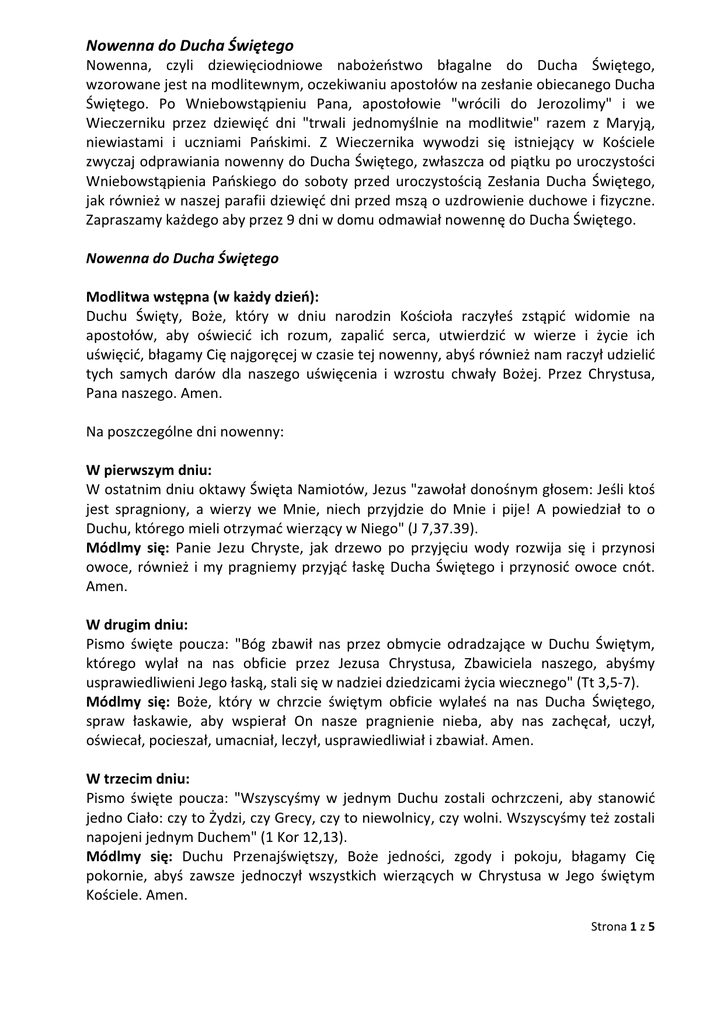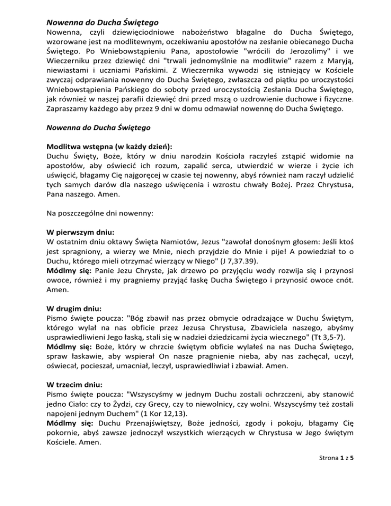 Nowenna do Ducha Świętego Nowenna, czyli dziewięciodniowe nabożeństwo błagalne do Ducha Świętego, wzorowane jest na modlitewnym, oczekiwaniu apostołów na zesłanie obiecanego Ducha Świętego. Po Wniebowstąpieniu Pana, apostołowie "wrócili do Jerozolimy" i we Wieczerniku przez dziewięć dni "trwali jednomyślnie na modlitwie" razem z Maryją, niewiastami i uczniami Pańskimi. Z Wieczernika wywodzi się istniejący w Kościele zwyczaj odprawiania nowenny do Ducha Świętego, zwłaszcza od piątku po uroczystości Wniebowstąpienia Pańskiego do soboty przed uroczystością Zesłania Ducha Świętego, jak również w naszej parafii dziewięć dni przed mszą o uzdrowienie duchowe i fizyczne. Zapraszamy każdego aby przez 9 dni w domu odmawiał nowennę do Ducha Świętego. Nowenna do Ducha Świętego Modlitwa wstępna (w każdy dzień): Duchu Święty, Boże, który w dniu narodzin Kościoła raczyłeś zstąpić widomie na apostołów, aby oświecić ich rozum, zapalić serca, utwierdzić w wierze i życie ich uświęcić, błagamy Cię najgoręcej w czasie tej nowenny, abyś również nam raczył udzielić tych samych darów dla naszego uświęcenia i wzrostu chwały Bożej. Przez Chrystusa, Pana naszego. Amen. Na poszczególne dni nowenny: W pierwszym dniu: W ostatnim dniu oktawy Święta Namiotów, Jezus "zawołał donośnym głosem: Jeśli ktoś jest spragniony, a wierzy we Mnie, niech przyjdzie do Mnie i pije! A powiedział to o Duchu, którego mieli otrzymać wierzący w Niego" (J 7,37.39). Módlmy się: Panie Jezu Chryste, jak drzewo po przyjęciu wody rozwija się i przynosi owoce, również i my pragniemy przyjąć łaskę Ducha Świętego i przynosić owoce cnót. Amen. W drugim dniu: Pismo święte poucza: "Bóg zbawił nas przez obmycie odradzające w Duchu Świętym, którego wylał na nas obficie przez Jezusa Chrystusa, Zbawiciela naszego, abyśmy usprawiedliwieni Jego łaską, stali się w nadziei dziedzicami życia wiecznego" (Tt 3,5-7). Módlmy się: Boże, który w chrzcie świętym obficie wylałeś na nas Ducha Świętego, spraw łaskawie, aby wspierał On nasze pragnienie nieba, aby nas zachęcał, uczył, oświecał, pocieszał, umacniał, leczył, usprawiedliwiał i zbawiał. Amen. W trzecim dniu: Pismo święte poucza: "Wszyscyśmy w jednym Duchu zostali ochrzczeni, aby stanowić jedno Ciało: czy to Żydzi, czy Grecy, czy to niewolnicy, czy wolni. Wszyscyśmy też zostali napojeni jednym Duchem" (1 Kor 12,13). Módlmy się: Duchu Przenajświętszy, Boże jedności, zgody i pokoju, błagamy Cię pokornie, abyś zawsze jednoczył wszystkich wierzących w Chrystusa w Jego świętym Kościele. Amen. Strona 1 z 5 W czwartym dniu: Pismo święte poucza: "Bóg jest tym, który umacnia nas wespół z wami w Chrystusie i który nas namaścił. On też wycisnął na nas pieczęć i zostawił zadatek Ducha w sercach naszych" (2 Kor 1,21-22). Módlmy się: Duchu Święty, dziękujemy Ci za to, że nas opieczętowałeś Bożym podobieństwem, które jest zadatkiem szczęścia wiecznego i wezwaniem do świętości. Amen. W piątym dniu: Pismo święte poucza: "Duch przychodzi z pomocą naszej słabości. Gdy bowiem nie umiemy się modlić tak, jak trzeba, sam Duch przyczynia się za nami w błaganiach, których nie można wyrazić słowami. Ten zaś, który przenika serca, zna zamiar Ducha, wie, że przyczynia się za świętymi zgodnie z wolą Bożą" (Rz 8,26-27). Módlmy się: Panie Jezu Chryste, dzięki mieszkającemu w nas Duchowi Świętemu, modlitwa nasza zdolna jest ujarzmić szatana i pokusy świata, a także zdolna jest wielbić Ciebie wraz z Ojcem i Duchem Świętym. Amen. W szóstym dniu: Pismo święte poucza: "Postępujcie według ducha, a nie spełnicie pożądania ciała. Owocem ducha jest: miłość, radość, pokój, cierpliwość, uprzejmość, dobroć, wierność, łagodność, opanowanie. Mając życie od Ducha, do Ducha się też stosujmy" (Gal 5,16.22.25). Módlmy się: Panie, pomnóż w nas wiarę w Ciebie i zawsze nas oświecaj światłem Ducha Świętego, abyśmy postępowali według ducha i cieszyli się jego owocami. Amen. W siódmym dniu: Pismo święte poucza: "Czyż nie wiecie, że ciało wasze jest świątynią Ducha Świętego, który w was jest, a którego macie od Boga, i że już nie należycie do samych siebie? Za wielką bowiem cenę zostaliście nabyci. Chwalcie więc Boga w waszym ciele" (1 Kor 6,1920). Módlmy się: Boże, dopóki żyjemy w ciele, walczymy ze złem, spraw przeto, abyśmy umieli opanować wszelkie pokusy i popędy przy pomocy mieszkającego w nas Ducha Świętego, abyśmy żyli wiecznie. Amen. W ósmym dniu: Pismo święte poucza: "Ani oko nie widziało, ani ucho nie słyszało, ani serce człowieka nie zdołało pojąć. jak wielkie rzeczy przygotował Bóg tym, którzy Go miłują. Nam zaś objawił to Bóg przez Ducha - Duch przenika wszystko, nawet głębokości Boga samego" (1 Kor 2,919). Módlmy się: Przybądź, Duchu Święty, napełnij serca Twoich wiernych i zapal w nich ogień Twojej miłości, abyśmy miłowali Boga całym sercem i otrzymali wieczne szczęście. Amen. Strona 2 z 5 W dziewiątym dniu: Pismo święte poucza: "Kiedy nadszedł dzień Pięćdziesiątnicy, znajdowali się wszyscy razem na tym samym miejscu. Nagle dał się słyszeć z nieba szum, jakby uderzenie gwałtownego wichru, i napełnił cały dom, w którym przebywali. Ukazały się im też języki jakby z ognia, które się rozdzieliły, i na każdym z nich spoczął jeden. I wszyscy zostali napełnieni Duchem Świętym, i zaczęli mówić obcymi językami, tak jak im Duch pozwalał mówić (Dz 2,1-4). Módlmy się: Duchu Święty, który sprawiłeś, że apostołowie mówili różnymi językami, spraw abyśmy w życiu chrześcijańskim potrafili mówić językiem słów, językiem czynów, językiem przykładu i wszystkimi możliwymi językami dla pomnożenia chwały Bożej. Amen. W każdym dniu odmawiamy: Modlitwa za kapła