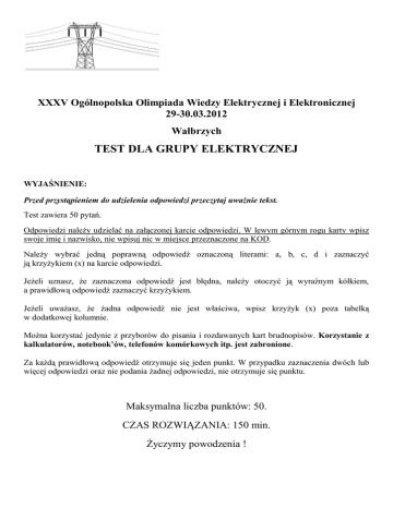 XXXV Ogólnopolska Olimpiada Wiedzy Elektrycznej i Elektronicznej 29-30.03.2012 Wałbrzych TEST DLA GRUPY ELEKTRYCZNEJ WYJAŚNIENIE: Przed przystąpieniem do udzielenia odpowiedzi przeczytaj uważnie tekst. Test zawiera 50 pytań. Odpowiedzi należy udzielać na załączonej karcie odpowiedzi. W lewym górnym rogu karty wpisz swoje imię i nazwisko, nie wpisuj nic w miejsce przeznaczone na KOD. Należy wybrać jedną poprawną odpowiedź oznaczoną literami: a, b, c, d i zaznaczyć ją krzyżykiem (x) na karcie odpowiedzi. Jeżeli uznasz, że zaznaczona odpowiedź jest błędna, należy otoczyć ją wyraźnym kółkiem, a prawidłową odpowiedź zaznaczyć krzyżykiem. Jeżeli uważasz, że żadna odpowiedź nie jest właściwa, wpisz krzyżyk (x) poza tabelką w dodatkowej kolumnie. Można korzystać jedynie z przyborów do pisania i rozdawanych kart brudnopisów. Korzystanie z kalkulatorów, notebook’ów, telefonów komórkowych itp. jest zabronione. Za każdą prawidłową odpowiedź otrzymuje się jeden punkt. W przypadku zaznaczenia dwóch lub więcej odpowiedzi oraz nie podania żadnej odpowiedzi, nie otrzymuje się punktu. Maksymalna liczba punktów: 50. CZAS ROZWIĄZANIA: 150 min. Życzymy powodzenia ! XXXV Ogólnopolska Olimpiada Wiedzy Elektrycznej i Elektronicznej – Wałbrzych 2012. Test dla grupy elektrycznej. 1 Z a d a n i e 1.. Rezystancja R1 ma wartość 6 Ω. Wyznaczyć wartość rezystancji RX, przy której rezystancja zastępcza połączenia z rysunku wynosi 16 Ω. a) 7 Ω b) 8 Ω c) 10 Ω d) 12 Ω (X) 1Z a d a n i e 2.. Wyznaczyć wartości rezystancji R1, R2, R3 , jeżeli przy otwartym wyłączniku w, wskazania przyrządów są następujące: V1 = 10 V, A1 = 0 A, A2 = 2 A; natomiast przy zamkniętym wyłączniku w: V1 = 0 V, A1 = 2 A, A2 = 2 A. a) b) c) d) R1 = 2 Ω , R2 = 5 Ω, R3 = 2 Ω R1 = 5 Ω , R2 = 5 Ω, R3 = 0 Ω (X) R1 = 5 Ω , R2 = 3 Ω, R3 = 2 Ω R1 = 4 Ω , R2 = 4 Ω, R3 = 1 Ω 1Z a d a n i e 3.. Jaką wartość wskazuje watomierz w obwodzie stałoprądowym, jeżeli dane są następujące: E1 = 20 V, E2 = 5 V, = a) b) c) d) Ω, L = 1 H, C = 2 F. 20 W 30 W 50 W żadna z powyższych odpowiedzi (X) 1Z a d a n i e 4.. Przy otwartym wyłączniku „w”, amperomierz A4 wskazuje wartość równą 8 A. Ile wskaże amperomierz po zamknięciu wyłącznika. a) b) c) d) 6A 8A 9 A (X) 12 A 1Z a d a n i e 5.. Która z poniższych odpowiedzi zawiera prawidłowo ułożoną kolejność (od najwyższej do najniższej) przewodności właściwej pierwiastków: a) b) c) d) tytan, srebro, miedź, złoto srebro, miedź, złoto, wolfram (X) złoto, miedź, srebro, ołów miedź, złoto, srebro, glin 2 XXXV Ogólnopolska Olimpiada Wiedzy Elektrycznej i Elektronicznej – Wałbrzych 2012. Test dla grupy elektrycznej. Z a d a n i e 6.. Wyznaczyć rezystancję zastępczą Rab dwójnika ze źródłami sterowanymi. Dane: e1 = ρ I2 [V], e2 = ρ I1 [V], ρ = 2 Ω, R1 = 0,2 Ω, R2 = 5 Ω. a) b) c) d) Rab = 1 Ω (X) Rab = 10 Ω Rab = – 0,6 Ω Rab = 4 Ω 1Z a d a n i e 7.. W poniższym układzie: E = 12 V, R = 3 Ω. Wskazania przyrządów wynoszą: a) b) c) d) 4 A, 12 V, 12 V 12 A, 0 V, 0 V 4 A, 0 V, 0 V (X) 12 A, 12 V, 12 V 1Z a d a n i e 8.. Przez sztabkę złota w kształcie prostopadłościanu, płynie prąd stały o gęstości powierzchniowej = 100 A m w kierunku równoległym do boku c prostopadłościanu. Ile ciepła wydzieli się wewnątrz sztabki w czasie równym 60 minut. Wymiary sztabki a = 250 mm, b = 400 mm, c = 440 mm, a przewodność właściwa złota wynosi 44 ∙ 10 a) 3,6 J b) 360 mJ Ωm . c) 360 MJ d) 36 mJ (X) 1Z a d a n i e 9.. Pomiędzy końcami przewodu o długości d, i promieniu r, przez czas równy T1, przyłożone było napięcie, co spowodowało, że wydzieliła się (w przewodzie) pewna ilość energii. Czy energia, która wydzieli się po przyłożeniu tego samego napięcia na czas równy do końców przewodu o zmienionych gabarytach (jak na rysunku): a) b) c) d) wzrośnie zmaleje dwukrotnie zmaleje trzykrotnie nie zmieni się (X) 1Z a d a n i e 10.. Przy jakiej wartości rezystancji R2, szybkość z jaką wydziela się energia cieplna (w elemencie R2), ma wartość maksymalną, jeżeli dane są: E, RW, R1. a) R2 = RW + R1 (X) b) R2 = 2RW – R1 c) R2 = RW d) = W 1 3 XXXV Ogólnopolska Olimpiada Wiedzy Elektrycznej i Elektronicznej – Wałbrzych 2012. Test dla grupy elektrycznej. 1Z a d a n i e 11.. Pojemność zastępcza poniższego połączenia wynosi 1,5 µF. Ile wynosi C1, jeżeli C2 = 1,2 µF, C3 = 1,02 µF. a) b) c) d) 900 µF 600 µF 800 nF (X) żadna z powyższych odpowiedzi 1Z a d a n i e 12.. W odległości d znajdują się dwa ładunki różnoimienne. Ile wynosi wartość ładunku Q2, jeżeli kierunek wektora natężenia pola elektrostatycznego E, jest równoległy do osi x. a) =− √ b) =− √ c) = −√2 d) =− (X) 1Z a d a n i e 13.. Elektron mający pewną prędkość, znalazł się wewnątrz pustej, naładowanej powierzchniowo ładunkiem ujemnym kuli. Wewnątrz kuli, elektron porusza się ruchem: a) b) c) d) jednostajnie przyspieszonym jednostajnie opóźnionym jednostajnym (X) jednostajnie opóźnionym przez czas t, następnie ruchem jednostajnie przyspieszonym 1Z a d a n i e 14.. W nieskończenie długim przewodzie płynie prąd o natężeniu I1 A. W odległości x1 metrów od przewodu, znajduje się środek kuli o promieniu R. Ile wynosi strumień indukcji pola magnetycznego przez powierzchnię kuli, jeżeli ośrodkiem jest próżnia o przenikalności bezwzględnej równej µ0. ⁄ Wb a) B = 4 ⁄ Wb b) B = 2 c) B = 0 Wb (X) d) żadna z powyższych odpowiedzi 1Z a d a n i e 15.. W nieskończenie długim przewodzie o promieniu R = 4 m, gęstość prądu nie jest stała (rysunek) i wynosi = 2 m w wewnętrznej = 1 m . Ile wynosi natężenie pola magnetycznego części przekroju oraz wzdłuż okręgu (współśrodkowego z osią przewodu) o promieniu a) =1 m b) =2 m (X) c) =3 m d) =2 . m 4 XXXV Ogólnopolska Olimpiada Wiedzy Elektry