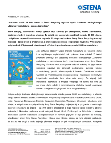 Warszawa, 14 lipca 2014 r. Uczniowie ocalili 28 000 drzew! – Stena Recycling ogłasza wyniki konkursu ekologicznego „Zbieramy makulaturę – oszczędzamy lasy” Stare zeszyty, czasopisma mamy, gazety taty, kartony po przesyłkach, ulotki, zaproszenia, papierowe torby i instrukcje obsługi. To dzięki nim uczniowie zapobiegli ścięciu 28 000 drzew, i dzięki nim zapewnili sobie cenne nagrody! Ekologiczny konkurs firmy Stena Recycling nauczył młodzież i dzieci troski o środowisko, a przy okazji planowania i logicznego myślenia. W konkursie wzięło udział 576 placówek oświatowych z Polski. Łącznie zebrano prawie 2000 ton makulatury. Jak sortować odpady? Gdzie znaleźć makulaturę we własnym domu i w najbliższym sąsiedztwie? Jak pokonać inne szkoły? Z takimi pytaniami zmierzyli się uczestnicy konkursu ekologicznego „Zbieramy makulaturę – oszczędzamy lasy”, organizowanego przez firmę Stena Recycling. Konkurs trwał przez prawie cały rok szkolny. W jego trakcie uczniowie nauczyli się sortować podstawowe surowce wtórne – makulaturę, puszki, elektroodpady i baterie. Dodatkowo musieli wykazać się rywalizacją oraz pracą zespołową – nagradzani byli nie tylko indywidualni uczniowie, lecz także całe szkoły. Co więcej, jeśli makulatura pochodziła z miejsca odległego od szkoły lub było jej po prostu dużo, młodzi i przedsiębiorczy ekolodzy musieli opanować również umiejętności logistyczne! Jakie osiągnęli efekty? Kolejna edycja konkursu ekologicznego zaowocowała zbiórką prawie 2000 ton makulatury, w efekcie czego dzieci i młodzież ocaliły 28 000 drzew! W rywalizacji wzięło udział 576 szkół i przedszkoli z Gdyni, Łodzi, Rzeszowa, Siemianowic Śląskich, Szczecina, Swarzędza, Warszawy, Wrocławia i ich okolic, czyli miejsc, w których mieszczą się oddziały firmy Stena Recycling. Najaktywniej w programie uczestniczyły placówki oświatowe ze Śląska – aż 300 szkół i przedszkoli z tego regionu wzięło udział w zbiórce makulatury! Natomiast najlepszy wynik osiągnął Zespół Szkół Publicznych w Szlachcie, z którego dwudziestu uczniów najbardziej zaangażowanych w konkurs popłynie w rejs promem do Szwecji, ufundowany przez firmy Stena Recycling i Stena Line. Szkole należą się tym większe gratulacje, że już po raz drugi z rzędu zajmuje pierwsze miejsce w tych ekologicznych zawodach. Kategorię STENA RECYCLING Sp. z o.o. ul. Ogrodowa 58, 00-876 Warszawa SIEDZIBA BIURA GŁÓWNEGO: Al. Krakowska 271, 02-133 Warszawa Tel. +48 22 520 27 00 Fax: +48 22 520 27 01 [email protected] www.stenarecycling.pl NIP 527-23-46-985, KRS pod nr 0000027111 Sąd Rejonowy dla m. st. Warszawy, XII Wydział Gospodarczy Wysokość kapitału zakładowego 8 000 000,00 PLN Konto bankowe: Svenska Handelsbanken AB S.A. PL 84 2250 0001 0000 0040 0053 1251 dodatkową konkursu stanowiła zbiórka zużytego sprzętu elektrycznego i elektronicznego. W ramach akcji można było oddawać także puszki i baterie. Dodatkowo zbiórka makulatury oraz innych surowców zasiliła budżety szkół, ponieważ organizator oprócz bezpłatnego obioru zbieranych materiałów przewidział za nie wynagrodzenie. – Współczesna szkoła coraz większy nacisk kładzie na praktyczny aspekt nauczania. Uczniowie poznają podstawy ekonomii, a w gimnazjum realizują nawet własne projekty. Jednak cóż jest bardziej praktycznego od ochrony środowiska, czyli zapewnienia sobie przyszłości w czystym i prawidłowo funkcjonującym ekosystemie? Właśnie ten obszar najbliższy jest firmie Stena Recyling, która specjalizuje się w efektywnych i innowacyjnych rozwiązaniach w dziedzinie gospodarowania surowcami wtórnymi. Nie chcemy ograniczać się tylko do działalności biznesowej, stawiamy również na edukację społeczeństwa, aby przybliżyć mu skandynawski model odpowiedzialności za własne otoczenie. Taką naukę najlepiej rozpocząć od najmłodszych lat, przez zabawę i to, co budzi emocje wśród młodzieży, czyli rywalizację. Dlatego już od kilku lat organizujemy konkursy ekologiczne i zamierzamy kontynuować podobne akcje edukacyjne – mówi Anna Nowakowska, Dyrektor ds. Marketingu i Sprzedaży Stena Recycling. Stena Recycling powstała ponad siedemdziesiąt lat temu. Zgodnie ze szwedzkim modelem, firma zajmuje się odzyskiem surowców i energii oraz końcowym usunięciem odpadów, czyli zdeponowaniem ich na składowisku. Misją Steny Recycling jest ochrona środowiska poprzez efektywny recycling zgodny z najwyższymi standardami, którą realizuje poprzez sieć zakładów recyklingu w całej Europie, w tym 20 obiektów w Polsce oraz edukację społeczeństwa. W ramach szybkiej powtórki z zasad recyklingu, jak za szkolnych czasów, Stena Recycling zachęca do pobrania e-booka „Jak sortować, żeby nie zwariować” dostępnego na http://stenaekostacja.pl/e-book-jak-sortowac-zeby-nie-zwariowac/ lub http://czterykaty.pl/czterykaty/0,136087.html. Dodatkowe informacje: Ewelina Ciuchta, [email protected], 508 338 267 Karolina Wierzbowska, [email protected] *** O Stena Recycling: STENA RECYCLING Sp. z o.o. ul. Ogrodowa 58, 00-876 Warszawa SIEDZIBA BIURA GŁÓWNEGO: Al. Krakowska 271, 02-133 Warszawa Tel. +48 22 520 27 00 Fax: +48 22 520 27 01 [email protected] www.stenarecycling.pl NIP 527-23-46-985, KRS pod nr 0000027111 Sąd Rejonowy dla m. st. Warszawy, XII Wydział Gospodarczy Wysokość kapitału zakładowego 8 000 000,00 PLN Konto bankowe: Svenska Handelsbanken AB S.A. PL 84 2250 0001 0000 0040 0053 1251 stronach: Stena Recycling działająca w strukturze Stena Recycling International, należy do Stena Metall Group, wiodącej międzynarodowej firmy oferującej kompleksowe rozwiązania w zakresie zarządzania odpadami, recyklingu oraz usług środowiskowych. Stena odzyskuje i przetwarza wszystkie rodzaje odpadów: makulaturę, plastik, złom metali żelaznych i nieżelaznych oraz odpady niebezpieczne. Jest europejskim liderem w dziedzinie prz