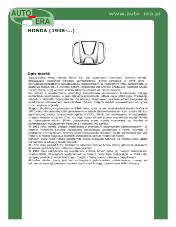 www.auto - era.pl HONDA (1948-...) Opis marki: Założycielem firmy Honda Motor Co. był uzdolniony mechanik Soichiro Honda, prowadzący wcześniej warsztat samochodowy. Firma powstała w 1948 roku i zatrudniała początkowo kilkudziesięciu pracowników. W następnym roku opracowano tu prototyp motocykla, a wkrótce potem rozpoczęto ich seryjną produkcję. Nastąpił szybki rozwój firmy, a jej wyroby szybko zdobyły uznanie na całym świecie. Po decyzji o uruchomieniu produkcji samochodów opracowano konstrukcję małego samochodu sportowego, a jego oficjalna prezentacja odbyła się w 1962 roku. Produkcja modelu S 360/500 rozpoczęła się rok później. Stopniowo i systematycznie zwiększał się asortyment oferowanych samochodów. Oprócz małych modeli wprowadzano na rynek coraz większe pojazdy. Eksport do Europy rozpoczęto w 1966 roku, a na rynek amerykański Honda trafiła w 1970 roku. Na potrzeby USA opracowano w latach siedemdziesiątych tzw. czysty silnik o ograniczonej emisji toksycznych spalin (CCVT). Silnik ten montowano w najbardziej znanym modelu o nazwie Civic. Od tego czasu silnym atutem wszystkich modeli Hondy są nowoczesne silniki. Silniki opracowane przez Hondę stosowane są również w samochodach wyścigowych Formuły 1 (Williams, Mc Laren). W 1981 roku Honda podjęła współpracę z brytyjskim przemysłem samochodowym. W ramach koncernu Leyland rozpoczęto początkowo współpracę z firmą Triumph, a następnie z firmą Rover. W brytyjskiej miejscowości Swindon działa europejska fabryka Hondy, w której powstają niektóre europejskie wersje modeli tej marki. Końcem 1982 roku Honda uruchomiła swoją pierwszą fabrykę na terenie USA, gdzie rozpoczęto produkcję model Accord. W 1986 roku zarząd firmy postanowił utworzyć markę Acura, której głównym obszarem działania jest kontynent północno-amerykański. W 1994 roku zakończyła się współpraca z firmą Rover, gdyż jej nowym właścicielem zostało BMW. Znaczącym wydarzeniem w historii firmy było rozpoczęcie w 1999 roku seryjnej produkcji samochodu typu Insight z hybrydowym układem napędowym. Aktualna oferta Hondy jest bardzo bogata i jednocześnie zróżnicowana z uwagi na odmienne wymogi głównych rynków zbytu czyli Europy, Japonii oraz USA i Kanady.