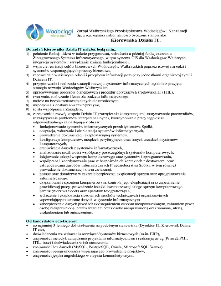 Zarząd Wałbrzyskiego Przedsiębiorstwa Wodociągów i Kanalizacji Sp. z o.o. ogłasza nabór na nowo tworzone stanowisko Kierownika Działu IT. Do zadań Kierownika Działu IT należeć będą m.in.: 1) pełnienie funkcji lidera w trakcie przygotowań, wdrożenia a później funkcjonowania Zintegrowanego Systemu Informatycznego, w tym systemu GIS dla Wodociągów Wałbrzych, integracja systemów i zarządzanie zmianą funkcjonalności, 2) wsparcie realizacji celów biznesowych Wodociągów Wałbrzyskich poprzez rozwój narzędzi i systemów wspomagających procesy biznesowe, 3) zapewnienie właściwych relacji i przepływu informacji pomiędzy jednostkami organizacyjnymi i Działem IT, 4) przygotowanie i realizacja strategii rozwoju systemów informatycznych zgodnie z przyjętą strategia rozwoju Wodociągów Wałbrzyskich, 5) opracowywanie procesów biznesowych i procedur dotyczących środowiska IT (ITIL), 6) tworzenie, rozliczanie i kontrola budżetu informatycznego, 7) nadzór na bezpieczeństwem danych elektronicznych, 8) współpraca z dostawcami zewnętrznymi, 9) ścisła współpraca z Zarządem, 10) zarządzanie i rozwój zespołu Działu IT (zarządzanie kompetencjami, motywowanie pracowników, rozwiązywania problemów interpersonalnych), koordynowanie pracy tego działu odpowiedzialnego za następujący obszar: funkcjonowanie systemów informatycznych przedsiębiorstwa Spółki, adaptacja, wdrażanie i eksploatacja systemów informatycznych, prowadzenie dokumentacji eksploatacyjnej systemów, konfiguracja komputerów, urządzeń peryferyjnych oraz innych urządzeń i systemów komputerowych, archiwizacja danych z systemów informatycznych, analizowanie możliwości współpracy poszczególnych systemów komputerowych, inicjowanie zakupów sprzętu komputerowego oraz systemów i oprogramowania, współpraca i koordynowanie prac w bezpośrednich kontaktach z dostawcami oraz usługodawcami zasobów informatycznych Przedsiębiorstwa Spółki, w tym również prowadzenie dokumentacji z tym związanej, pomoc oraz doradztwo w zakresie bezpiecznej eksploatacji sprzętu oraz oprogramowania informatycznego, dysponowanie sprzętem komputerowym, kontrola jego eksploatacji oraz zapewnienie prawidłowej pracy, prowadzenie książki inwentarzowej całego sprzętu komputerowego przedsiębiorstwa Spółki oraz aparatów fotograficznych, wdrożenie i eksploatacja stosownych środków technicznych i organizacyjnych zapewniających ochronę danych w systemie informatycznym, zabezpieczenie danych przed ich udostępnieniem osobom nieupoważnionym, zabraniem przez osobę nieuprawnioną, przetwarzaniem przez osobę nieuprawnioną oraz zamianą, utratą, uszkodzeniem lub zniszczeniem. Od kandydatów oczekujemy: co najmniej 3-letniego doświadczenia na podobnym stanowisku (Dyrektor IT, Kierownik Działu IT etc), doświadczenia we wdrażaniu rozwiązań/systemów biznesowych (m.in. ERP), znajomości metodyk zarządzania projektami informatycznymi i realizacją usług (Prince2,PMI, ITIL, inne) i doświadczenia w ich stosowaniu, znajomości baz danych (MySQL, PostgreSQL, Oracle, Microsoft SQL Serwer), znajomości oprogramowania wspierającego prowadzenie projektów, znajomości języka angielskiego w stopniu komunikatywnym, potwierdzonych doświadczeniem umiejętności budowania i rozwijania efektywnych w działaniu zespołów specjalistów, samodzielności w działaniu i gotowości do wzięcia odpowiedzialności za funkcjonowanie powierzonego obszaru działalności, umiejętności prowadzenia szkoleń, w tym z zakresu projektów, wykształcenia wyższego o profilu informatycznym lub pokrewnym. Wybranemu kandydatowi oferujemy: dużą samodzielność działania, realny wpływ na rozwój i zmiany w organizacji, konkurencyjne warunki zatrudnienia pracę w stabilnej firmie z wieloletnimi tradycjami. Wymagane dokumenty, jakie należy złożyć w ofercie: 1) życiorys z przebiegiem pracy zawodowej, zawierający w szczególności informację o stażu pracy, a także kontakt telefoniczny i e-mailowy, 2) list motywacyjny, 3) referencje (jeżeli kandydat posiada), 4) oświadczenie o treści: „Wyrażam zgodę na przetwarzanie przez Wałbrzyskie Przedsiębiorstwo Wodociągów i Kanalizacji Spółka z o.o. moich danych osobowych dla potrzeb obecnego jak i przyszłych procesów rekrutacji, zgodnie z ustawą o ochronie danych osobowych (Dz.U.2016.922 – t.j. z późniejszymi zmianami). W razie rezygnacji z dalszego udziału w procesie rekrutacji mam prawo złożyć żądanie usunięcia swoich danych osobowych, co nastąpi niezwłoczne po moim zgłoszeniu. Mam świadomość, że podanie danych w zakresie określonym postanowieniami ustawy z dnia 26 czerwca 1974 r. Kodeks pracy (Dz. U. z 1998 r. Nr 21, poz. 94 z późn. zm.) oraz aktów wykonawczych jest obowiązkowe. Podanie dodatkowych danych osobowych jest dobrowolne i następuje na podstawie niniejszej zgody.” . Termin i miejsce składania dokumentów: Oferty należy składać w zamkniętych kopertach z podanym adresem zwrotnym w terminie do 30.09.2016 r. na adres: Wałbrzyskie Przedsiębiorstwo Wodociągów i Kanalizacji Sp. z o.o., 58-300 Wałbrzych, Aleja Wyzwolenia 39. z dopiskiem: ”Nabór na stanowisko Kierownika Działu IT”. Sekretariat przedsiębiorstwa czynny jest w godzinach 7.00 - 15.00. Postanowienia końcowe: 1. Zastrzegamy sobie prawo do kontaktu z wybranymi kandydatami. 2. Administratorem danych kandydatów jest Wałbrzyskie Przedsiębiorstwo Wodociągów i Kanalizacji Spółka z o.o., Al. Wyzwolenia 39, 58-300 Wałbrzych. Dane są zbierane dla potrzeb obecnego jak i przyszłych procesów rekrutacji. Kandydat ma prawo dostępu do treści swoich danych oraz ich poprawiania. Podanie danych w zakresie określonym postanowieniami ustawy z dnia 26 czerwca 1974 r. Kodeks pracy (Dz. U. z 1998 r. Nr 21, poz. 94 z późn. zm.) oraz aktów wykonawczych jest obowiązkowe. Podanie dodatkowych danych osobowych jest dobrowolne i następuje na podstawie zgo