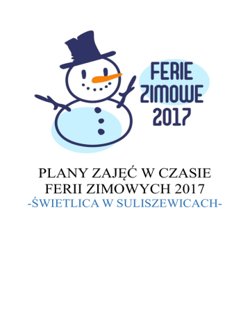 PLANY ZAJĘĆ W CZASIE FERII ZIMOWYCH 2017 -ŚWIETLICA W SULISZEWICACH- PLAN PRACY NA FERIE ZIMOWE 13.02.2017 –26 .02.2017r. ŚWIETLICA SULISZEWICE Świetlica wiejska otwarta od poniedziałku do piątku od 12.00 do 17.00 13.02.2017r. Bezpieczne ferie zimowe – omówienie zasad bezpieczeństwa podczas ferii zimowych; Wyświetlenie bajek dla dzieci; Zajęcia plastyczne – „Zimowy pejzaż”; Gry komputerowe; Gry planszowe; Tenis stołowy. 14.02.2017r. Wyjazd do Łobeskiego Domu Kultury na teatrzyk pt. „Złota kaczka” 15.02.2017r. Zajęcia plastyczne – „Co zapamiętałem/am z przedstawienia „Złota kaczka”; Zabawy na śniegu – „Z górki na pazurki” ( w zależności od pogody); Gry komputerowe; Gry stolikowe; Tenis stołowy. 16.02.2017r. Zajęcia plastyczno – techniczne – „Maski karnawałowe” Zajęcia muzyczne – karaoke, Wyświetlenie bajek i filmów dla dzieci. Gry planszowe, układanie puzzli Tenis stołowy 17.02.2017r. Bal przebierańców - zabawa przy muzyce, konkursy, w tym konkurs na najpiękniejszy strój, słodki poczęstunek. 20.02.2017r. Wyświetlanie bajek i filmów dla dzieci i młodzieży; Zajęcia plastyczno – techniczne – koszyczki z masy solnej Gry komputerowe; Gry planszowe; Kolorowanki. 21.02.2017r. Wyjazd do Łobeskiego Domu kultury na „Iluzjonistę” 22.02.2017r. Wyjazd na teatrzyk do Łobeskiego Domu kultury pt. „Rubinowy książę” 23.02.2017r. Zajęcia plastyczne – „Rubinowy książę”; Zabawy na świeżym powietrzu ( w zależności od pogody); Wyświetlanie bajek i filmów dla dzieci i młodzieży; Origami twórcze – „Przebiśnieg” ; Tenis stołowy. 24.02.2017r. Zakończenie ferii zimowych – ognisko, kiełbaski Pogadanka na temat „ Jak spędziłem ferie zimowe”. Gry komputerowe; Gry planszowe; Kolorowanki. Opracowała: Agnieszka Karolkowska