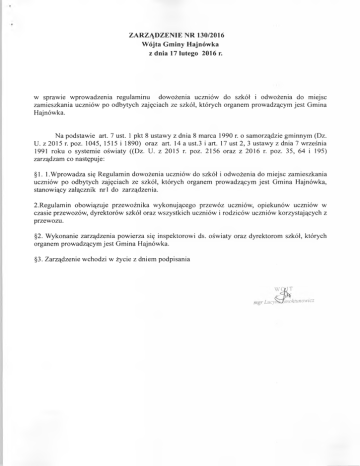 ZARZĄDZENIE NR 130/2016 Wójta Gminy Hajnówka z dnia 17 lutego 2016 r. w sprawie wprowadzenia regulaminu dowożenia uczniów do szkół i odwożenia do miejsc zamieszkania uczniów po odbytych zajęciach ze szkół, których organem prowadzącym jest Gmina Hajnówka. Na podstawie art. 7 ust. 1 pkt 8 ustawy z dnia 8 marca 1990 r. o samorządzie gminnym (Dz. U. z 2015 r. poz. 1045, 1515 i 1890) oraz art. 14 a ust.3 i art. 17 ust 2, 3 ustawy z dnia 7 września 1991 roku o systemie oświaty ((Dz. U. z 2015 r. poz. 2156 oraz z 2016 r. poz. 35, 64 i 195) zarządzam co następuje: §1. 1.Wprowadza się Regulamin dowożenia uczniów do szkół i odwożenia do miejsc zamieszkania uczniów po odbytych zajęciach ze szkół, których organem prowadzącym jest Gmina Hajnówka, stanowiący załącznik nrl do zarządzenia. 2.Regulamin obowiązuje przewoźnika wykonującego przewóz uczniów, opiekunów uczniów w czasie przewozów, dyrektorów szkół oraz wszystkich uczniów i rodziców uczniów korzystających z przewozu. §2. Wykonanie zarządzenia powierza się inspektorowi ds. oświaty oraz dyrektorom szkół, których organem prowadzącym jest Gmina Hajnówka. §3. Zarządzenie wchodzi w życie z dniem podpisania Załącznik nr 1 do Zarządzenia Nr 130/2016 Wójta Gminy Hajnówka z dnia 17.02. 2016 r. Regulamin dowożenia uczniów do szkół i odwożenia do miejsc zamieszkania uczniów po odbytych zajęciach ze szkół, których organem prowadzącym jest Gmina Hajnówka §1 Przepisy ogólne 1. Organizatorem przewozu uczniów jest Gmina Hajnówka. 2. Uczniowie dowożeni są do szkół autobusami przewoźnika wyłonionego zgodnie z ustawą „Prawo zamówień publicznych”. 3. Dowozem objęci są uczniowie, których droga z domu do szkoły, w której obwodzie dziecko mieszka, przekracza: 1) 3 km - w przypadku dzieci objętych rocznym, obowiązkowym wychowaniem przedszkolnym oraz uczniów klas I-IV szkół podstawowych, 2) 4 km - w przypadku uczniów klas V i VI szkół podstawowych oraz uczniów gimnazjum 3) gmina może zagwarantować bezpłatny transport oraz zapewnić opiekę w czasie przewozu także dla tych uczniów i dzieci, dla których odległość między szkołą, a domem jest mniejsza. 4. Gmina może zorganizować dzieciom bezpłatny transport i opiekę w czasie przewozu do przedszkola lub innej formy wychowania przedszkolnego również w przypadkach, w których nie ma takiego obowiązku. 5. Dzieci posiadające orzeczenie o niepełnosprawności mogą być dowożone środkiem transportu, który zapewni gmina. 6. Listy uczniów korzystających z przewozów ustala dyrektor szkoły w terminie do dnia 1 września każdego roku i przekazuje organizatorowi dowozu oraz przewoźnikowi. 7. Organizator przewozu współdziała z przewoźnikiem i dyrektorami szkół, których organem prowadzącym jest Gmina Hajnówka. 8. Organizator przewozu określa w planie dowożenia i odwożenia przystanki dla autobusów szkolnych. Godziny przyjazdów i odjazdów autobusów z przewoźnikiem ustalają dyrektorzy szkół po uzgodnieniu z organizatorem przewozów. O godzinie przyjazdów i odjazdów autobusów z wyznaczonych przystanków informuje uczniów dyrektor szkoły. Ustalone godziny zatrzymywania się autobusów na przystankach mogą ulegać zmianie, z powodu zmieniających się warunków atmosferycznych, różnych nieprzewidzianych sytuacji panującej w czasie przewozu w ruchu drogowym oraz zmieniającej się liczby wsiadających i wysiadających uczniów. 9. W przypadku opóźnienia autobusu uczniowie czekają na przystanku 25 min, po czym wracają do domów. 10. W przypadku wyjątkowo trudnych warunków drogowych zagrażających bezpieczeństwu uczestników dowozu, gmina może odwołać kurs zawiadamiając o powyższym dyrektora szkoły. 11. Dyrektor szkoły z co najmniej tygodniowym wyprzedzeniem informuje przewoźnika o planowanych zmianach w terminach dowożenia i odwożenia uczniów związanych ze zmianą organizacji nauki, po uzgodnieniu z dyrektorem drugiej szkoły, jeżeli uczniowie przewożeni są tym samym autobusem. 12. Z przewozu może korzystać każdy uczeń, który znajduje się na liście uczniów dowożonych. 13. Kontrole nad dowozami sprawuje organizator dowożenia uczniów do szkół oraz dyrektorzy szkół. 14. Obowiązkiem dyrektorów szkół jest zapoznanie uczniów i ich rodziców/opiekunów prawnych z treścią niniejszego regulaminu. 15. Dyrektorzy szkół „Regulamin dowożenia uczniów do szkół i odwożenia do miejsc zamieszkania uczniów po odbytych zajęciach ze szkół, których organem prowadzącym jest Gmina Hajnówka” umieszczą na tablicy ogłoszeń w szkole oraz na stronie internetowej. §2 Obowiązki przewoźnika Obowiązkiem przewoźnika jest: 1) terminowy dowóz uczniów do szkół, 2) dowożenie uczniów autobusami wyłącznie sprawnymi technicznie, posiadającymi aktualne badania techniczne, dostosowanymi do ilości przewożonych dzieci - ilość przewożonych osób nie może być większa niż określona w dowodzie rejestracyjnym pojazdu, 3) właściwe oznakowanie pojazdu zgodne z przepisami prawa ruchu drogowego, 4) posiadanie aktualnego ubezpieczenia OC oraz NW na wszystkie autobusy służące do przewozu dzieci, 5) zapewnienie miejsc siedzących dla wszystkich uczniów i opiekunów, 6) w przypadku awarii autobusu zapewnienie pojazdu zastępczego, spełniającego warunki określone w powyższych punktach, 7) zapoznanie z treścią niniejszego regulaminu kierowców i opiekunek dzieci i młodzieży. §3 Obowiązki kierowców autobusów szkolnych w trakcie dowożenia i odwożenia uczniów 1. Kierowca autobusu współpracuje z opiekunem zapewniając uczniom bezpieczeństwo w trakcie jazdy i na postoju. 2. Wspólnie z opiekunem może zastosować wobec uczniów środki wychowawcze wyłącznie w niezbędnym zakresie w sposób, który nie narusza ich godności osobistej. O zaistniałym zdarzeniu informować dyrektora szkoły. 3. W przypadku awarii kierowca informuj