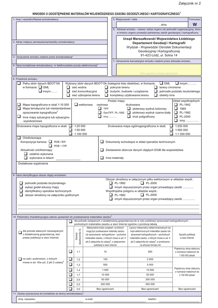 Załącznik nr 2 :1,26(.28'267Ċ31,(1,(0$7(5,$áÐ::2-(:Ð'=.,(*2=$62%8*(2'(=<-1(*2,.$572*5$),&=1(*2 1. ImiĊ i nazwisko/Nazwa wnioskodawcy 5. MiejscowoĞü i data Formularz W , dnia 6. Adresat wniosku - nazwa i adres organu lub jednostki organizacyjnej, która w imieniu organu prowadzi paĔstwowy zasób geodezyjny i kartograficzny Urząd Marszałkowski Województwa Łódzkiego Departament Geodezji i Kartografii Wydział - Wojewódzki OĞrodek Dokumentacji Geodezyjnej i Kartograficznej 91-423 ŁódĨ, ul. Solna 14 2. Adres miejsca zamieszkania/siedziby wnioskodawcy 3. Oznaczenie wniosku nadane przez wnioskodawcĊ* 7. Oznaczenie kancelaryjne wniosku nadane przez adresata wniosku 4. Dane kontaktowe wnioskodawcy: nr telefonu/adres poczty elektronicznej* Pole wypełnia adresat zgłoszenia 8. Przedmiot wniosku Wybrany zbiór danych BDOT10k (kategoria klas obiektów), w formacie: GML innym:……… sieü wodna pokrycie terenu tereny chronione sieü komunikacyjna budynki, budowle i urządzenia jednostki podziału terytorialnego sieü uzbrojenia terenu kompleksy uĪytkowania terenu obiekty inne Pełny zbiór danych BDOT10k w formacie: GML innym:...…. Mapa topograficzna w skali 1:10 000 Mapa tematyczna lub niestandardowe opracowanie topograficzne2 Inne mapy sytuacyjne lub sytuacyjno-wysokoĞciowe Postaü mapy: Drukowana mapa topograficzna w skali: Ortofortomapa Kompozycja barwna: wektorowa rastrowa drukowana TIFF ploterowy wydruk kolorowy GeoTIFF, PL-1992 ploterowy wydruk czarno-biały inny:………. druk poligraficzny 1:25 000 1:50 000 1:100 000 RGB / BW Drukowana mapa ogólnogeograficzna w skali: Układ współrzĊdnych PL-1942 1965. PL-1992 PL-2000 inny: …………. 1:250 000 1:500 000 1:1 000 000 Dokumenty wchodzące w skład operatów technicznych Zestawienie zbiorcze danych objĊtych EGiB dla województwa Inne materiały RGB + CIR AktualnoĞü ortofotomapy: ostatnio wykonana wykonana w latach: Dodatkowe wyjaĞnienia 9. Dane identyfikujące obszar objĊty wnioskiem Obszar okreĞlony w załączonym pliku wektorowym w układzie współ.: PL-1992 PL-2000 innym dopuszczonym przez organ prowadzący zasób ……..…. WspółrzĊdne poligonu w układzie współ.: PL-1992 PL-2000 innym dopuszczonym przez organ prowadzący zasób …………. jednostki podziału terytorialnego wykaz godeł arkuszy mapy identyfikatory operatów technicznych obszar okreĞlony na załączniku graficznym 10. Parametry charakteryzujące zakres uprawnieĔ do przetwarzania materiałów zasobu3 dla potrzeb własnych niezwiązanych z działalnoĞcią gospodarczą, bez prawa publikacji w sieci Internet; na cele i podmiotom, o których mowa w art. 40a ust. 2 pkt 2 ustawy4 dla potrzeb związanych z działalnoĞcią gospodarczą lub w celu publikacji opracowaĔ kartograficznych pochodnych materiałów zasobu w sieci Internet zgodnie z poniĪszą tabelą 0DNV\PDOQDOLF]EDXU]ąG]HĔQDNWyU\FK àąF]Q\PDNV\PDOQ\QDNáDGGUXNRZDQ\FKOXE PRJąE\üSU]HWZDU]DQHPDWHULDá\]DVREX NRSLLHOHNWURQLF]Q\FKPDWHULDáyZ]DVREXOXE OXERSUDFRZDQLDNDUWRJUDILF]QH±SRFKRGQH RSUDFRZDĔNDUWRJUDILF]Q\FK±SRFKRGQ\FK 6SRVyESXEOLNDFML ZVLHFL,QWHUQHW PDWHULDáyZ]DVREXRNWyU\FKPRZDZXVW PDWHULDáyZ]DVREXRNWyU\FKPRZDZXVW :DUWRĞü ZVSyáF]\QQLND&/ SNW]DáąF]QLNDGRXVWDZ\]Z\áąF]HQLHP SXEOLNDFMLZVLHFL,QWHUQHW SNW]DáąF]QLNDGRXVWDZ\ZSU]HOLF]HQLX QDDUNXV]HIRUPDWX$ 1,1 10 500 1,2 100 2 000 1,3 500 5 000 1,4 1 000 10 000 1,7 10 000 50 000 2,0 60 000 200 000 2,5 200 000 500 000 3,0 Bez ograniczeĔ Bez ograniczeĔ 11. Osoba wyznaczona do kontaktów ze strony wnioskodawcy* ImiĊ, nazwisko: e-mail: telefon: 3RMHG\QF]\REUD]VWDW\F]Q\ RUR]PLDU]HPDNVLPXPGR SLNVHOL 3RMHG\QF]\REUD]VWDW\F]Q\ RUR]PLDU]HPDNVLPXPGR SLNVHOL Bez ograniczeĔ 12. Forma przekazania i sposób odbioru materiałów postaü nieelektroniczna Sposób udostĊpnienia: postaü elektroniczna serwer FTP/e-mail odbiór osobisty wysyłka na adres: płyta CD/DVD noĞnik zewnĊtrzny wnioskodawcy jak w nagłówku e-mail: inny usługa sieciowa udostĊpniania usługa5, o której mowa w ust. 20 załącznika do ustawy4: 1 rok 6 miesiĊcy 3 miesiące serwer FTP: 13. Dodatkowe wyjaĞnienia i uwagi wnioskodawcy WNIOSKODAWCA ……………………………….………………. …………………………………….…………. ImiĊ, nazwisko oraz podpis wnioskodawcy 6 Przypisy: ,QIRUPDFMHRDNWXDOQLHGRVWĊSQ\FKPDWHULDáDFKZRMHZyG]NLHJR]DVREXJHRGH]\MQHJRLNDUWRJUDILF]QHJRXGRVWĊSQLDRUJDQSURZDG]ąF\WHQ]DVyE 8V]F]HJyáRZLHQLHZQLRVNXRXGRVWĊSQLHQLHPDSVSHFMDOQ\FKOXEQLHVWDQGDUGRZ\FKRSUDFRZDĔWRSRJUDILF]Q\FK]DZLHUDIRUPXODU]: 'RSXV]F]DOQHMHVWZVND]DQLHW\ONRMHGQHJRFHOX 8VWDZD]GQLDPDMDU3UDZRJHRGH]\MQHLNDUWRJUDILF]QH']8]U1USR]]SyĨQ]P 8GRVWĊSQLHQLHZIRUPLHRNUHVRZHMXVáXJLVLHFLRZHMPD]DVWRVRZDQLHZSU]\SDGNXXGRVWĊSQLDQLDRUWRIRWRPDS\OXERSUDFRZDĔNDUWRJUDILF]Q\FKWZRU]RQ\FKQDSRGVWDZLHRGSRZLHGQLFKED]GDQ\FKRNWyU\FKPRZD ZDUWXVWDSNWOXEXVWEXVWDZ\- 3UDZRJHRGH]\MQHLNDUWRJUDILF]QH 3RGSLVRGUĊF]Q\SRGSLVHOHNWURQLF]Q\RNWyU\PPRZDZDUWSNWXVWDZ\]GQLDZU]HĞQLDURSRGSLVLHHOHNWURQLF]Q\P']8]USR]EH]SLHF]Q\SRGSLVHOHNWURQLF]Q\RNWyU\PPRZDZDUW SNWXVWDZ\]GQLDZU]HĞQLDURSRGSLVLHHOHNWURQLF]Q\PSRGSLVSRWZLHUG]RQ\SURILOHP]DXIDQ\PH38$3RNWyU\PPRZDZDUWSNWXVWDZ\]GQLDOXWHJRURLQIRUPDW\]DFMLG]LDáDOQRĞFL SRGPLRWyZUHDOL]XMąF\FK]DGDQLDSXEOLF]QH']8]USR]]SyĨQ]POXEZSU]\SDGNXVNáDGDQLDZQLRVNX]DSRPRFąV\VWHPXWHOHLQIRUPDW\F]QHJRRNWyU\PPRZDZSU]HSLVDFKZ\GDQ\FKQD SRGVWDZLHDUWXVWXVWDZ\3UDZRJHRGH]\MQHLNDUWRJUDILF]QHLGHQW\ILNDWRUXPRĪOLZLDMąF\ZHU\ILNDFMĊZQLRVNRGDZF\ZW\PV\VWHPLH ,QIRUPDFMDQLHRERZLą]NRZD WyjaĞnienia: )RUPXODU]HGUXNRZDQHQLHPXV]ąXZ]JOĊGQLDüR]QDF]HĔNRORU\VW\F]Q\FK 3RODIRUPXODU]DPRĪQDUR]V]HU]DüZ]DOHĪQRĞFLRGSRWU]HE:SU]\SDGNXZ\SHáQLDQLDIRUPXODU]DZSRVWDFLSDSLHURZHMIRUPXODU]PRĪHE\üX]XSHáQLDQ\]DáąF]QLNDPL]DZLHUDMąF\PLLQIRUPDFMHNWyU\FKQLHPRĪQD E\áR]DPLHĞFLüZIRUPXODU]X Formularz 1. Uszczegółowienie wniosku o udostĊpnienie map tematycznych i niestandardowych opracowaĔ topograficznych W1 MAPY TEMATYCZNE mapa sozologiczna, PL-1942 mapa sozologiczna, PL-1
