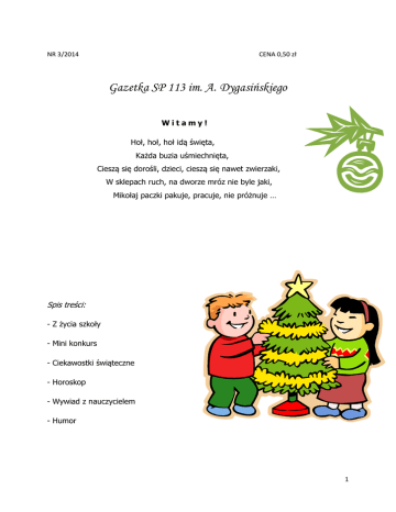 NR 3/2014 CENA 0,50 zł Gazetka SP 113 im. A. Dygasińskiego Witamy! Hoł, hoł, hoł idą święta, Każda buzia uśmiechnięta, Cieszą się dorośli, dzieci, cieszą się nawet zwierzaki, W sklepach ruch, na dworze mróz nie byle jaki, Mikołaj paczki pakuje, pracuje, nie próżnuje … Spis treści: - Z życia szkoły - Mini konkurs - Ciekawostki świąteczne - Horoskop - Wywiad z nauczycielem - Humor 1 Z życia szkoły Święto Odzyskania Niepodległości W dn. 7.11.2014r. uczniowie naszej szkoły uczestniczyli w uroczystości poświęconej 96 rocznicy odzyskania niepodległości przez Polskę. Przedstawienie przygotowała kl. V B pod kierunkiem p. Weroniki Ziętkowskiej. Listopadowy koncert muzyczny Tematem przewodnim listopadowego koncertu "na żywo", który odbył się na terenie naszej szkoły była dynamika w muzyce. Uczniowie poznali znaczenie pojęć: piano i forte oraz budowę i brzmienie instrumentu strunowego - skrzypiec. W fabryce bombek choinkowych 4 grudnia uczniowie naszej szkoły pojechali na wycieczkę do Piotrkowa Trybunalskiego aby odwiedzić zakład zajmujący się produkcją i ozdabianiem bombek choinkowych. Każdy uczestnik wycieczki oprócz niezapomnianych wrażeń wrócił do domu z dwiema pomalowanymi i ozdobionymi własnoręcznie bombkami. Dyskoteka andrzejkowa 27.11.2014r. odbyła się w naszej szkole dyskoteka andrzejkowa dla kl. IV – Vi. Uczniowie świetnie się bawili no i oczywiście tańczyli … 2 Ciekawostki świąteczne Kim był prawdziwy św. Mikołaj? Urodził się na przełomie III i IV w. w Turcji w rodzinie bogatych kupców. Był biskupem diecezji Myry. Umarł 6 grudnia najpewniej w 352r. miał 65 lat. Skąd tradycja rozdawania prezentów? Pochodzi ze średniowiecza. Już w XII w. Mikołaj miał rozdawać prezenty, ale i wymierzać kary. 5 grudnia wypytywał nauczycieli o zachowanie uczniów, a następnego dnia wracał z podarunkami bądź karą. Tradycja nakazująca przychodzić Mikołajowi 24 grudnia wywodzi się z kultury anglosaskiej. Po czym rozpoznać współczesnego św.Mikołaja? Miły dziadek, dość gruby. Ma długie włosy, wąsy i brodę w kolorze biało – srebrnym. Nosi czerwoną czapkę z pomponem, kubrak, spodnie i rękawice wykończone białym futrem. Na brzuchu jest opięty szerokim, czarnym pasem ( każdy prawdziwy św. Mikołaj ma wystający brzuch). Buty ma wysokie, czarne z cholewami. Podróżuje saniami zaprzęgniętymi w osiem reniferów. Rzecz absolutnie konieczna – worek. Gdzie mieszka św. Mikołaj? W Laponii w północnej Finlandii, poza kręgiem polarnym. 3 Ciekawostki przyrodnicze Delfin-inteligentny mieszkaniec morza. Delfiny to fascynujące stworzenia! Należą do rodziny waleni i są ssakami, które żyją w wodzie. To oznacza że ich młode rodzą się pod wodą! A czy wiedziałeś, że delfiny, tak jak nietoperze, określają swoje położenie na podstawie fal dźwiękowych? Mają też swój własny język - komunikują się poprzez gwizdanie, a każdy delfin potrafi wytwarzać niepowtarzalny dźwięk! Tygrys Czy wiedziałaś, że tygrysy mają pasiaste nie tylko futra? Gdybyś jakiegoś ogolił, zobaczyłbyś, że jego naga skóra też jest pasiasta! 4 Wywiad z panią Weroniką Ziętkowską - Jakiego przedmiotu uczy pani w naszej szkole? - Uczę matematyki. - Czy lubi pani swoją pracę? - Tak, lubię. - Jakiej muzyki pani słucha? - Nie umiem jednoznacznie odpowiedzieć. Jak mam dobry humor słucham rock and roll. - Jakie filmy pani ogląda? - Nie mam czasu oglądać filmów. Lubię komedie i dobrą sensację. - Czy ma pani swój ulubiony kolor? - Nie mam. Nie lubię za to białego koloru z oczywistych powodów - szybko się brudzi. - Pani ulubiony owoc, warzywo ? - Papryka, jabłka … lubię wszystkie owoce. - Czy pracuje pani tylko w naszej szkole? - Tak - Czy często je pani słodycze? - Aż za często !!! - Dziękuję za wywiad. 5 Jakim jesteś uczniem? Baran - 21 III – 20 IV Klasowy rozrabiaka, ciekawski łobuziak. Lubi szkołę, zrobi wszystko, żeby się w niej nie nudzić. Byk – 21 IV – 21 V W szkole spokojny i cichy, pilny i sumienny – ale bez przesady, nie lubi robić więcej niż musi. Bliźnięta – 22 V – 20 VI Klasowy gaduła, każdego rozbawi, wyczyta każdą ciekawostkę, wszędzie go pełno. Rak – 21 VI – 22 VII Pilny i obowiązkowy, szybko się uczy, spokojny, żyje we własnym świecie marzeń, wzorowy uczeń, lubią go nauczyciele. Lew – 23 VII – 22 VIII Zdolny i ambitny, zawsze chce być pierwszy, chciałby rządzić w klasie, uwielbia zwracać na siebie uwagę. Panna – 23 VIII – 22 IX Nie przepada za szkołą, samotnik, uczy się sumiennie, ale nie dla stopni i wyróżnień, wybiera sobie ulubione przedmioty. Waga – 23 IX - 23 X Sympatyczna i towarzyska, mądra i zdolna, łatwo osiąga w szkole sukcesy, ma wielu kolegów, lubią ją nauczyciele. Skorpion 24 X – 21 XI Żarliwy i namiętny, w szkole do nauki podchodzi z pasją, wszystko go interesuje, lubi gdy wkoło coś się dzieje. Strzelec – 22 XI – 21 XII Bardzo zdolny, bystry, gadatliwy, umie dyskutować, przekonywać, do szkoły chodzi z chęcią. Lubi konkursy i olimpiady, często je wygrywa. 6 Koziorożec – 22 XII – 19 I Pracowity, dokładny, pilny, bardzo odpowiedzialny i rozsądny, a do tego wyjątkowo zdolny, prawdziwy wzór – chociaż za szkołą nie przepada. Wodnik – 20 I – 18 II Oryginalny i pomysłowy, wszystko w szkole zna, lubi dyskutować i popisywać się wiedzą, nauka to dla niego przyjemność. Ryby – 19 II – 20 III Zdolne i pracowite, spokojne i bystre, lubiane przez kolegów, w szkole osiągają sukcesy, są uzdolnione artystycznie. Przysłowia związane z Nowym Rokiem. 1. 2. 3. 4. 5. 6. 7. 8. Gdy Nowy Rok w progi, to stary rok w nogi. Jaki Nowy Rok, taki cały rok. Nowy Rok nastaje, każdemu ochoty dodaje. Co nowy Rok nakaże, to wrzesień pokaże. Noworoczna pogoda słońcu w lecie sił doda. Kiedy w styczniu lato, w lecie zima za to. Jak Nowy Rok jasny i chło