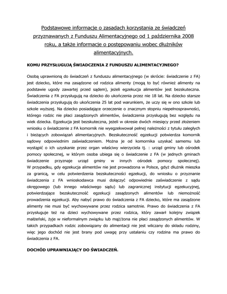 Podstawowe informacje o zasadach korzystania ze świadczeń przyznawanych z Funduszu Alimentacyjnego od 1 października 2008 roku, a takŜe informacje o postępowaniu wobec dłuŜników alimentacyjnych. KOMU PRZYSŁUGUJĄ ŚWIADCZENIA Z FUNDUSZU ALIMENTACYJNEGO? Osobą uprawnioną do świadczeń z funduszu alimentacyjnego (w skrócie: świadczenie z FA) jest dziecko, które ma zasądzone od rodzica alimenty (mogą to być równieŜ alimenty na podstawie ugody zawartej przed sądem), jeŜeli egzekucja alimentów jest bezskuteczna. Świadczenia z FA przysługują na dziecko do ukończenia przez nie 18 lat. Na dziecko starsze świadczenia przysługują do ukończenia 25 lat pod warunkiem, Ŝe uczy się w ono szkole lub szkole wyŜszej. Na dziecko posiadające orzeczenie o znacznym stopniu niepełnosprawności, którego rodzic nie płaci zasądzonych alimentów, świadczenia przysługują bez względu na wiek dziecka. Egzekucja jest bezskuteczna, jeŜeli w okresie dwóch miesięcy przed złoŜeniem wniosku o świadczenie z FA komornik nie wyegzekwował pełnej naleŜności z tytułu zaległych i bieŜących zobowiązań alimentacyjnych. Bezskuteczność egzekucji potwierdza komornik sądowy odpowiednim zaświadczeniem. MoŜna je od komornika uzyskać samemu lub wystąpić o ich uzyskanie przez organ właściwy wierzyciela tj. : urząd gminy lub ośrodek pomocy społecznej, w którym osoba ubiega się o świadczenie z FA (w jednych gminach świadczenie przyznaje urząd gminy w innych ośrodek pomocy społecznej). W przypadku, gdy egzekucja alimentów nie jest prowadzona w Polsce, gdyŜ dłuŜnik mieszka za granicą, w celu potwierdzenia bezskuteczności egzekucji, do wniosku o przyznanie świadczenia z FA wnioskodawca musi dołączyć odpowiednie zaświadczenie z sądu okręgowego (lub innego właściwego sądu) lub zagranicznej instytucji egzekucyjnej, potwierdzające bezskuteczność egzekucji zasądzonych alimentów lub niemoŜność prowadzenia egzekucji. Aby nabyć prawo do świadczenia z FA dziecko, które ma zasądzone alimenty nie musi być wychowywane przez rodzica samotnie. Prawo do świadczenia z FA przysługuje teŜ na dzieci wychowywane przez rodzica, który zawarł kolejny związek małŜeński, Ŝyje w nieformalnym związku lub mąŜ/Ŝona nie płaci zasądzonych alimentów. W takich przypadkach rodzic zobowiązany do alimentacji nie jest wliczany do składu rodziny, więc jego dochód nie jest brany pod uwagę przy ustalaniu czy rodzina ma prawo do świadczenia z FA. DOCHÓD UPRAWNIAJĄCY DO ŚWIADCZEŃ. Prawo do świadczenia z FA przysługuje, jeŜeli przeciętny miesięczny dochód netto na osobę w rodzinie w roku poprzedzającym okres świadczeniowy nie przekracza 725 zł. Ustalając prawo do świadczenia z FA na okres od 1 października 2009 r. do 30 września 2010 r. brany jest pod uwagę dochód uzyskany przez członków rodziny w 2008 r. Na dochód ten składają się następujące składniki: • przychody podlegające opodatkowaniu na zasadach ogólnych na podstawie przepisów o podatku dochodowym od osób fizycznych, pomniejszone o koszty uzyskania przychodu, naleŜny podatek dochodowy od osób fizycznych, składki na ubezpieczenia społeczne niezaliczone do kosztów uzyskania przychodu oraz składki na ubezpieczenie zdrowotne, • deklarowany w oświadczeniu dochód z działalności podlegającej opodatkowaniu na podstawie przepisów o zryczałtowanym podatku dochodowym od niektórych przychodów osiąganych przez osoby fizyczne, • inne dochody nieopodatkowane podatkiem dochodowym od osób fizycznych enumeratywnie wyliczone w ustawie o świadczeniach rodzinnych (np. wszelkie stypendia otrzymywane przez uczniów lub studentów, alimenty na rzecz dzieci). W odróŜnieniu od ustalania dochodu dla potrzeb przyznania świadczeń rodzinnych, do dochodu rodziny nie wlicza się kwot zaliczek alimentacyjnych otrzymanych w 2008 r. W przypadku, gdy rodzina posiada gospodarstwo rolne, dochód z tego tytułu oblicza się na podstawie liczby hektarów przeliczeniowych znajdujących się w jej posiadaniu w roku kalendarzowym poprzedzającym okres zasiłkowy. W tym, jeŜeli zmiana powierzchni gospodarstwa rolnego miała miejsce w trakcie miesiąca, nową powierzchnię gospodarstwa uwzględnia się od miesiąca następnego. Miesięczna wartość dochodu z 1 ha przeliczeniowego została określona na poziomie 1/12 dochodu ogłaszanego corocznie w drodze obwieszczenia przez Prezesa Głównego Urzędu Statystycznego na podstawie art. 18 ustawy z 15 listopada 1984 r. o podatku rolnym. W/w wskaźnik dochodu z gospodarstwa rolnego za rok 2008 (czyli rok, z którego dochód brany jest pod uwagę przy ustalaniu prawa do świadczeń z funduszu alimentacyjnego, na rozpoczynający się od 1 października 2009 r. okres świadczeniowy). W przypadku, gdy rodzina lub osoba ucząca się utrzymuje się z gospodarstwa rolnego oraz uzyskuje pozarolnicze dochody, dochody z obu tych źródeł sumuje się. Przeciętny miesięczny dochód na osobę w rodzinie oblicza się, dzieląc łączną kwotę dochodu uzyskanego przez wszystkich członków rodziny w roku 2008, przez 12, czyli przez liczbę miesięcy w roku, a następnie przez liczbę członków rodziny. W przypadku uzyskiwania dochodów podlegających opodatkowaniu podatkiem dochodowym na zasadach ogólnych, wysokość uzyskanego dochodu naleŜy udokumentować zaświadczeniami z urzędu skarbowego o dochodach za rok 2008. Brany jest pod uwagę dochód netto, czyli przychód wykazany w zaświadczeniu z US, pomniejszony o koszty uzyskania przychodu, naleŜny podatek dochodowy od osób fizycznych, składki na ubezpieczenia społeczne niezaliczone do kosztów uzyskania przychodu oraz składki na ubezpieczenie zdrowotne. Zgodnie z art. 44 ustawy o pomocy osobom uprawnionym do alimentów ustalając prawo do świadczenia z funduszu alimentacyjnego na okresy świadczeniowe od dnia 1 października 2009 r. do dnia 30 września 2010 r., do dochodu rodziny ni