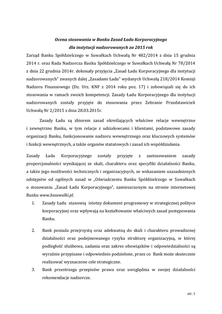 Ocena stosowania w Banku Zasad Ładu Korporacyjnego dla instytucji nadzorowanych za 2015 rok Zarząd Banku Spółdzielczego w Suwałkach Uchwałą Nr 482/2014 z dnia 15 grudnia 2014 r. oraz Rada Nadzorcza Banku Spółdzielczego w Suwałkach Uchwałą Nr 78/2014 z dnia 22 grudnia 2014r. dokonały przyjęcia „Zasad Ładu Korporacyjnego dla instytucji nadzorowanych” zwanych dalej „Zasadami Ładu” wydanych Uchwałą 218/2014 Komisji Nadzoru Finansowego (Dz. Urz. KNF z 2014 roku poz. 17) i zobowiązali się do ich stosowania w ramach swoich kompetencji. Zasady Ładu Korporacyjnego dla instytucji nadzorowanych zostały przyjęte do stosowania przez Zebranie Przedstawicieli Uchwałą Nr 2/2015 z dnia 28.03.2015r. Zasady Ładu są zbiorem zasad określających właściwe relacje wewnętrzne i zewnętrzne Banku, w tym relacje z udziałowcami i klientami, podstawowe zasady organizacji Banku, funkcjonowanie nadzoru wewnętrznego oraz kluczowych systemów i funkcji wewnętrznych, a także organów statutowych i zasad ich współdziałania. Zasady Ładu Korporacyjnego zostały przyjęte z zastosowaniem zasady proporcjonalności wynikającej ze skali, charakteru oraz specyfiki działalności Banku, a także jego możliwości technicznych i organizacyjnych, ze wskazaniem uzasadnionych odstępstw od ogólnych zasad w „Oświadczeniu Banku Spółdzielczego w Suwałkach o stosowaniu „Zasad Ładu Korporacyjnego”, zamieszczonym na stronie internetowej Banku www.bssuwalki.pl. 1. Zasady Ładu stanowią istotny dokument programowy w strategicznej polityce korporacyjnej oraz wpływają na kształtowanie właściwych zasad postępowania Banku. 2. Bank posiada przejrzystą oraz adekwatną do skali i charakteru prowadzonej działalności oraz podejmowanego ryzyka strukturę organizacyjną, w której podległość służbowa, zadania oraz zakres obowiązków i odpowiedzialności są wyraźnie przypisane i odpowiednio podzielone, przez co Bank może skutecznie realizować wyznaczone cele strategiczne. 3. Bank przestrzega przepisów prawa oraz uwzględnia w swojej działalności rekomendacje nadzorcze. str. 1 4. Organizacja Banku obejmuje zarządzanie i sprawowanie kontroli, systemy sprawozdawczości wewnętrznej, przepływu i ochrony informacji oraz obiegu dokumentów, a także zapobiega konfliktowi interesów, co zostało należycie uregulowane w organizacyjna odpowiednich podlega procedurach corocznemu wewnętrznych. przeglądowi i Struktura dostosowaniu do zmieniających się przepisów i wymogów zewnętrznych. 5. Bank zapewnia jawność struktury organizacyjnej poprzez zamieszczenie schematu struktury organizacyjnej na stronie internetowej. 6. Bank wykazuje troskę o ochronę praw i rozwój pracowników budujących wartość i reputację instytucji. Zadania Banku wykonują odpowiednio przygotowane osoby, działające pod nadzorem kompetentnych i doświadczonych przełożonych. 7. Bank, będąc instytucją zaufania publicznego prowadzi działalność z zachowaniem najwyższej staranności, przykłada szczególną wagę do profesjonalizmu i etyki osób wchodzących w skład organów podmiotów nadzorowanych. 8. Rada Nadzorcza Banku dokonała na posiedzeniu w dniu 21.03.2016r. oceny działania Zarządu. Na skutek oceny stwierdzono, że skład i zasady funkcjonowania Zarządu, a także profesjonalizm i etyka osób wchodzących w jego skład nie budzą wątpliwości Rady Nadzorczej. 9. Rada Nadzorcza na podstawie przedstawianych informacji ocenia realizację strategii działania, strategii zarządzania ryzykami i polityki kapitałowej Banku. 10. Rada Nadzorcza deklaruje, że Zarząd wspiera Radę Nadzorczą w procesie decyzyjnym i nadzorczym poprzez przedkładanie kompleksowych materiałów oraz aktywny udział w posiedzeniach Rady. 11. Współpraca Rady Nadzorczej z Zarządem Banku jest efektywna, a przyjęta formuła współdziałania zapewnia obiektywizm nadzoru właścicielskiego i przestrzeganie dobrych praktyk ładu korporacyjnego. 12. Rada Nadzorcza oraz Zarząd Banku sprawują powierzone funkcje w sposób zgodny z Zasadami Ładu Korporacyjnego oraz posiadają przygotowanie niezbędne do należytego sprawowania funkcji. Członkowie Zarządu i Rady Nadzorczej dają rękojmię należytego wykonania powierzonych im obowiązków. str. 2 13. Bank prowadzi przejrzystą politykę wynagrodzeń. Polityka wynagrodzeń, ze szczególnym uwzględnieniem Polityki zmiennych składników wynagrodzeń stanowi istotny element rozwoju i bezpieczeństwa funkcjonowania Banku i nie zachęca do podejmowania nadmiernego ryzyka w prowadzonej działalności. Polityka wynagrodzeń uwzględnia sytuację finansową Banku. W zakresie oceny poprawności polityki oraz jej stosowania nie wniesiono zastrzeżeń. 14. Bank zapewnia udziałowcom właściwy dostęp do informacji, w szczególności w przypadku podejmowania decyzji przez Zebranie Przedstawicieli. Nie stwierdzono skarg członków Banku dotyczących odmowy udzielenia informacji dotyczącej sytuacji Banku, nie stwierdzono również skarg i reklamacji klientów związanych z niewłaściwym dostępem do informacji. 15. Polityka informacyjna Banku służy budowie właściwych relacji, w szczególności poprzez ułatwianie dostępu do informacji zarówno klientom jak i udziałowcom. Bank ogłasza, w sposób ogólnie dostępny (w Centrali Banku oraz na stronie internetowej) opis systemu zarządzania, w tym systemu zarządzania ryzykiem i sytemu kontroli wewnętrznej oraz stosowanej polityki wynagrodzeń zgodny z wymogami rozporządzenia nr 575/2013, prawa krajowego i rekomendacji nadzorczych. 16. Dobre relacje Banku z klientami budują zaufanie do Banku, stąd dbałość o klienta jest jednym z nadrzędnych celów strategicznych. 17. Rzetelne informowanie klientów o oferowanej usłudze czy produkcie w sposób zrozumiały dla przeciętnego odbiorcy z uwzględnieniem ryzyka z nią związanego jest podstawowym obowiązkiem pracowników Banku i jest realizowany na etapie komunika