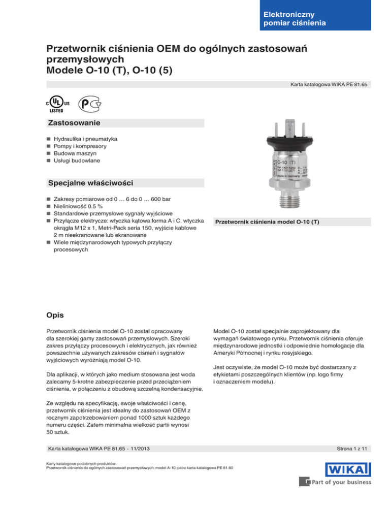 Elektroniczny pomiar ciśnienia Przetwornik ciśnienia OEM do ogólnych zastosowań przemysłowych Modele O-10 (T), O-10 (5) Karta katalogowa WIKA PE 81.65 Zastosowanie ■■ Hydraulika i pneumatyka ■■ Pompy i kompresory ■■ Budowa maszyn ■■ Usługi budowlane Specjalne właściwości ■■ Zakresy pomiarowe od 0 … 6 do 0 … 600 bar ■■ Nieliniowość 0.5 % ■■ Standardowe przemysłowe sygnały wyjściowe ■■ Przyłącze elektrycze: wtyczka kątowa forma A i C, wtyczka okrągła M12 x 1, Metri-Pack seria 150, wyjście kablowe 2 m nieekranowane lub ekranowane ■■ Wiele międzynarodowych typowych przyłączy procesowych Przetwornik ciśnienia model O-10 (T) Opis Przetwornik ciśnienia model O-10 został opracowany dla szerokiej gamy zastosowań przemysłowych. Szeroki zakres przyłączy procesowych i elektrycznych, jak również powszechnie używanych zakresów ciśnień i sygnałów wyjściowych wyróżniają model O-10. Dla aplikacji, w których jako medium stosowana jest woda zalecamy 5-krotne zabezpieczenie przed przeciążeniem ciśnienia, w połączeniu z obudową szczelną kondensacyjnie. Model O-10 został specjalnie zaprojektowany dla wymagań światowego rynku. Przetwornik ciśnienia oferuje międzynarodowe jednostki i odpowiednie homologacje dla Ameryki Północnej i rynku rosyjskiego. Jest oczywiste, że model O-10 może być dostarczany z etykietami poszczególnych klientów (np. logo firmy i oznaczeniem modelu). Ze względu na specyfikację, swoje właściwości i cenę, przetwornik ciśnienia jest idealny do zastosowań OEM z rocznym zapotrzebowaniem ponad 1000 sztuk każdego numeru części. Zatem minimalna wielkość partii wynosi 50 sztuk. Karta katalogowa WIKA PE 81.65 ∙ 11/2013 Karty katalogowe podobnych produktów: Przetwornik ciśnienia do ogólnych zastosowań przemysłowych; model A-10; patrz karta katalogowa PE 81.60 Strona 1 z 11 Wersje Model O-10 (T) Wersja standardowa Model O-10 (5) Z 5-krotnym przeciążeniem i obudową szczelną kondensacyjnie Dla aplikacji z wodą jako medium zalecamy 5-krotne bezpieczne przeciążenie, dla ochrony przed skutkami uderzenia hydraulicznego, i obudowę szczelną kondensacyjnie. Zakresy pomiarowe ■■ Model O-10 (T) Ciśnienia względne bar psi 0 ... 6 1) 2) 0 ... 160 0 ... 100 1) 2) 0 ... 600 0 ... 4,000 0 ... 10 1) 2) 0 ... 250 0 ... 160 0 ... 750 0 ... 5,000 Podciśnienie i zakresy +/bar psi -1 ... +5 2) -30 inHg ... +100 2) 0 ... 16 0 ... 400 0 ... 200 0 ... 800 0 ... 6,000 -1 ... +9 2) -30 inHg ... +160 0 ... 25 0 ... 600 0 ... 250 0 ... 1,000 0 ... 7,500 -1 ... +15 -30 inHg ... +200 0 ... 40 0 ... 60 0 ... 100 0 ... 300 0 ... 1,500 0 ... 8,000 0 ... 400 0 ... 2,000 0 ... 500 0 ... 3,000 -1 ... +24 -30 inHg ... +300 -1 ... +39 -30 inHg ... +500 -1 ... +59 1) Odchylenie pomiarowe sygnału zerowego ≤ ±0.7 % zakresu 2) Nieliniowość ≤ ±0.6 % zakresu BFSL Wyspecyfikowane zakresy pomiarowe dostepne są także w kg/cm2, kPa and MPa. Inne zakresy pomiarowe na zapytanie. Dopuszczalne przeciążenie 2-krotne, 3-krotne na zapytanie Odporność próżniowa Tak ■■ Model O-10 (5) Ciśnienie względne bar 0 ... 6 0 ... 10 0 ... 16 0 ... 25 0 ... 40 Inne zakresy pomiarowe na zapytanie. Dopuszczalne przeciążenie 5-krotne Odporność próżniowa Tak Strona 2 z 11 Karta katalogowa WIKA PE 81.65 ∙ 11/2013 Sygnały wyjściowe ■■ Model O-10 (T) Typ sygnału Sygnał Prądowy (2-przewody) 4 ... 20 mA Napięciowy (3-przewdowy) DC 0.5 ... 4.5 V DC 0 ... 5 V DC 1 ... 5 V DC 0 ... 10 V Ratiometryczny (3-przewodowy) DC 0.5 ... 4.5 V Inne sygnały wyjściowe dostępne na zapytanie. Obciążenie w Ω Sygnał prądowy (2-przewodowy): Sygnał napięciowy (3-przewodowy): Sygnał ratiometryczny (3-przewodowy): ≤ (zasilanie - 8 V) / 0.02 A > maksymalny sygnał wyjściowy / 1 mA > 4.5 kΩ ■■ Model O-10 (T) Typ sygnału Sygnał Prądowy (2-przewodowy) 4 ... 20 mA Ratiometryczny (3-przewodowy) DC 0.5 ... 4.5 V Napięciowy (3-przewodowy) DC 0.5 ... 4.5 V DC 1 ... 5 V Inne sygnały wyjściowe dostępne na zapytanie. Obciążenie w Ω Sygnał prądowy (2-przewodowy): Sygnał napięciowy (3-przewodowy): Ratiometryczny sygnał wyjściowy (3-przewodowy): Karta katalogowa WIKA PE 81.65 ∙ 11/2013 ≤ (zasilanie - 8 V) / 0.02 A > maksymalny sygnał wyjściowy / 1 mA > 4.5 kΩ Strona 3 z 11 Zasilanie napięciowe Zasilanie Zasilanie zależy od wybranego sygnału wyjściowego. 4 ... 20 mA: DC 8 ... 30 V DC 0.5 ... 4.5 V: DC 8 ... 30 V DC 0 ... 5 V: DC 8 ... 30 V DC 1 ... 5 V: DC 8 ... 30 V DC 0 ... 10 V: DC 14 ... 30 V DC 0.5 ... 4.5 V (ratiometryczny): DC 4.5 ... 5 V Zasilanie przetwornika ciśnienia musi odbywać się za pomocą obwodu elektrycznego o ograniczonej energii zgodnie z sekcją 9.4 UL/EN/IEC 61010-1, LPS lub UL/EN/IEC 60950-1, lub klasą 2 zgodnie z UL1310/UL1585 (NEC lub CEC). Zasilanie musi być odpowiednie do pracy powyżej 2,000 m, przetwornik ciśnienia należy stosować na tej wysokości. Całkowity pobór prądu Wyjście prądowe: Całkowity pobór prądu odpowiada wartości wyjściowego sygnału prądowego (4 ... 20 mA), maksimum 25 mA Wyjście napięciowe: 5 mA Warunki odniesienia (wg IEC 61298-1) Temperatura 15 ... 25 °C Ciśnienia atmosferyczne 860 ... 1,060 mbar Wilgotność 45 ... 75 % względna Zasilanie Sygnał prądowy: Sygnał napięciowy: Ratiomatryczny sygnał wyjściowy: DC 14 V DC 24 V DC 5 V Pozycja nominalna Kalibrowany w pozycji pionowej z przyłączem ciśnieniowym skierowanym w dół. Cza odpowiedzi Czas ustalania < 2 ms Strona 4 z 11 Karta katalogowa WIKA PE 81.65 ∙ 11/2013 Dane dokładności ■■ Model O-10 (T) Nieliniowość (wg IEC 61298-2) ≤ ±0.5 % zakresu BFSL Inna nieliniowość ma zastosowanie do niektórych zakresów pomiarowych, patrz "Zakresy pomiarowe model O-10 (T)". Ochylenie pomiarowe sygnału zerowego ≤ ±0.5 % zakresu Inne nieliniowość ma zastosowanie do niektórych zakresów pomiarowych, patrz "Zakresy pomiarowe model O-10 (T)". Dokładność w war