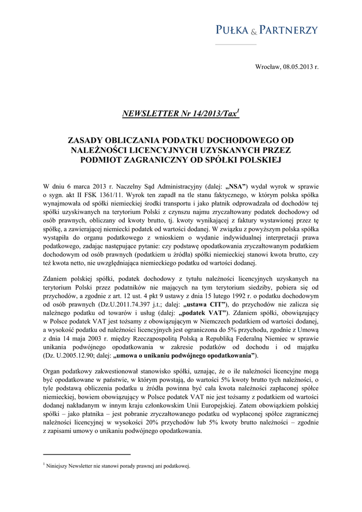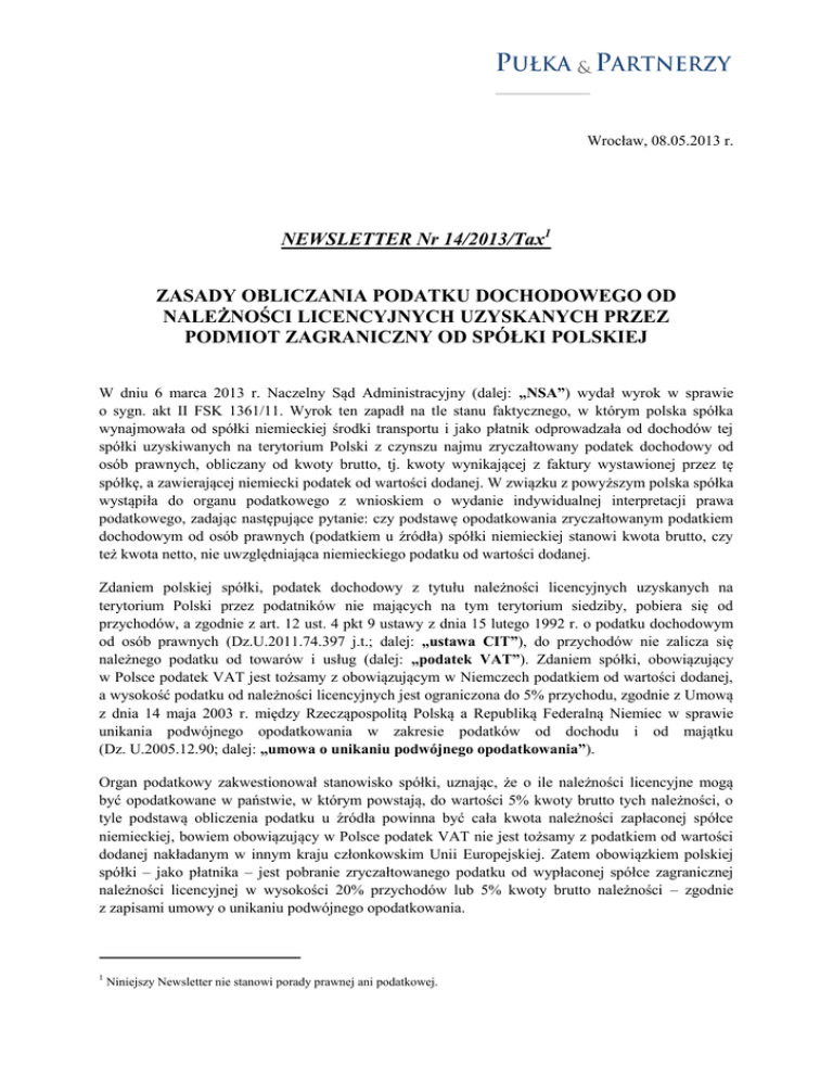 Wrocław, 08.05.2013 r. NEWSLETTER Nr 14/2013/Tax1 ZASADY OBLICZANIA PODATKU DOCHODOWEGO OD NALEŻNOŚCI LICENCYJNYCH UZYSKANYCH PRZEZ PODMIOT ZAGRANICZNY OD SPÓŁKI POLSKIEJ W dniu 6 marca 2013 r. Naczelny Sąd Administracyjny (dalej: „NSA”) wydał wyrok w sprawie o sygn. akt II FSK 1361/11. Wyrok ten zapadł na tle stanu faktycznego, w którym polska spółka wynajmowała od spółki niemieckiej środki transportu i jako płatnik odprowadzała od dochodów tej spółki uzyskiwanych na terytorium Polski z czynszu najmu zryczałtowany podatek dochodowy od osób prawnych, obliczany od kwoty brutto, tj. kwoty wynikającej z faktury wystawionej przez tę spółkę, a zawierającej niemiecki podatek od wartości dodanej. W związku z powyższym polska spółka wystąpiła do organu podatkowego z wnioskiem o wydanie indywidualnej interpretacji prawa podatkowego, zadając następujące pytanie: czy podstawę opodatkowania zryczałtowanym podatkiem dochodowym od osób prawnych (podatkiem u źródła) spółki niemieckiej stanowi kwota brutto, czy też kwota netto, nie uwzględniająca niemieckiego podatku od wartości dodanej. Zdaniem polskiej spółki, podatek dochodowy z tytułu należności licencyjnych uzyskanych na terytorium Polski przez podatników nie mających na tym terytorium siedziby, pobiera się od przychodów, a zgodnie z art. 12 ust. 4 pkt 9 ustawy z dnia 15 lutego 1992 r. o podatku dochodowym od osób prawnych (Dz.U.2011.74.397 j.t.; dalej: „ustawa CIT”), do przychodów nie zalicza się należnego podatku od towarów i usług (dalej: „podatek VAT”). Zdaniem spółki, obowiązujący w Polsce podatek VAT jest tożsamy z obowiązującym w Niemczech podatkiem od wartości dodanej, a wysokość podatku od należności licencyjnych jest ograniczona do 5% przychodu, zgodnie z Umową z dnia 14 maja 2003 r. między Rzecząpospolitą Polską a Republiką Federalną Niemiec w sprawie unikania podwójnego opodatkowania w zakresie podatków od dochodu i od majątku (Dz. U.2005.12.90; dalej: „umowa o unikaniu podwójnego opodatkowania”). Organ podatkowy zakwestionował stanowisko spółki, uznając, że o ile należności licencyjne mogą być opodatkowane w państwie, w którym powstają, do wartości 5% kwoty brutto tych należności, o tyle podstawą obliczenia podatku u źródła powinna być cała kwota należności zapłaconej spółce niemieckiej, bowiem obowiązujący w Polsce podatek VAT nie jest tożsamy z podatkiem od wartości dodanej nakładanym w innym kraju członkowskim Unii Europejskiej. Zatem obowiązkiem polskiej spółki – jako płatnika – jest pobranie zryczałtowanego podatku od wypłaconej spółce zagranicznej należności licencyjnej w wysokości 20% przychodów lub 5% kwoty brutto należności – zgodnie z zapisami umowy o unikaniu podwójnego opodatkowania. 1 Niniejszy Newsletter nie stanowi porady prawnej ani podatkowej. NSA zakwestionował w całości powyższą argumentację organu podatkowego, przyjmując, że powstałe w Polsce i wypłacane osobie prawnej mającej siedzibę w Niemczech przychody za użytkowanie środków transportu (należności licencyjne), zgodnie z art. 12 ust. 2 umowy o unikaniu podwójnego opodatkowania, są opodatkowane w Polsce, na podstawie art. 21 ust. 1 pkt 1 ustawy CIT, podatkiem dochodowym od osób prawnych w wysokości 20% przychodów, do których zgodnie z art. 12 ust. 4 pkt 9 ustawy CIT nie zalicza się niemieckiego należnego podatku od wartości dodanej, przy czym kwota podatku nie może przekroczyć 5% należności licencyjnej brutto, czyli przychodu powiększonego o niemiecki podatek od wartości dodanej. Innymi słowy, przy obliczaniu zryczałtowanego podatku dochodowego od należności licencyjnych uzyskanych przez podmiot zagraniczny, polska spółka – jako płatnik – może bądź to naliczyć podatek w wysokości 20% wartości netto wykazanej na fakturze, bądź też naliczyć podatek w wysokości 5% wartości brutto (tj. wartości uwzględniającej należny podatek VAT), zgodnie z postanowieniami umowy o unikaniu podwójnego opodatkowania. Uzasadniając powyższe stanowisko, NSA opowiedział się za tożsamością polskiego podatku VAT i podatku od wartości dodanej nakładanego przez inne państwa członkowskie Unii Europejskiej. Zdaniem NSA, przychód określany jest w tym przypadku dla spółki zagranicznej, nie zaś dla polskiej spółki, będącej wyłącznie płatnikiem pobierającym podatek u źródła. Zatem odliczany od przychodu spółki zagranicznej podatek VAT jest podatkiem należnym, co odpowiada dyspozycji przepisu art. 12 ust. 4 pkt 9 ustawy CIT (tj. podlega wyłączeniu z kategorii przychodów spółki zagranicznej). W razie dalszych pytań pozostajemy do Państwa dyspozycji. 2