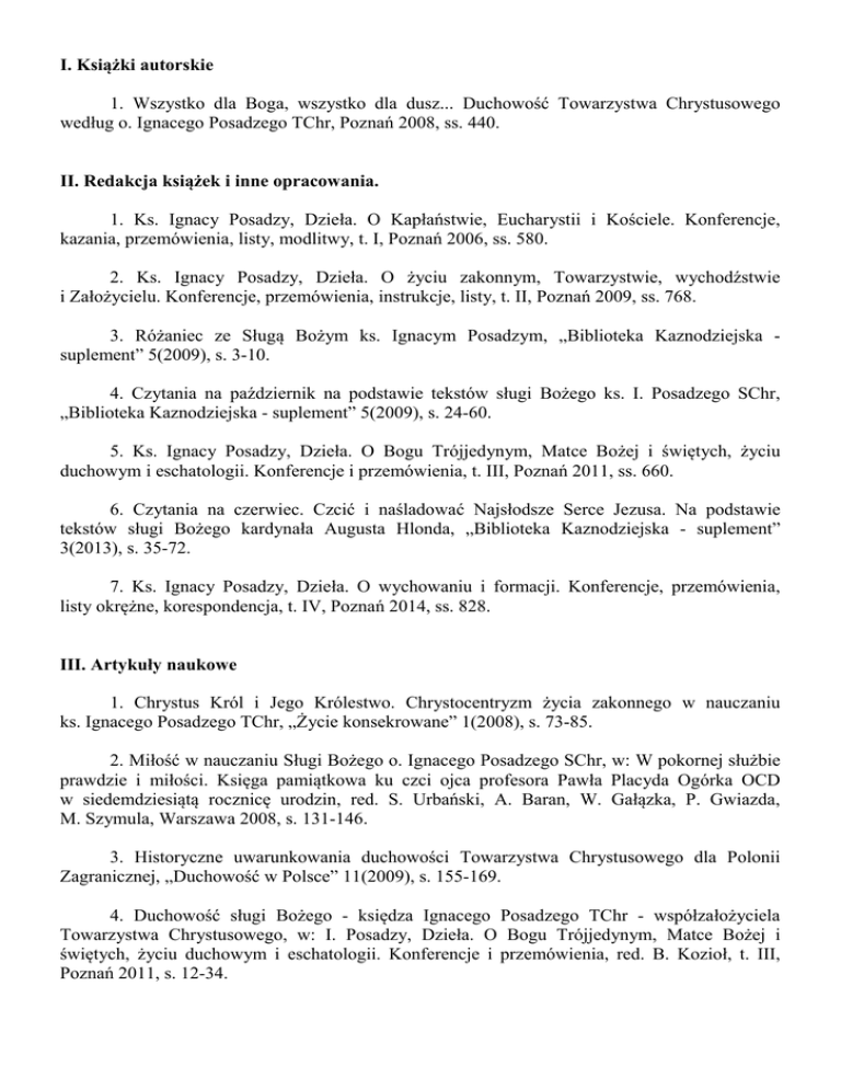 I. Książki autorskie 1. Wszystko dla Boga, wszystko dla dusz... Duchowość Towarzystwa Chrystusowego według o. Ignacego Posadzego TChr, Poznań 2008, ss. 440. II. Redakcja książek i inne opracowania. 1. Ks. Ignacy Posadzy, Dzieła. O Kapłaństwie, Eucharystii i Kościele. Konferencje, kazania, przemówienia, listy, modlitwy, t. I, Poznań 2006, ss. 580. 2. Ks. Ignacy Posadzy, Dzieła. O życiu zakonnym, Towarzystwie, wychodźstwie i Założycielu. Konferencje, przemówienia, instrukcje, listy, t. II, Poznań 2009, ss. 768. 3. Różaniec ze Sługą Bożym ks. Ignacym Posadzym, „Biblioteka Kaznodziejska suplement” 5(2009), s. 3-10. 4. Czytania na październik na podstawie tekstów sługi Bożego ks. I. Posadzego SChr, „Biblioteka Kaznodziejska - suplement” 5(2009), s. 24-60. 5. Ks. Ignacy Posadzy, Dzieła. O Bogu Trójjedynym, Matce Bożej i świętych, życiu duchowym i eschatologii. Konferencje i przemówienia, t. III, Poznań 2011, ss. 660. 6. Czytania na czerwiec. Czcić i naśladować Najsłodsze Serce Jezusa. Na podstawie tekstów sługi Bożego kardynała Augusta Hlonda, „Biblioteka Kaznodziejska - suplement” 3(2013), s. 35-72. 7. Ks. Ignacy Posadzy, Dzieła. O wychowaniu i formacji. Konferencje, przemówienia, listy okrężne, korespondencja, t. IV, Poznań 2014, ss. 828. III. Artykuły naukowe 1. Chrystus Król i Jego Królestwo. Chrystocentryzm życia zakonnego w nauczaniu ks. Ignacego Posadzego TChr, „Życie konsekrowane” 1(2008), s. 73-85. 2. Miłość w nauczaniu Sługi Bożego o. Ignacego Posadzego SChr, w: W pokornej służbie prawdzie i miłości. Księga pamiątkowa ku czci ojca profesora Pawła Placyda Ogórka OCD w siedemdziesiątą rocznicę urodzin, red. S. Urbański, A. Baran, W. Gałązka, P. Gwiazda, M. Szymula, Warszawa 2008, s. 131-146. 3. Historyczne uwarunkowania duchowości Towarzystwa Chrystusowego dla Polonii Zagranicznej, „Duchowość w Polsce” 11(2009), s. 155-169. 4. Duchowość sługi Bożego - księdza Ignacego Posadzego TChr - współzałożyciela Towarzystwa Chrystusowego, w: I. Posadzy, Dzieła. O Bogu Trójjedynym, Matce Bożej i świętych, życiu duchowym i eschatologii. Konferencje i przemówienia, red. B. Kozioł, t. III, Poznań 2011, s. 12-34. 5. Kult Najświętszego Serca Pana Jezusa w życiu i nauczaniu kard. Augusta Hlonda, Prymasa Polski, „Duchowość w Polsce” 14(2012), s. 237-248. 6. Elementy duchowości kapłańskiej w nauczaniu Benedykta XVI, „Studia Theologica Varsaviensia” 2(2013), s. 145-163. 7. Formacja do życia zakonnego, w: I. Posadzy, Dzieła. O wychowaniu i formacji. Konferencje, przemówienia, listy okrężne, korespondencja, t. IV, Poznań 2014, s. 11-28. IV. Artykuły popularne 1. Ojca Ignacego Posadzego zamyślenia nad powołaniem kapłańskim..., „Msza Święta” 1(2007), s. 14-15. 2. Uroczystość translacji w procesie beatyfikacyjnym o. Ignacego Posadzego, „Głos Towarzystwa Chrystusowego” 2(2007), s. 35-38. 3. W poszukiwaniu duchowości, „Spod znaku Szkaplerza” 1(2007), s. 16-19. 4. Czy potrzebujemy beatyfikacji Sługi Bożego ojca Ignacego Posadzego?, „Msza Święta” 1(2008), s. 14-15. 5. Czy tylko spowiedź gładzi grzechy?, „Msza Święta” 7/8(2008), s. 13-15. 6. Akty kanonizacyjne wczoraj i dziś, „Msza Święta” 10(2008), s. 13-15. 7. Życie i proces beatyfikacyjny Sługi Bożego o Ignacego, „Głos Towarzystwa Chrystusowego” 1(2009), s. 1-3. 8. „Oto ja jestem z wami...”. Duchowość eucharystyczna, „Msza Święta” 1(2009), s. 14-15. 9. „Nie ma większej miłości...”. Duchowość eucharystyczna, „Msza Święta” 2(2009), s. 16-17. 10. „Jest to ta sama Ofiara...”. Duchowość eucharystyczna, „Msza Święta” 3(2009), s. 14-15. 11. „Dzięki uczyniwszy...”. Duchowość eucharystyczna, „Msza Święta” 4(2009), s. 16-17. 12. „To czyńcie na moją pamiątkę...”. Duchowość eucharystyczna, „Msza Święta” 5(2009), s. 14-15. 13. „Bierzcie i jedzcie z tego wszyscy...”. Duchowość eucharystyczna, „Msza Święta” 6(2009), s. 16-17. 14. „Ite, missa est...”. Duchowość eucharystyczna, „Msza Święta” 7/8(2009), s. 16-17. 15. „Aby Duch Święty zjednoczył nas wszystkich”. Duchowość eucharystyczna, „Msza Święta” 9(2009), s. 14-15. 16. „Stoimy przed Tobą i z radością wspominamy...”. Duchowość eucharystyczna, „Msza Święta” 10(2009), s. 16-17. 17. „Zaprawdę święty jesteś, Boże... i uświęcasz wszystko...”. Duchowość eucharystyczna, „Msza Święta” 11(2009), s. 14-15. 18. „Dlatego niebo i ziemia z uwielbieniem śpiewają Tobie pieśń nową...”. Duchowość eucharystyczna, „Msza Święta” 12(2009), s. 14-15. 19. „Jesteście wybranym plemieniem i królewskim kapłaństwem”. Duchowość kapłańska, „Msza Święta” 1(2010), s. 14-15. 20. „Kim jesteś, Kapłanie?”. Duchowość kapłańska, „Msza Święta” 2(2010), s. 16-17. 21. „Kapłaństwo jest miłowaniem Serca „Msza Święta” 3(2010), s. 16-17. 22. Ks. Paweł Kontny, chrystusowiec „Głos Towarzystwa Chrystusowego” 2(2010), s. 1-2. Jezusowego”. - Duchowość błogosławionym kapłańska, męczennikiem?, 23. Celibat - wezwanie do miłości czy ciężar? Duchowość kapłańska, „Msza Święta” 4(2010), s. 16-17. 24. Ofiara najprawdziwszym świadectwem kapłańskiego życia. Duchowość kapłańska, „Msza Święta” 5(2010), s. 14-15. 25. Serce Boże a sakramentalne kapłaństwo. Duchowość kapłańska, „Msza Święta” 6(2010), s. 16-17. 26. Słudzy miłosierdzia. Duchowość kapłańska, „Msza Święta” 7/8(2010), s. 20-21. 27. Setna rocznica urodzin Chrystusowego” 6/7(2010), s. 3-4. ks. Pawła Kontnego SChr, „Głos Towarzystwa 28. Radykalizm ewangeliczny. Duchowość kapłańska, „Msza Święta” 9(2010), s. 16-17. 29. Maryjne oblicze tożsamości kapłańskiej. Duchowość kapłańska, „Msza Święta” 10(2010), s. 14-15. 30. Kapłan pośrednikiem między Bogie