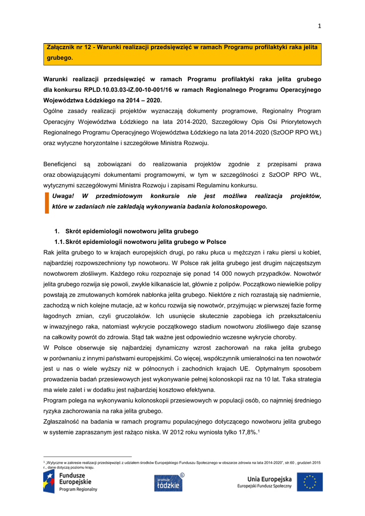 1 Załącznik nr 12 - Warunki realizacji przedsięwzięć w ramach Programu profilaktyki raka jelita grubego. Warunki realizacji przedsięwzięć w ramach Programu profilaktyki raka jelita grubego dla konkursu RPLD.10.03.03-IZ.00-10-001/16 w ramach Regionalnego Programu Operacyjnego Województwa Łódzkiego na 2014 – 2020. Ogólne zasady realizacji projektów wyznaczają dokumenty programowe, Regionalny Program Operacyjny Województwa Łódzkiego na lata 2014‐2020, Szczegółowy Opis Osi Priorytetowych Regionalnego Programu Operacyjnego Województwa Łódzkiego na lata 2014‐2020 (SzOOP RPO WŁ) oraz wytyczne horyzontalne i szczegółowe Ministra Rozwoju. Beneficjenci są zobowiązani do realizowania projektów zgodnie z przepisami prawa oraz obowiązującymi dokumentami programowymi, w tym w szczególności z SzOOP RPO WŁ, wytycznymi szczegółowymi Ministra Rozwoju i zapisami Regulaminu konkursu. Uwaga! W przedmiotowym konkursie nie jest możliwa realizacja projektów, które w zadaniach nie zakładają wykonywania badania kolonoskopowego. 1. Skrót epidemiologii nowotworu jelita grubego 1.1. Skrót epidemiologii nowotworu jelita grubego w Polsce Rak jelita grubego to w krajach europejskich drugi, po raku płuca u mężczyzn i raku piersi u kobiet, najbardziej rozpowszechniony typ nowotworu. W Polsce rak jelita grubego jest drugim najczęstszym nowotworem złośliwym. Każdego roku rozpoznaje się ponad 14 000 nowych przypadków. Nowotwór jelita grubego rozwija się powoli, zwykle kilkanaście lat, głównie z polipów. Początkowo niewielkie polipy powstają ze zmutowanych komórek nabłonka jelita grubego. Niektóre z nich rozrastają się nadmiernie, zachodzą w nich kolejne mutacje, aż w końcu rozwija się nowotwór, przyjmując w pierwszej fazie formę łagodnych zmian, czyli gruczolaków. Ich usunięcie skutecznie zapobiega ich przekształceniu w inwazyjnego raka, natomiast wykrycie początkowego stadium nowotworu złośliwego daje szansę na całkowity powrót do zdrowia. Stąd tak ważne jest odpowiednio wczesne wykrycie choroby. W Polsce obserwuje się najbardziej dynamiczny wzrost zachorowań na raka jelita grubego w porównaniu z innymi państwami europejskimi. Co więcej, współczynnik umieralności na ten nowotwór jest u nas o wiele wyższy niż w północnych i zachodnich krajach UE. Optymalnym sposobem prowadzenia badań przesiewowych jest wykonywanie pełnej kolonoskopii raz na 10 lat. Taka strategia ma wiele zalet i w dodatku jest najbardziej kosztowo efektywna. Program polega na wykonywaniu kolonoskopii przesiewowych w populacji osób, co najmniej średniego ryzyka zachorowania na raka jelita grubego. Zgłaszalność na badania w ramach programu populacyjnego dotyczącego nowotworu jelita grubego w systemie zapraszanym jest rażąco niska. W 2012 roku wyniosła tylko 17,8%.1 1 „Wytyczne w zakresie realizacji przedsięwzięć z udziałem środków Europejskiego Funduszu Społecznego w obszarze zdrowia na lata 2014-2020”, str.60 , grudzień 2015 r., dane dotyczą poziomu kraju. 2 1.2. Skrót epidemiologii nowotworu jelita grubego w województwie łódzkim Zły stan zdrowia mieszkańców województwa łódzkiego spowodowany jest m.in. chorobami nowotworowymi. Stanowią one drugą pod względem częstości występowania, po chorobach układu krążenia, przyczynę zgonów w województwie (ok. 23% zgonów). Z ich powodu wartość współczynnika zgonów w województwie łódzkim jest najwyższa w Polsce wśród osób w wieku przedprodukcyjnym i produkcyjnym. Nowotwór jelita grubego jest piątym w zakresie zachorowalności zarówno wśród kobiet jak i mężczyzn. Wysoki wskaźnik zgonów z powodu nowotworów układu pokarmowego (do których należy nowotwór jelita grubego) w województwie łódzkim jest wynikiem ich późnego wykrywania, kiedy wdrożenie leczenia nie przynosi pożądanych efektów. W naszym województwie stale wzrasta zapadalność na ww. nowotwór. Wg prognoz do 2029 roku liczba nowych przypadków nowotworów oraz zgonów z ich powodu będzie wzrastać. Dotyczy to również nowotworu jelita grubego. Założenia polityki rozwoju i polityki zdrowotnej województwa łódzkiego zakładają intensyfikację działań nastawionych na wczesne wykrywanie chorób nowotworowych. Zły stan zdrowia mieszkańców województwa istotnie związany jest z czynnikami dotyczącymi stylu życia. Do słabych stron zalicza się niekorzystną sytuację i niską świadomość zdrowotną mieszkańców, nieefektywną profilaktykę zdrowotną, a także niską zgłaszalność na profilaktyczne badania populacyjne, rosnące zapotrzebowanie na usługi zdrowotne w związku ze starzeniem się społeczeństwa, nierówność w dostępie do świadczeń zdrowotnych na terenach wiejskich i miejskich. Z przeprowadzonego badania ewaluacyjnego2 wynika, że istotnym ryzykiem dla projektów, skierowanych do mieszkańców województwa jest brak zainteresowania ze strony grup docelowych. Badania wskazują na niską wiedzę mieszkańców w zakresie profilaktyki zdrowotnej. Wizyta u lekarza jest u nich oczywistą konsekwencją zachorowania. Nie wykonują badań profilaktycznych, bo dopóki czują się zdrowi, nie widzą takiej potrzeby. Inną barierą uczestnictwa w badaniach przesiewowych jest ich niska dostępność terytorialna. Obawy związane z odstąpieniem od badań z powodu braku możliwości dotarcia do miejsca, w którym są prowadzone, dotyczą przede wszystkim mieszkańców obszarów wiejskich oraz osób starszych. 2 „Diagnoza do Strategii Rozwoju Województwa Łódzkiego na lata 2014-2020”, str. 107. 3 2. Przykładowe źródła informacji dotyczące sytuacji zdrowotnej w województwie łódzkim, (użyteczne do wypełnienia wniosku o dofinansowanie, szczególnie w części dotyczącej grupy docelowej). Lp. Przykładowe źródła Informacje o podmiocie Zakres potencjalnie informacji opracowującym, użytecznych danych ewentualnie wersji dokumentu 1 Mapa potrzeb zdrowotn