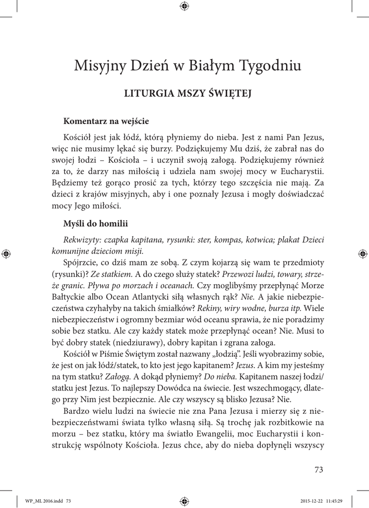 Misyjny Dzień w Białym Tygodniu LITURGIA MSZY ŚWIĘTEJ Komentarz na wejście Kościół jest jak łódź, którą płyniemy do nieba. Jest z nami Pan Jezus, więc nie musimy lękać się burzy. Podziękujemy Mu dziś, że zabrał nas do swojej łodzi – Kościoła – i uczynił swoją załogą. Podziękujemy również za to, że darzy nas miłością i udziela nam swojej mocy w Eucharystii. Będziemy też gorąco prosić za tych, którzy tego szczęścia nie mają. Za dzieci z krajów misyjnych, aby i one poznały Jezusa i mogły doświadczać mocy Jego miłości. Myśli do homilii Rekwizyty: czapka kapitana, rysunki: ster, kompas, kotwica; plakat Dzieci komunijne dzieciom misji. Spójrzcie, co dziś mam ze sobą. Z czym kojarzą się wam te przedmioty (rysunki)? Ze statkiem. A do czego służy statek? Przewozi ludzi, towary, strzeże granic. Pływa po morzach i oceanach. Czy moglibyśmy przepłynąć Morze Bałtyckie albo Ocean Atlantycki siłą własnych rąk? Nie. A jakie niebezpieczeństwa czyhałyby na takich śmiałków? Rekiny, wiry wodne, burza itp. Wiele niebezpieczeństw i ogromny bezmiar wód oceanu sprawia, że nie poradzimy sobie bez statku. Ale czy każdy statek może przepłynąć ocean? Nie. Musi to być dobry statek (niedziurawy), dobry kapitan i zgrana załoga. Kościół w Piśmie Świętym został nazwany „łodzią”. Jeśli wyobrazimy sobie, że jest on jak łódź/statek, to kto jest jego kapitanem? Jezus. A kim my jesteśmy na tym statku? Załogą. A dokąd płyniemy? Do nieba. Kapitanem naszej łodzi/ statku jest Jezus. To najlepszy Dowódca na świecie. Jest wszechmogący, dlatego przy Nim jest bezpiecznie. Ale czy wszyscy są blisko Jezusa? Nie. Bardzo wielu ludzi na świecie nie zna Pana Jezusa i mierzy się z niebezpieczeństwami świata tylko własną siłą. Są trochę jak rozbitkowie na morzu – bez statku, który ma światło Ewangelii, moc Eucharystii i konstrukcję wspólnoty Kościoła. Jezus chce, aby do nieba dopłynęli wszyscy 73 WP_ML 2016.indd 73 2015-12-22 11:45:29 ludzie, dlatego prosi swoją załogę, by była Jego oczami i wypatrywała „rozbitków”. Spójrzcie na wasz komunijny obrazek (lub plakat). Co na nim widzicie? Przedstawia łódź. W łodzi jest Jezus, a wokół Niego dzieci komunijne, które wypatrują i pomagają wsiąść na łódź innym dzieciom. To jest właśnie to, co dziś robicie dla swoich rówieśników w krajach misyjnych. Wypatrujecie ich. Płyniecie do nich z pomocą. Rzucacie im koło ratunkowe. Dzielicie się tym, co sami otrzymaliście – wiarą, przyjaźnią, szkołą i domem. Jak to się dzieje? Każda wasza modlitwa, każdy grosz i gest dobroci pomaga dzieciom na Madagaskarze, w Burkina Faso czy w Indiach wsiąść do łodzi Jezusa. Dzięki wam ta łódź, czyli Kościół, będzie mogła otoczyć dzieci opieką, leczyć, karmić i posłać do szkoły, aby stały się lekarzami, inżynierami, nauczycielami, misjonarzami – dobrymi ludźmi, którzy niosą pokój i dobro, budują lepszy świat. Może niektórzy z was będą chcieli tak robić dłużej? Może któreś z was odkryje w sobie misyjne powołanie do wypatrywania tonących małych rozbitków – dzieci-żołnierzy, dzieli-ulicy, dzieci-niewolników? Zachęcam was do modlitwy za te dzieci i do niesienia im pomocy, bo to jest naśladowanie miłosiernego Jezusa. Modlitwa wiernych Otwórzmy serca na potrzeby naszych rówieśników w krajach misyjnych i przedstawmy Bogu Ojcu nasze prośby. – Za Ojca Świętego Franciszka, aby Jego nauczanie i świadectwo życia było dla wszystkich wzorem troski o ubogich i cierpiących. Ciebie prosimy... – Za wszystkich chrześcijan, aby byli świadomi odpowiedzialności za braci i siostry z krajów misyjnych i w duchu miłosierdzia wspierali dzieła misyjne. Ciebie prosimy... – Za dzieci na wszystkich kontynentach, aby mogły chodzić do szkoły i żyć otoczone miłością rodziny, wolne od grozy wojny, nędzy i niesprawiedliwości. Ciebie prosimy... – Za misjonarzy i misjonarki, a także za dzieci zrzeszone w Papieskim Dziele Misyjnym, za ich wychowawców, rodziny i przyjaciół, aby z odwagą i mocą dzielili się wiarą, nieśli pokój i nadzieję. Ciebie prosimy... – Za zmarłych misjonarzy i misjonarki, którzy oddali życie najbiedniejszym i nieznającym Jezusa, aby dobry Bóg przyjął ich do swojego królestwa w niebie. Ciebie prosimy... 74 WP_ML 2016.indd 74 2015-12-22 11:45:29 – Za nas tu zgromadzonych, abyśmy codziennie pogłębiali swoją przyjaźń z Jezusem, a ludziom okazywali miłosierdzie. Ciebie prosimy... Boże Ojcze, spójrz z miłością na wszystkie dzieci świata i obdarz je tym, czego najbardziej potrzebują. Przez Chrystusa, Pana naszego. Amen. Procesja z darami W dniu, kiedy łączymy się z naszymi rówieśnikami w krajach misyjnych, z miłością i czystymi sercami przynosimy do ołtarza nasze dary: Kopertki misyjne z ofiarami dla dzieci w krajach misyjnych. Przez Papieskie Dzieło Misyjne dzielimy się z nimi tym, co mamy, aby i one poznały Jezusa i znalazły schronienie w łodzi Kościoła. Chleb i wino, które za chwilę staną się Ciałem i Krwią Pana Jezusa. To nasz duchowy pokarm, który nas łączy i dodaje sił, abyśmy byli misjonarzami Jezusa w każdym miejscu i w każdym czasie. Opracowała s. Celina Torończak CSSH, Kwielice, diec. zielonogórsko-gorzowska 75 WP_ML 2016.indd 75 2015-12-22 11:45:30
