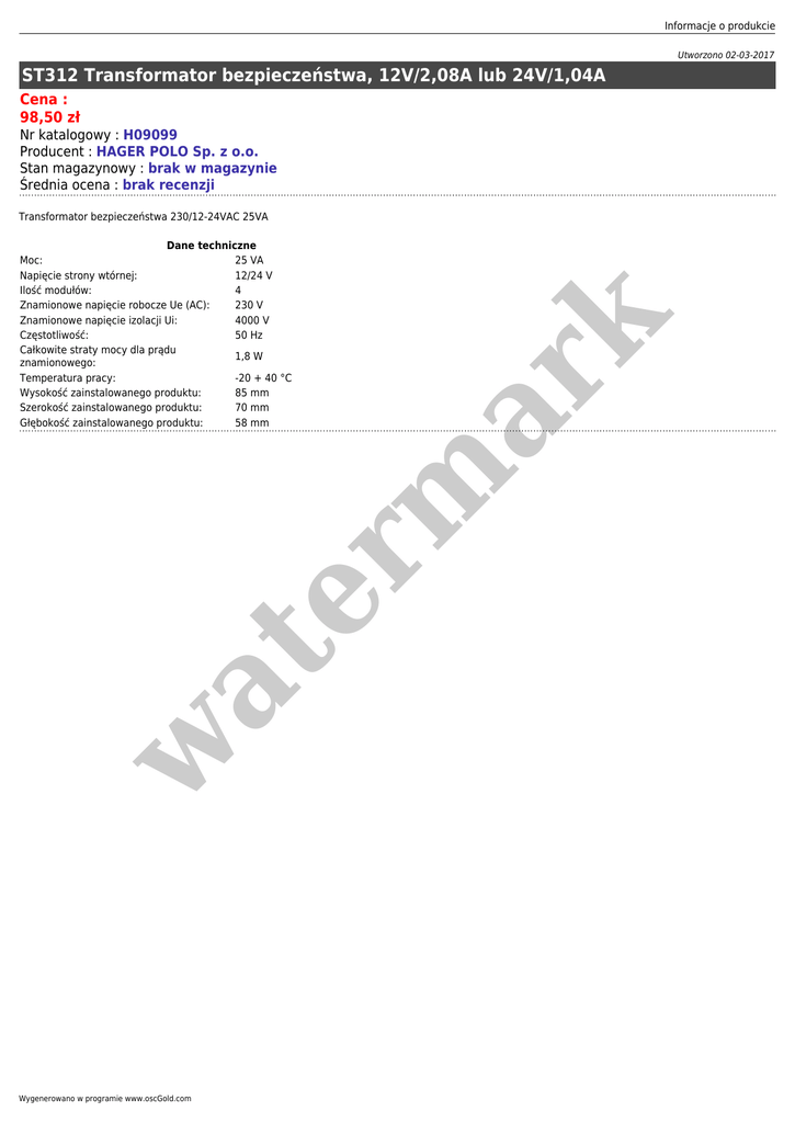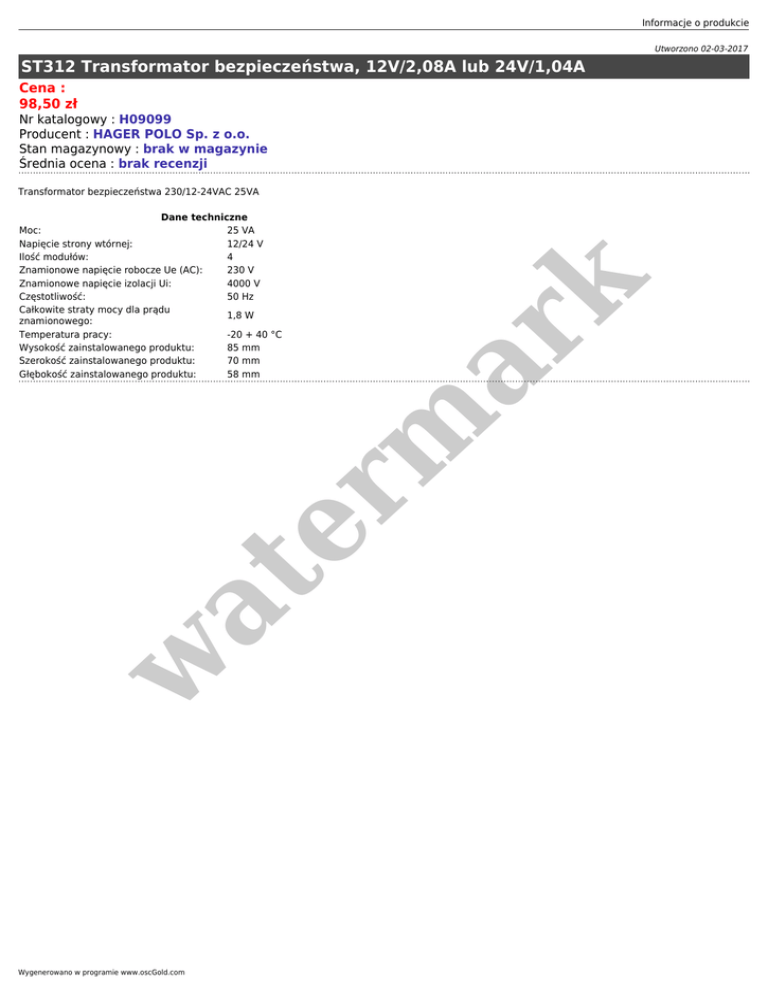 Informacje o produkcie Utworzono 02-03-2017 ST312 Transformator bezpieczeństwa, 12V/2,08A lub 24V/1,04A Cena : 98,50 zł Nr katalogowy : H09099 Producent : HAGER POLO Sp. z o.o. Stan magazynowy : brak w magazynie Średnia ocena : brak recenzji Transformator bezpieczeństwa 230/12-24VAC 25VA w at er m ar k Dane techniczne Moc: 25 VA Napięcie strony wtórnej: 12/24 V Ilość modułów: 4 Znamionowe napięcie robocze Ue (AC): 230 V Znamionowe napięcie izolacji Ui: 4000 V Częstotliwość: 50 Hz Całkowite straty mocy dla prądu 1,8 W znamionowego: Temperatura pracy: -20 + 40 °C Wysokość zainstalowanego produktu: 85 mm Szerokość zainstalowanego produktu: 70 mm Głębokość zainstalowanego produktu: 58 mm Wygenerowano w programie www.oscGold.com