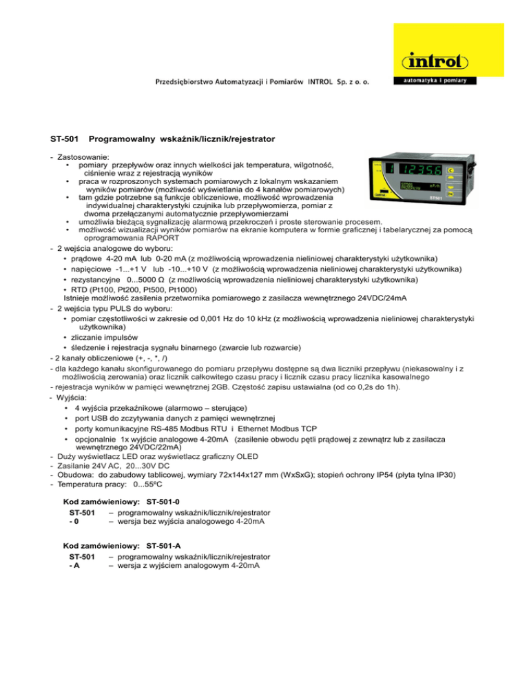 ST-501 Programowalny wskaźnik/licznik/rejestrator - Zastosowanie: • pomiary przepływów oraz innych wielkości jak temperatura, wilgotność, ciśnienie wraz z rejestracją wyników • praca w rozproszonych systemach pomiarowych z lokalnym wskazaniem wyników pomiarów (możliwość wyświetlania do 4 kanałów pomiarowych) • tam gdzie potrzebne są funkcje obliczeniowe, możliwość wprowadzenia indywidualnej charakterystyki czujnika lub przepływomierza, pomiar z dwoma przełączanymi automatycznie przepływomierzami • umożliwia bieżącą sygnalizację alarmową przekroczeń i proste sterowanie procesem. • możliwość wizualizacji wyników pomiarów na ekranie komputera w formie graficznej i tabelarycznej za pomocą oprogramowania RAPORT - 2 wejścia analogowe do wyboru: • prądowe 4-20 mA lub 0-20 mA (z możliwością wprowadzenia nieliniowej charakterystyki użytkownika) • napięciowe -1...+1 V lub -10...+10 V (z możliwością wprowadzenia nieliniowej charakterystyki użytkownika) • rezystancyjne 0...5000 Ω (z możliwością wprowadzenia nieliniowej charakterystyki użytkownika) • RTD (Pt100, Pt200, Pt500, Pt1000) Istnieje możliwość zasilenia przetwornika pomiarowego z zasilacza wewnętrznego 24VDC/24mA - 2 wejścia typu PULS do wyboru: • pomiar częstotliwości w zakresie od 0,001 Hz do 10 kHz (z możliwością wprowadzenia nieliniowej charakterystyki użytkownika) • zliczanie impulsów • śledzenie i rejestracja sygnału binarnego (zwarcie lub rozwarcie) - 2 kanały obliczeniowe (+, -, *, /) - dla każdego kanału skonfigurowanego do pomiaru przepływu dostępne są dwa liczniki przepływu (niekasowalny i z możliwością zerowania) oraz licznik całkowitego czasu pracy i licznik czasu pracy licznika kasowalnego - rejestracja wyników w pamięci wewnętrznej 2GB. Częstość zapisu ustawialna (od co 0,2s do 1h). - Wyjścia: • 4 wyjścia przekaźnikowe (alarmowo – sterujące) • port USB do zczytywania danych z pamięci wewnętrznej • porty komunikacyjne RS-485 Modbus RTU i Ethernet Modbus TCP • opcjonalnie 1x wyjście analogowe 4-20mA (zasilenie obwodu pętli prądowej z zewnątrz lub z zasilacza wewnętrznego 24VDC/22mA) - Duży wyświetlacz LED oraz wyświetlacz graficzny OLED - Zasilanie 24V AC, 20...30V DC - Obudowa: do zabudowy tablicowej, wymiary 72x144x127 mm (WxSxG); stopień ochrony IP54 (płyta tylna IP30) - Temperatura pracy: 0...55ºC Kod zamówieniowy: ST-501-0 ST-501 – programowalny wskaźnik/licznik/rejestrator -0 – wersja bez wyjścia analogowego 4-20mA Kod zamówieniowy: ST-501-A ST-501 – programowalny wskaźnik/licznik/rejestrator -A – wersja z wyjściem analogowym 4-20mA DANE TECHNICZNE : Oprogramowanie ,,RAPORT” Podstawowy program do analizy i wizualizacji danych pomiarowych z ST-501, dostarczany bezpłatnie razem z urządzeniem. Umożliwia: - przeglądanie wyników zarchiwizowanych w formie graficznej (wykresy) i tabelarycznej, - wydrukowanie wykresów. Oprogramowanie ,,RAPORT PLUS” Rozszerzony program do analizy i wizualizacji danych pomiarowych z ST-501. Program dostępny jest dla użytkowników posiadających kod aktywacyjny. Program z prawidłowym kodem aktywacyjnym jest programem z licencją do pracy na jednym stanowisku komputerowym. Dodatkowe funkcje w programie ,,Raport Plus” w porównaniu do podstawowego oprogramowania ,,Raport”: - przy otwieraniu pliku danych zapisanego na dysku komputera istnieje możliwość podziału wykresu na ekrany o zadanej ilości punków, - podgląd online (RS485/Modbus RTU lub Ethernet/Modbus TCP) danych bieżących (tabela, wykres, wizualizacja), - wyznaczanie średnie / maksima / minima miesięczne, dobowe, godzinowe i minutowe, - wyszukiwanie rekordów od daty do daty, - wyszukiwanie wartości mniejszych / większych / z przedziału / spoza przedziału.