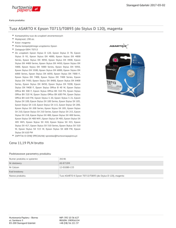 Starogard Gdański 2017-03-02 Karta produktu: Tusz ASARTO K Epson T0713/T0893 (do Stylus D 120), magenta Kompatybilny tusz do urządzeń atramentowych Wydajność: 290 str. Kolor: magenta Marka kompatybilnego urządzenia: Epson Zastępuje OEM: T0713 Do urządzeń: Epson Stylus D 120, Epson Stylus D 78, Epson Stylus D 92, Epson Stylus DX 4000, Epson Stylus DX 4000 Series, Epson Stylus DX 4050, Epson Stylus DX 4400, Epson Stylus DX 4400 Series, Epson Stylus DX 4450, Epson Stylus DX 5000, Epson Stylus DX 5000 Series, Epson Stylus DX 5050, Epson Stylus DX 5500, Epson Stylus DX 6000, Epson Stylus DX 6000 Series, Epson Stylus DX 6050, Epson Stylus DX 7000 F, Epson Stylus DX 7400, Epson Stylus DX 7400 Series, Epson Stylus DX 7450, Epson Stylus DX 8400, Epson Stylus DX 8400 Series, Epson Stylus DX 8450, Epson Stylus DX 9200, Epson Stylus DX 9400 F, Epson Stylus Office B 40 W, Epson Stylus Office BX 300 F, Epson Stylus Office BX 310 FN, Epson Stylus Office BX 510 W, Epson Stylus Office BX 600 FW, Epson Stylus Office BX 610 FW, Epson Stylus S 20, Epson Stylus S 21, Epson Stylus SX 100, Epson Stylus SX 100 Series, Epson Stylus SX 105, Epson Stylus SX 110, Epson Stylus SX 115, Epson Stylus SX 200, Epson Stylus SX 200 Series, Epson Stylus SX 205, Epson Stylus SX 210, Epson Stylus SX 210 Series, Epson Stylus SX 215, Epson Stylus SX 218, Epson Stylus SX 400, Epson Stylus SX 400 Series, Epson Stylus SX 400 WiFi, Epson Stylus SX 405, Epson Stylus SX 405 WiFi, Epson Stylus SX 410, Epson Stylus SX 415, Epson Stylus SX 417, Epson Stylus SX 510 Series, Epson Stylus SX 510 W, Epson Stylus SX 515 W, Epson Stylus SX 600 FW, Epson Stylus SX 610 FW ZAPYTAJ O CENĘ SPECJALNĄ! [email protected] Cena 11,19 PLN brutto Podstawowe parametry produktu Numer produktu w systemie 26146 Nr dostawcy AS-E713M Nr Celcen 12-01088-133 Kod kreskowy Nazwa produktu Tusz ASARTO K Epson T0713/T0893 (do Stylus D 120), magenta Hurtowania Papieru - Borma ul. Sambora 3 83-200 Starogard Gdański NIP: 592 10 36 627 REGON: 190916154 +48 (58) 56 221 37 Starogard Gdański 2017-03-02 Karta katalogowa produktu cd. Tusz ASARTO K Epson T0713/T0893 (do Stylus D 120), magenta Opis Kompatybilny tusz do urządzeń atramentowych; wydajność: 290 str.; kolor: magenta; marka kompatybilnego urządzenia: Epson; zastępuje OEM: T0713; do urządzeń: Epson Stylus D 120, Epson Stylus D 78, Epson Stylus D 92, Epson Stylus DX 4000, Epson Stylus DX 4000 Series, Epson Stylus DX 4050, Epson Stylus DX 4400, Epson Stylus DX 4400 Series, Epson Stylus DX 4450, Epson Stylus DX 5000, Epson Stylus DX 5000 Series, Epson Stylus DX 5050, Epson Stylus DX 5500, Epson Stylus DX 6000, Epson Stylus DX 6000 Series, Epson Stylus DX 6050, Epson Stylus DX 7000 F, Epson Stylus DX 7400, Epson Stylus DX 7400 Series, Epson Stylus DX 7450, Epson Stylus DX 8400, Epson Stylus DX 8400 Series, Epson Stylus DX 8450, Epson Stylus DX 9200, Epson Stylus DX 9400 F, Epson Stylus Office B 40 W, Epson Stylus Office BX 300 F, Epson Stylus Office BX 310 FN, Epson Stylus Office BX 510 W, Epson Stylus Office BX 600 FW, Epson Stylus Office BX 610 FW, Epson Stylus S 20, Epson Stylus S 21, Epson Stylus SX 100, Epson Stylus SX 100 Series, Epson Stylus SX 105, Epson Stylus SX 110, Epson Stylus SX 115, Epson Stylus SX 200, Epson Stylus SX 200 Series, Epson Stylus SX 205, Epson Stylus SX 210, Epson Stylus SX 210 Series, Epson Stylus SX 215, Epson Stylus SX 218, Epson Stylus SX 400, Epson Stylus SX 400 Series, Epson Stylus SX 400 WiFi, Epson Stylus SX 405, Epson Stylus SX 405 WiFi, Epson Stylus SX 410, Epson Stylus SX 415, Epson Stylus SX 417, Epson Stylus SX 510 Series, Epson Stylus SX 510 W, Epson Stylus SX 515 W, Epson Stylus SX 600 FW, Epson Stylus SX 610 FW; ZAPYTAJ O CENĘ SPECJALNĄ! [email protected] Kategoria Tusze Marka ASARTO Cecha Produkt Epson Typ Kompatybilny Wspólny słownik zamówień CPV 30192113-6 Wkłady drukujące Certyfikaty Ilość lat gwarancji 10 Nowy produkt w ofercie Standard Hit Standard Zastosowanie Zastosowanie Do urządzeń atramentowych Kolor Kolor Magenta Hurtowania Papieru - Borma ul. Sambora 3 83-200 Starogard Gdański NIP: 592 10 36 627 REGON: 190916154 +48 (58) 56 221 37 Starogard Gdański 2017-03-02 Serdecznie zapraszamy do współpracy Hurtowania Papieru - Borma zespół. Hurtowania Papieru - Borma ul. Sambora 3 83-200 Starogard Gdański NIP: 592 10 36 627 REGON: 190916154 +48 (58) 56 221 37