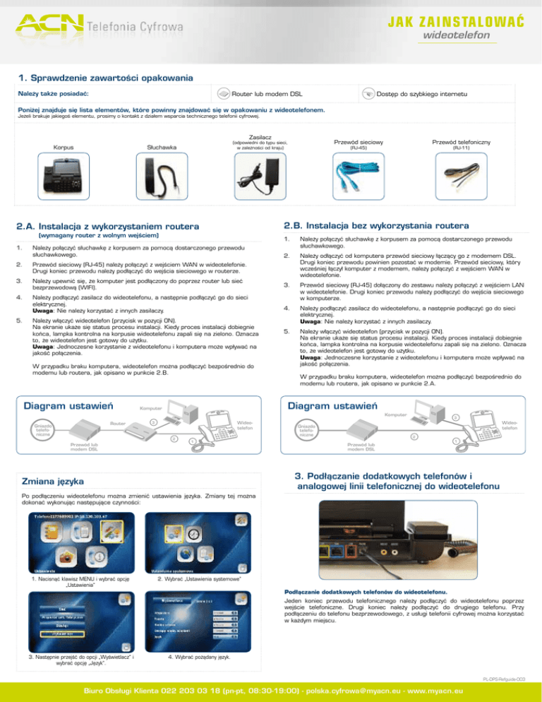 Jak zainstalować wideotelefon 1. Sprawdzenie zawartości opakowania Należy także posiadać: Router lub modem DSL Dostęp do szybkiego internetu Poniżej znajduje się lista elementów, które powinny znajdować się w opakowaniu z wideotelefonem. Jeżeli brakuje jakiegoś elementu, prosimy o kontakt z działem wsparcia technicznego telefonii cyfrowej. Zasilacz Korpus Przewód sieciowy (odpowiedni do typu sieci, w zależności od kraju) Słuchawka Przewód telefoniczny (RJ-45) (RJ-11) 2.B. Instalacja bez wykorzystania routera 2.A. Instalacja z wykorzystaniem routera (wymagany router z wolnym wejściem) 1. Należy połączyć słuchawkę z korpusem za pomocą dostarczonego przewodu słuchawkowego. 2. Należy upewnić się, że komputer jest podłączony do poprzez router lub sieć bezprzewodową (WIFI). Należy odłączyć od komputera przewód sieciowy łączący go z modemem DSL. Drugi koniec przewodu powinien pozostać w modemie. Przewód sieciowy, który wcześniej łączył komputer z modemem, należy połączyć z wejściem WAN w wideotelefonie. 3. 4. Należy podłączyć zasilacz do wideotelefonu, a następnie podłączyć go do sieci elektrycznej. Uwaga: Nie należy korzystać z innych zasilaczy. Przewód sieciowy (RJ-45) dołączony do zestawu należy połączyć z wejściem LAN w wideotelefonie. Drugi koniec przewodu należy podłączyć do wejścia sieciowego w komputerze. 4. 5. ależy włączyć wideotelefon (przycisk w pozycji ON). N Na ekranie ukaże się status procesu instalacji. Kiedy proces instalacji dobiegnie końca, lampka kontrolna na korpusie wideotelefonu zapali się na zielono. Oznacza to, że wideotelefon jest gotowy do użytku. Uwaga: Jednoczesne korzystanie z wideotelefonu i komputera może wpływać na jakość połączenia. Należy podłączyć zasilacz do wideotelefonu, a następnie podłączyć go do sieci elektrycznej. Uwaga: Nie należy korzystać z innych zasilaczy. 5. Należy włączyć wideotelefon (przycisk w pozycji ON). Na ekranie ukaże się status procesu instalacji. Kiedy proces instalacji dobiegnie końca, lampka kontrolna na korpusie wideotelefonu zapali się na zielono. Oznacza to, że wideotelefon jest gotowy do użytku. Uwaga: Jednoczesne korzystanie z wideotelefonu i komputera może wpływać na jakość połączenia. 1. Należy połączyć słuchawkę z korpusem za pomocą dostarczonego przewodu słuchawkowego. 2. Przewód sieciowy (RJ-45) należy połączyć z wejściem WAN w wideotelefonie. Drugi koniec przewodu należy podłączyć do wejścia sieciowego w routerze. 3. W przypadku braku komputera, wideotelefon można podłączyć bezpośrednio do modemu lub routera, jak opisano w punkcie 2.B. Diagram ustawień W przypadku braku komputera, wideotelefon można podłączyć bezpośrednio do modemu lub routera, jak opisano w punkcie 2.A. Diagram ustawień Komputer Komputer Router Gniazdo telefoniczne Wideotelefon 3 2 Przewód lub modem DSL 1 3 Wideotelefon Gniazdo telefoniczne 2 Przewód lub modem DSL 1 3. Podłączanie dodatkowych telefonów i analogowej linii telefonicznej do wideotelefonu Zmiana języka Po podłączeniu wideotelefonu można zmienić ustawienia języka. Zmiany tej można dokonać wykonując następujące czynności: 1. Nacisnąć klawisz MENU i wybrać opcję „Ustawienia” 2. Wybrać „Ustawienia systemowe” Podłączanie dodatkowych telefonów do wideotelefonu. eden koniec przewodu telefonicznego należy podłączyć do wideotelefonu poprzez J wejście telefoniczne. Drugi koniec należy podłączyć do drugiego telefonu. Przy podłączeniu do telefonu bezprzewodowego, z usługi telefonii cyfrowej można korzystać w każdym miejscu. 3. Następnie przejść do opcji „Wyświetlacz” i wybrać opcję „Język”. 4. Wybrać pożądany język. PL-DPS-Refguide-003 Biuro Obsługi Klienta 022 203 03 18 (pn-pt, 08:30-19:00) - [email protected] - www.myacn.eu Jak zainstalować wideotelefon Przód REGISTER Wykonywanie połączeń POWER Wykonywanie połączeń za pomocą 1 :@/ 4 GHI wideotelefonu jest bardzo proste. 2 ABC 3 DEF 5 JKL 6 MNO Jeśli chcą Państwo wykonać połączenie głosowe lub wideo, wystarczy podnieść słuchawkę, wybrać numer i nacisnąć zielony klawisz 7 8 PQRS 9 TUV . Aby rozmówca nie mógł nas widzieć, należy nacisnąć WXYZ klawisz “Prywatność” * 0 . # . -._ Register Zielone światło wskazuje, że wideotelefon jest podłączony do usługi telefonii cyfrowej ACN. 2 Power Wskazuje, czy telefon jest włączony. 16 Ok Przycisk potwierdzający. Przy pierwszym sprawdzeniu skrzynki 3 Poczta Pozwala na odtworzenie wiadomości głosowych/wideo. 17 W dół W dół. domyślne hasło 1234. Następnie, 4 Hold Pozwala na zwieszenie połączenia. 18 W lewo W lewo. 5 Opcja „mute” Uruchamia opcję “Mute” – wyłączenie transmisji dźwięku i obrazu. 19 W prawo W prawo. 20 Status 6 Kontakty Umożliwia dostęp do listy kontaktów. Pokazuje informacje techniczne, np. konfigurację oraz wersję oprogramowania. 7 Poł. Konf. Pozwala na uruchomienie opcji połączenia konferencyjnego. 8 Prywatność Uruchamia opcję “Prywatność” – wyłączenie transmisji obrazu podczas połączenia. 9 * Klawisz “*”. 14 Zawartość Pokazuje zawartość. 15 Do góry Do góry. Ustawienia poczty głosowej 1 21 Znaki 1. Prosimy nacisnąć klawisz „ ”. odbiorczej należy wprowadzić zgodnie z instrukcjami, należy wprowadzić własne hasło. Następnie należy wprowadzić ustawienia dla swojej skrzynki. Pozwala na zastosowanie wielkich liter podczas wpisywania wiadomości. Zmienia ustawienia klawiatury numerycznej na znaki, małe lub wielkie litery. 22 Moje aplikacje Pokazuje listę dostępnych aplikacji. 23 Redial Pozwala na ponowne połączenie z ostatnio wybieranym numerem. 24 Głośnik Uaktywnia/dezaktywuje opcję głośnomówiącą. 25 Połącz Pozwala na połączenie z wybranym numerem. 2. Aby odsłuchać swoje wiadomości należy nacisnąć „1”. 3. Więcej informacji na temat wiadomości wi