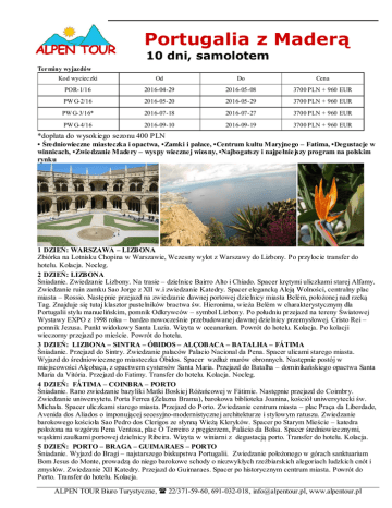Portugalia z Maderą 10 dni, samolotem Terminy wyjazdów Kod wycieczki Od Do Cena POR-1/16 2016-04-29 2016-05-08 3700 PLN + 960 EUR PW G-2/16 2016-05-20 2016-05-29 3700 PLN + 960 EUR PW G-3/16* 2016-07-18 2016-07-27 3700 PLN + 960 EUR PW G-4/16 2016-09-10 2016-09-19 3700 PLN + 960 EUR *dopłata do wysokiego sezonu 400 PLN • Średniowieczne miasteczka i opactwa, •Zamki i pałace, •Centrum kultu Maryjnego – Fatima, •Degustacje w winnicach, •Zwiedzanie Madery – wyspy wiecznej wiosny, •Najbogatszy i najpełniejszy program na polskim rynku 1 DZIEŃ: WARSZAWA – LIZBONA Zbiórka na Lotnisku Chopina w Warszawie, Wczesny wylot z Warszawy do Lizbony. Po przylocie transfer do hotelu. Kolacja. Nocleg. 2 DZIEŃ: LIZBONA Śniadanie. Zwiedzanie Lizbony. Na trasie – dzielnice Bairro Alto i Chiado. Spacer krętymi uliczkami starej Alfamy. Zwiedzanie ruin zamku Sao Jorge z XII w.i zwiedzanie Katedry. Spacer elegancką Aleją Wolności, centralny plac miasta – Rossio. Następnie przejazd na zwiedzanie dawnej portowej dzielnicy miasta Belém, położonej nad rzeką Tag. Znajduje się tutaj klasztor pustelników bractwa św. Hieronima, wieża Belém w charakterystycznym dla Portugalii stylu manuelińskim, pomnik Odkrywców – symbol Lizbony. Po południu przejazd na tereny Światowej Wystawy EXPO z 1998 roku – bardzo nowocześnie przebudowanej dawnej dzielnicy przemysłowej. Cristo Rei – pomnik Jezusa. Punkt widokowy Santa Luzia. Wizyta w oceanarium. Powrót do hotelu. Kolacja. Po kolacji wieczorny przejazd po mieście. Powrót do hotelu. 3 DZIEŃ: LIZBONA – SINTRA – ÓBIDOS – ALÇOBACA – BATALHA – FÁTIMA Śniadanie. Przejazd do Sintry. Zwiedzanie pałaców Palacio Nacional da Pena. Spacer ulicami starego miasta. Wyjazd do średniowiecznego miasteczka Óbidos. Spacer wzdłuż murów obronnych. Następnie postój w miejscowości Alçobaça, z opactwem cystersów Santa Maria. Przejazd do Batalha – dominikańskiego opactwa Santa Maria da Vitória. Przejazd do Fatimy. Transfer do hotelu. Kolacja. Nocleg. 4 DZIEŃ: FÁTIMA – COINBRA – PORTO Śniadanie. Rano zwiedzanie bazyliki Matki Boskiej Różańcowej w Fátimie. Następnie przejazd do Coimbry. Zwiedzanie uniwersytetu. Porta Ferrea (Żelazna Brama), barokowa biblioteka Joanina, kościół uniwersytecki św. Michała. Spacer uliczkami starego miasta. Przejazd do Porto. Zwiedzanie centrum miasta – plac Praça da Liberdade, Avenida dos Aliados o imponującej secesyjno-modernistycznej architekturze i stylowym ratuszu. Zwiedzanie barokowego kościoła Sao Pedro dos Clerigos ze słynną Wieżą Kleryków. Spacer po Starym Mieście – katedra położona na wzgórzu Pena Ventosa, plac O Terreiro z pręgierzem, Palácio da Bolsa. Spacer średniowiecznymi, wąskimi zaułkami portowej dzielnicy Ribeira. Wizyta w winiarni z degustacją porto. Transfer do hotelu. Kolacja. 5 DZIEŃ: PORTO – BRAGA – GUIMARAES – PORTO Śniadanie. Wyjazd do Bragi – najstarszego biskupstwa Portugalii. Zwiedzanie położonego w górach sanktuarium Bom Jesus do Monte, prowadzą do niego barokowe schody o niezwykłych rzeźbiarskich alegoriach ludzkich cnót i zmysłów. Zwiedzanie XII Katedry. Przejazd do Guimaraes. Spacer po historycznym centrum miasta. Powrót do Porto. Transfer do hotelu. Kolacja. ALPEN TOUR Biuro Turystyczne, 22/371-59-60, 691-032-018, [email protected], www.alpentour.pl 6 DZIEŃ: PORTO – AVEIRO – TOMAR – LIZBONA Śniadanie. Przejazd i zwiedzanie Aveiro, miasta poprzecinanego siecią kanałów. Przejazd do Tomar. Zwiedzanie twierdzy tak potężnej jak zakon, do którego należała – Templariuszy, którzy w XIV wieku zostali przez króla Portugalii przemianowani na Zakon Chrystusowy, podległy zwierzchnictwu korony (lista UNESCO). Krzyż Zakonu widniał na żaglach karawel odkrywających Nowy Świat. Przejazd do Lizbony. Transfer do hotelu. Kolacja. Nocleg. 7 DZIEŃ: WYSPA MADERA Śniadanie. Transfer na lotnisko. Przelot na Maderę, wyspę nazwaną „ogrodem dryfującym po oceania” lub „wyspą wiecznej wiosny”, na której wypoczywał również marszałek Piłsudski (znajduje się tu dom z pamiątkami po marszałku). Po przylocie zwiedzanie stolicy wyspy Funchal. Wizyta w ogrodzie botanicznym, gdzie zobaczymy ponad 2000 gatunków roślin m. in orchidee, kaktusy, azalie, magnolie, palmy. Zwiedzanie katedry. Zwiedzanie zakończy się w winnicy, gdzie po zapoznaniu się z produkcją wina będzie degustacja wina Madera. Przejazd do hotelu. Kolacja. Nocleg. 8 DZIEŃ: WYSPA MADERA Śniadanie. 8-godzinna wycieczka po wschodniej części wyspy. Przejazd na Pico de Arieiro (1818 m n. p. m.) skąd rozciągają się piękne widoki na wyspę. Postój w miejscowości Ribeiro Frio, gdzie można zobaczyć wylęgarnie pstrągów. Dalszy przejazd wzdłuż pięknego skalistego wybrzeża. Na przełęczy Portela postój by podziwiać spektakularne widoki na Zatokę Porto de Cruz. Postój w miejscowości Machio. Powrót do Funchal. Kolacja. 9 DZIEŃ: WYSPA MADERA Śniadanie. 8-godzinne zwiedzanie zachodniej części wyspy. Postój w małej uroczej wiosce rybackiej Camara de Lobos. Następnie przejazd przez plantacje bananowców. Postój w punkcie widokowym na klifie Cabo Girao (580 m n.p.m.) Przejazd doliną Serra d Agua do miejscowości Porto Moniz. Następnie wjazd na wzniesienie Paul da Serra (1500 m n.p.m.) Powrot do Funchal. Kolacja . Nocleg. 10 DZIEŃ : WYSPA MADERA – LIZBONA – WARSZAWA Rano transfer na lotnisko i przelot do Lizbony, a następnie do Warszawy. CENA OBEJMUJE: przelot na trasie Warszawa – Lizbona – Funchal – Warszawa przejazdy mikrobusem zgodnie z programem zakwaterowanie w pokojach dwuosobowych w hotelach 3* Śniadania i kolacje opiekę doświadczonego przewodnika degustacje w winnicach ubezpieczenie CENA NIE OBEJMUJE: biletów wstępu do zwiedzanych obiektów ok. 80 EUR napoi do kolacji, dodatkowych posiłków zwyczajowych napiwków ok. 4 EUR dziennie Dopłata do pokoju jednoosobowego: 190 EUR ALPE