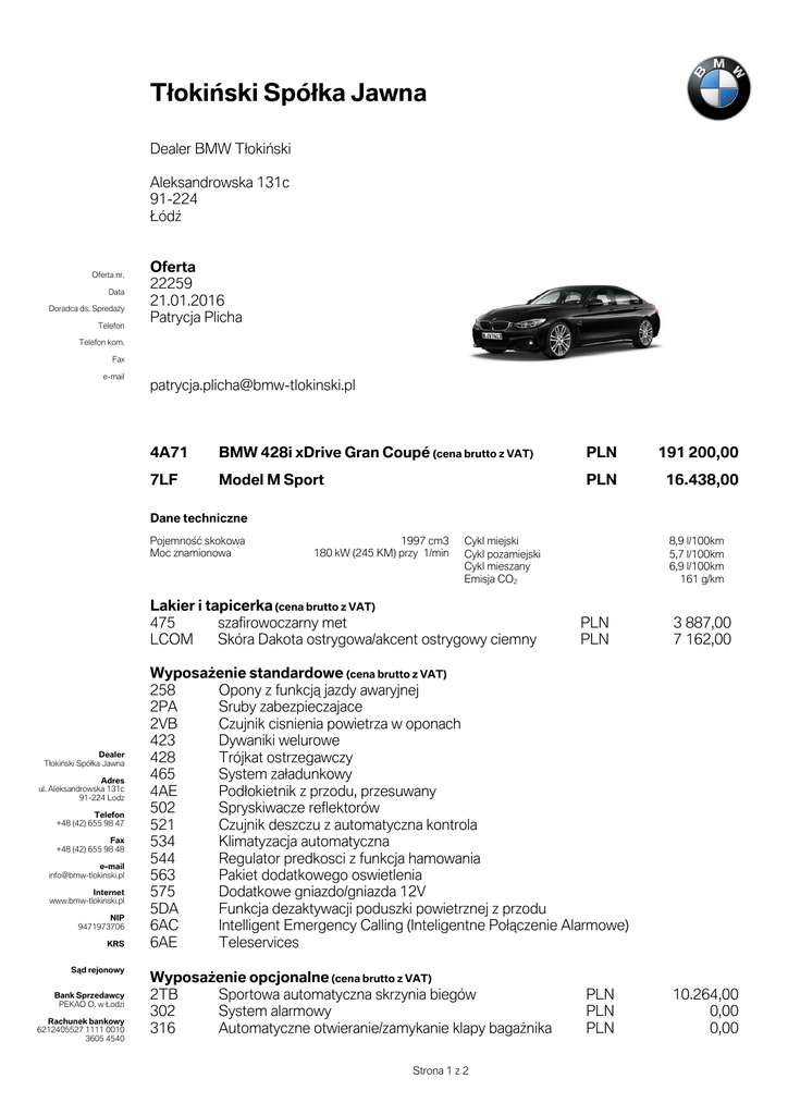 7åRNLĤVNL 6SyåND Jawna Dealer BMW 7æRNLĥVNL Aleksandrowska 131c 91-224 ļyGĵ Oferta nr. Data Doradca ds. 6SUHGDį\ Telefon Oferta 22259 21.01.2016 Patrycja Plicha Telefon kom. Fax e-mail [email protected] 4A71 BMW 428i xDrive Gran Coupé (cena brutto z VAT) PLN 191 200,00 7LF Model M Sport PLN 16.438,00 Dane techniczne 3RMHPQRĬĕ skokowa Moc znamionowa 1997 cm3 180 kW (245 KM) przy 1/min Cykl miejski Cykl pozamiejski Cykl mieszany Emisja CO2 Lakier i tapicerka (cena brutto z VAT) 475 szafirowoczarny met LCOM Skóra Dakota ostrygowa/akcent ostrygowy ciemny Dealer 7æRNLĥVNL 6SyæND Jawna Adres ul. Aleksandrowska 131c 91-224 Lodz Telefon +48 (42) 655 98 47 Fax +48 (42) 655 98 48 e-mail [email protected] Internet www.bmw-tlokinski.pl NIP 9471973706 KRS 6ēG rejonowy Bank Sprzedawcy PEKAO O. w ļRG]L Rachunek bankowy 6212405527 1111 0010 3605 4540 8,9 l/100km 5,7 l/100km 6,9 l/100km 161 g/km PLN PLN 3 887,00 7 162,00 :\SRVDĮenie standardowe (cena brutto z VAT) 258 Opony z IXQNFMĔ jazdy awaryjnej 2PA Sruby zabezpieczajace 2VB Czujnik cisnienia powietrza w oponach 423 Dywaniki welurowe 428 Trójkat ostrzegawczy 465 System ]DæDGXQNRZ\ 4AE 3RGæRNLHWQLN z przodu, przesuwany 502 Spryskiwacze reflektorów 521 Czujnik deszczu z automatyczna kontrola 534 Klimatyzacja automatyczna 544 Regulator predkosci z funkcja hamowania 563 Pakiet dodatkowego oswietlenia 575 Dodatkowe gniazdo/gniazda 12V 5DA Funkcja dezaktywacji poduszki powietrznej z przodu 6AC Intelligent Emergency Calling (Inteligentne 3RæĔF]HQLH Alarmowe) 6AE Teleservices :\SRVDĮHQLH opcjonalne (cena brutto z VAT) 2TB Sportowa automatyczna skrzynia biegów 302 System alarmowy 316 Automatyczne otwieranie/zamykanie klapy EDJDįQLND Strona 1 z 2 PLN PLN PLN 10.264,00 0,00 0,00 Oferta nr. Data Oferta 22259 21.01.2016 3AG 420 430 Kamera cofania Przyciemniana szyba tylna i tylne szyby boczne Lusterka przyciemniane automatycznie, skladane elektrycznie Lusterko wsteczne przyciemniane automatycznie Ogrzewanie foteli przednich Adaptacyjne reflektory diodowe Asystent ĬZLDWHæ drogowych Zestaw JæRĬQLNRZ\ HiFi 19" Obrecze kol ze stopu lekkiego Star Spoke 403 M Sportowe fotele przednie Pakiet dodatkowych schowków Listwy ozdobne aluminium Hexagon z listwa akcentowa w kolorze niebieskim, mat Czujniki parkowania z W\æX i z przodu Kierownica sportowa M, skórzana Pakiet aerodynamiczny M Obramowania BMW Individual Shadow Line czarne na wysoki SRæ\VN Podsufitka Individual w kolorze antracytowym PLN PLN PLN 1.835,00 1.528,00 2.401,00 PLN PLN PLN PLN PLN PLN PLN PLN PLN 0,00 1.616,00 6.944,00 0,00 1.704,00 4 148,00 0,00 0,00 0,00 PLN PLN PLN PLN 873,00 0,00 0,00 0,00 PLN 0,00 Service Inclusive - 5 Jahre/100.000km Polska wersja Mę]\NRZD Polska instrukcja obslugi BMW ConnectedDrive Plus System nawigacyjny Professional ConnectedDrive Services 8VæXJL ConnectedDrive) Real Time Traffic Information Concierge Services (Serwis informacyjny) Remote Services 8VæXJL Zdalne) Internet 3HæQD bezprzewodowa integracja kompatybilnych telefonów komórkowych wraz z USB Deska rozdzielcza o rozszerzonym zakresie PLN PLN PLN PLN PLN PLN PLN PLN PLN PLN PLN 0,00 0,00 0,00 12.861,00 0,00 0,00 0,00 0,00 0,00 0,00 0,00 PLN 0,00 :\SRVDĮenie opcjonalne razem PLN 71 661,00 Cena katalogowa (cena brutto z VAT) PLN 262 861,00 Cena FDåNRZLWD netto (bez VAT) PLN 213 708,14 Total cena brutto z VAT PLN 262 861,00 431 494 552 5AC 676 2PF 481 493 4WF 508 710 715 760 775 7NH 8A1 8AT ZD5 609 6AK 6AM 6AN 6AP 6AR 6NS 6WA Nota prawna Podane ceny VĔ cenami detalicznymi, ]DZLHUDMĔF\PL podatek VAT oraz podatek akcyzowy. Strona 2 z 2 Przykładowa kalkulacja Model. 428i xDrive Gran Coupé Przegląd cen. cena Cena Cena brutto Wyposażenie dodatkowe brutto 191 200,00 PLN 71 661,00 PLN Całkowita cena pojazdu 262 861,00 PLN Przykładowa kalkulacja finansowa. Miesięczna rata brutto 3 329,28 PLN BMW Comfort Lease Decydując się na BMW Comfort Lease zyskujesz możliwość swobodnego wyboru parametrów umowy tak, by była ona najlepiej dostosowana do Twoich oczekiwań. Oferta łączy w sobie zalety podatkowe leasingu operacyjnego z niskim obciążeniem miesięcznym, minimalizację kosztów finansowania pojazdu, gwarancję odkupu i możliwość zmiany samochodu na nowy, po zakończeniu umowy leasingu. Unikatowa konstrukcja BMW Comfort Lease sprawia, że nowe BMW jest teraz także w Twoim zasięgu. Cena z wyposażeniem dodatkowym 262 861,00 zł Opłata wstępna 25,00 % Opłata wstępna 65 715,25 zł Okres leasingu 36 Miesiące Deklarowany średnioroczny przebieg 20 000 km Gwarantowana wartość końcowa 42,90 % Gwarantowana wartość końcowa 112 775,59 zł Miesięczna rata brutto 3 329,28 zł 21.01.16 15:01 BMW Financial Services Polska Przykładowa kalkulacja Warunki finansowania. Parametry finansowania możesz dobrać wedle indywidualnych preferencji. Opłata wstępna od 0% do 35%, okres finansowania 24-60 miesięcy, wartość końcowa uzależniona od długości okresu finansowania oraz deklarowanego, średniorocznego przebiegu w kilometrach. Przykładowa kalkulacja została przygotowana w oparciu o zmienną stawkę WIBOR 1M dla PLN i w przypadku jej zmiany wysokość miesięcznych rat leasingowych może się różnić. Nota prawna. Prezentowane powyżej kwoty zawierają podatek VAT. Przedstawiona propozycja jest niewiążąca i nie stanowi oferty w rozumieniu art. 66 Kodeksu Cywilnego. Niniejsze parametry mają charakter wstępny. Ostateczne warunki zależą od oceny sytuacji finansowo-prawnej Leasingobiorcy oraz zaproponowanej struktury zabezpieczeń i zostaną uregulowane w umowie leasingowej. Po szczegółową ofertę zapraszamy do najbliższego Dealera BMW, gdzie Doradca ds. Finasowania przedstawi kalkulację, dopasowaną do Twoich potrzeb. BMW Comfort Lease jest oferowany w Polsce przez BMW Financial Services Polska Sp. z o.o. 21.01.16 15:01 BMW Financial Services Polska