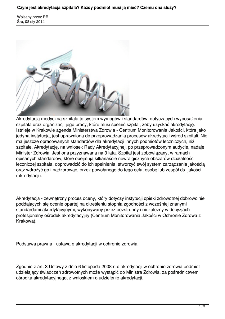 Czym jest akredytacja szpitala? Każdy podmiot musi ją mieć? Czemu ona służy? Wpisany przez RR Śro, 08 sty 2014 Akredytacja medyczna szpitala to system wymogów i standardów, dotyczących wyposażenia szpitala oraz organizacji jego pracy, które musi spełnić szpital, żeby uzyskać akredytację. Istnieje w Krakowie agenda Ministerstwa Zdrowia - Centrum Monitorowania Jakości, która jako jedyna instytucja, jest uprawniona do przeprowadzania procesów akredytacji wśród szpitali. Nie ma jeszcze opracowanych standardów dla akredytacji innych podmiotów leczniczych, niż szpitale. Akredytację, na wniosek Rady Akredytacyjnej, po przeprowadzonym audycie, nadaje Minister Zdrowia. Jest ona przyznawana na 3 lata. Szpital jest zobowiązany, w ramach opisanych standardów, które obejmują kilkanaście newralgicznych obszarów działalności leczniczej szpitala, doprowadzić do ich spełnienia, stworzyć swój system zarządzania jakością oraz wdrożyć go i nadzorować, przez powołanego do tego celu, osobę lub zespół ds. jakości (akredytacji). Akredytacja - zewnętrzny proces oceny, który dotyczy instytucji opieki zdrowotnej dobrowolnie poddających się ocenie opartej na określeniu stopnia zgodności z wcześniej znanymi standardami akredytacyjnymi, wykonywany przez bezstronny i niezależny w decyzjach profesjonalny ośrodek akredytacyjny (Centrum Monitorowania Jakości w Ochronie Zdrowa z Krakowa). Podstawa prawna - ustawa o akredytacji w ochronie zdrowia. Zgodnie z art. 3 Ustawy z dnia 6 listopada 2008 r. o akredytacji w ochronie zdrowia podmiot udzielający świadczeń zdrowotnych może wystąpić do Ministra Zdrowia, za pośrednictwem ośrodka akredytacyjnego, z wnioskiem o udzielenie akredytacji. 1/3 Czym jest akredytacja szpitala? Każdy podmiot musi ją mieć? Czemu ona służy? Wpisany przez RR Śro, 08 sty 2014 Ocena akredytacyjna oparta jest na porównaniu stwierdzonej praktyki postępowania i stanu jednostki z wzorcami, jakie stanowią standardy akredytacyjne oraz dokonaniu oceny stopnia ich spełnienia. Oceny dokonuje Ośrodek Akredytacyjny - Centrum Monitorowania Jakości w Ochronie Zdrowia (CMJ) Standardy akredytacyjne są określane na poziomie optymalnym, tzn. z jednej strony stawiają relatywnie wysokie wymagania, z drugiej strony są osiągalne dla każdej jednostki podejmującej wysiłek wprowadzania zmian w swym funkcjonowaniu. Obecnie funkcjonujące standardy akredytacyjne to: - Program Akredytacji Szpitali - Program Akredytacji Podstawowej Opieki Zdrowotnej Akredytacji udziela Minister Zdrowia, na podstawie rekomendacji Rady Akredytacyjnej, w formie certyfikatu akredytacyjnego, po przeprowadzeniu procedury oceniającej spełnianie standardów akredytacyjnych. Minister Zdrowia może: - przyznać akredytację na okres 3 lat, - odmówić przyznania akredytacji. Certyfikat akredytacyjny stanowi dowód, iż podmiot leczniczy cechuje się wysokim poziomem funkcjonowania oraz dobrą jakością udzielanych świadczeń. To jest odpowiedź na pytanie, czemu akredytacja służy. Akredytacja jest dobrowolna i nie wszyscy muszą ją posiadać. Tym bardziej, że jak na razie została opracowana tylko dla dwóch rodzajów podmiotów leczniczych. Presja, zwłaszcza podmiotów zajmujących się lecznictwem zamkniętym (szpitalnictwem), na uzyskiwanie akredytacji wzrośnie, gdyż płatnik zapowiedział, że w konkursach począwszy do 2015 roku, będzie stosował jako rankingujące, kryteria jakościowe. Certyfikat akredytacyjny będzie więc dawał szpitalowi wyższą ocenę jego oferty, a tym samym dawał szansę na wyższy kontrakt w porównaniu do szpitala, który takowego certyfikatu nie posiada. 2/3 Czym jest akredytacja szpitala? Każdy podmiot musi ją mieć? Czemu ona służy? Wpisany przez RR Śro, 08 sty 2014 Źródło: materiał powstał w ramach projektu "Innowacyjna i sprawna administracja" współfinansowanego ze środków UE w ramach Europejskiego Funduszu Społecznego, a realizowanego przez Związek Powiatów Polskich; autor: Janusz Atłachowicz 3/3
