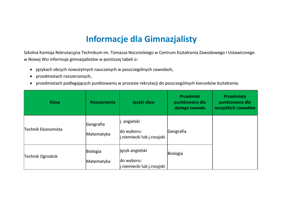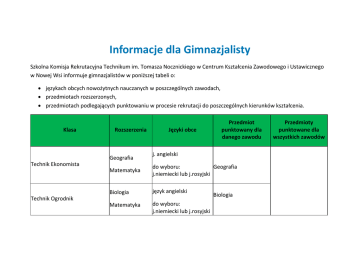 Informacje dla Gimnazjalisty Szkolna Komisja Rekrutacyjna Technikum im. Tomasza Nocznickiego w Centrum Kształcenia Zawodowego i Ustawicznego w Nowej Wsi informuje gimnazjalistów w poniższej tabeli o: językach obcych nowożytnych nauczanych w poszczególnych zawodach, przedmiotach rozszerzonych, przedmiotach podlegających punktowaniu w procesie rekrutacji do poszczególnych kierunków kształcenia. Klasa Rozszerzenia Geografia Technik Ekonomista Języki obce Przedmiot punktowany dla danego zawodu j. angielski Matematyka Geografia do wyboru: j.niemiecki lub j.rosyjski Biologia język angielski Matematyka do wyboru: j.niemiecki lub j.rosyjski Technik Ogrodnik Biologia Przedmioty punktowane dla wszystkich zawodów język polski Biologia język angielski Matematyka Biologia do wyboru: j.niemiecki lub j.rosyjski Technik Architektury Krajobrazu Geografia język angielski Język Angielski Geografia do wyboru: j.niemiecki lub j.rosyjski Geografia język angielski Informatyka do wyboru: j.niemiecki lub j.rosyjski Fizyka j. angielski Matematyka do wyboru: j.niemiecki lub j.rosyjski Biologia j. angielski Język angielski do wyboru: j.niemiecki lub j.rosyjski Geografia j. angielski Język angielski do wyboru: j.niemiecki lub j.rosyjski Technik Obsługi Turystycznej Technik Organizacji Reklamy Technik geodeta Technik Usług Fryzjerskich Technik Spedytor Informatyka Fizyka Biologia Geografia matematyka język obcy nowożytny (w przypadku ocen z dwóch języków obcych nowożytnych – komisja rekrutacyjna wybierze język z którego uczeń ma wyższą ocenę) Terminarz rekrutacji Rodzaj czynności Termin w postępowaniu rekrutacyjnym REKRUTACJA ZASADNICZA Złożenie wniosku o przyjęcie do szkoły ponadgimnazjalnej wraz z dokumentami 1. potwierdzającymi spełnianie przez kandydata warunków lub kryteriów branych pod uwagę w postępowaniu rekrutacyjnym 2. Utworzenie bazy kandydatów 3. Możliwość dokonania zmiany wyboru szkoły od 25 kwietnia 2016 od godz. 9.00 do 29 kwietnia 2016 do godz. 16.00 od 9 maja 2016 od godz. 9.00 do 18 maja 2016 do godz. 16.00 od 9 maja 2016 od godz. 9.00 do 18 maja 2016 do godz. 16.00 od 17 czerwca 2016 od godz. 10.00 do 21 czerwca 2016 do godz. 16.00 4. Uzupełnienie wniosku o przyjęcie do szkoły ponadgimnazjalnej o świadectwo ukończenia gimnazjum oraz o zaświadczenie o wynikach egzaminu gimnazjalnego od 24 czerwca 2016 r. od godz. 11.00 do 28 czerwca 2016 r. do godz. 16.00. Weryfikacja przez komisję rekrutacyjną wniosków o przyjęcie do szkoły ponadgimnazjalnej i dokumentów potwierdzających spełnianie przez kandydata 5. warunków lub kryteriów branych pod uwagę w postępowaniu rekrutacyjnym, w tym dokonanie przez przewodniczącego komisji rekrutacyjnej czynności, o których mowa w art. 20t ust. 7 ustawy do 29 czerwca 2016 r. do godz. 15.00 6. Podanie do publicznej wiadomości przez komisję rekrutacyjną listy kandydatów zakwalifikowanych i kandydatów niezakwalifikowanych 15 lipca 2016 r. do godz. 16.00 Wydanie przez szkołę prowadzącą kształcenie zawodowe skierowania na badanie 7. lekarskie kandydatowi z listy kandydatów zakwalifikowanych, w przypadku złożenia przez kandydata oświadczenia o wyborze tej szkoły od 18 lipca 2016 r. od godz. 9.00 do 19 lipca 2016 r. do godz. 16.00. Potwierdzenie przez rodzica kandydata albo kandydata pełnoletniego woli przyjęcia w postaci przedłożenia oryginału świadectwa ukończenia gimnazjum i oryginału zaświadczenia o wynikach egzaminu gimnazjalnego (o ile nie zostały 8. one złożone w uzupełnieniu wniosku o przyjęcie do szkoły ponadgimnazjalnej), a w przypadku szkoły prowadzącej kształcenie zawodowe - także zaświadczenia lekarskiego zawierającego orzeczenie o braku przeciwwskazań zdrowotnych do podjęcia praktycznej nauki zawodu od 18 lipca 2016 r. od godz. 9.00 do 25 lipca 2016 r. do godz. 16.00. 9. Podanie do publicznej wiadomości przez komisję rekrutacyjną listy kandydatów przyjętych i kandydatów nieprzyjętych 26 lipca 2016 r. do godz. 16.00 10. Poinformowanie przez dyrektora szkoły ponadgimnazjalnej kuratora oświaty o liczbie wolnych miejsc w szkole 26 lipca 2016 r. do godz. 16.00 REKRUTACJA UZUPEŁNIAJĄCA Składanie wniosków o przyjęcie do szkoły ponadgimnazjalnej wraz 1. z dokumentami potwierdzającymi spełnianie warunków lub kryteriów branych pod uwagę w postępowaniu rekrutacyjnym od 27 lipca od godz. 9.00 do 2 sierpnia do godz. 16.00 2. Weryfikacja wniosków o przyjęcie do szkoły i innych złożonych dokumentów przez komisje rekrutacyjne od 3 sierpnia od godz. 9.00 do 5 sierpnia do godz. 16.00 Podanie do wiadomości list kandydatów zakwalifikowanych i kandydatów niezakwalifikowanych zawierające imiona i nazwiska kandydatów uszeregowane 3. w kolejności alfabetycznej oraz informację o zakwalifikowaniu albo niezakwalifikowaniu kandydata, a także najniższą liczbę punktów, która uprawnia do przyjęcia Wydanie przez szkoły prowadzące kształcenie zawodowe skierowania na badanie 4. lekarskie kandydatowi z listy kandydatów zakwalifikowanych, który dokonał wyboru kształcenia w danym zawodzie w jednej szkole, w przypadku złożenia przez kandydata oświadczenia o wyborze tej szkoły Potwierdzenie woli przyjęcia w postaci przedłożenia oryginału świadectwa 5. ukończenia gimnazjum i oryginału zaświadczenia o wynikach egzaminu gimnazjalnego oraz zaświadczenia lekarskiego o braku przeciwwskazań zdrowotnych do podjęcia praktycznej nauki zawodu 6. Podanie przez komisję rekrutacyjną list kandydatów przyjętych i nieprzyjętych 22 sierpnia do godz. 15.00 22 sierpnia od 23 sierpnia od godz. 8.00 do 25 sierpnia do godz. 16.00 26 sierpnia do godz. 16.00 7. Poinformowanie przez dyrektora szkoły ponadgimnazjalnej kuratora oświaty o liczbie wolnych miejsc 26 sierpnia do godz. 16.00 1. Do klasy pierwszej zostaną przyjęci kandydaci, którzy w procesie rekrutacji otrzymają minimum 40 pkt. 2. Jeżeli liczba kandydatów ubiegających się o przyjęc