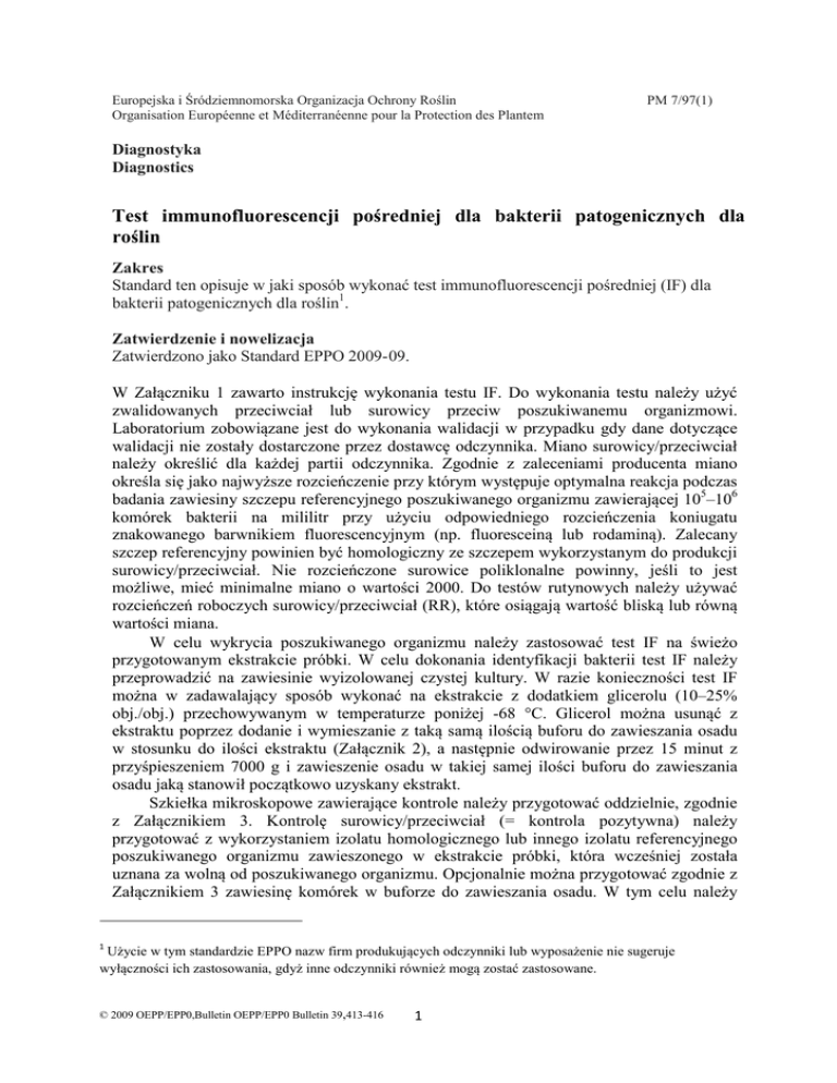 Europejska i Śródziemnomorska Organizacja Ochrony Roślin Organisation Européenne et Méditerranéenne pour la Protection des Plantem PM 7/97(1) Diagnostyka Diagnostics Test immunofluorescencji pośredniej dla bakterii patogenicznych dla roślin Zakres Standard ten opisuje w jaki sposób wykonać test immunofluorescencji pośredniej (IF) dla bakterii patogenicznych dla roślin1. Zatwierdzenie i nowelizacja Zatwierdzono jako Standard EPPO 2009-09. W Załączniku 1 zawarto instrukcję wykonania testu IF. Do wykonania testu należy użyć zwalidowanych przeciwciał lub surowicy przeciw poszukiwanemu organizmowi. Laboratorium zobowiązane jest do wykonania walidacji w przypadku gdy dane dotyczące walidacji nie zostały dostarczone przez dostawcę odczynnika. Miano surowicy/przeciwciał należy określić dla każdej partii odczynnika. Zgodnie z zaleceniami producenta miano określa się jako najwyższe rozcieńczenie przy którym występuje optymalna reakcja podczas badania zawiesiny szczepu referencyjnego poszukiwanego organizmu zawierającej 105–106 komórek bakterii na mililitr przy użyciu odpowiedniego rozcieńczenia koniugatu znakowanego barwnikiem fluorescencyjnym (np. fluoresceiną lub rodaminą). Zalecany szczep referencyjny powinien być homologiczny ze szczepem wykorzystanym do produkcji surowicy/przeciwciał. Nie rozcieńczone surowice poliklonalne powinny, jeśli to jest możliwe, mieć minimalne miano o wartości 2000. Do testów rutynowych należy używać rozcieńczeń roboczych surowicy/przeciwciał (RR), które osiągają wartość bliską lub równą wartości miana. W celu wykrycia poszukiwanego organizmu należy zastosować test IF na świeżo przygotowanym ekstrakcie próbki. W celu dokonania identyfikacji bakterii test IF należy przeprowadzić na zawiesinie wyizolowanej czystej kultury. W razie konieczności test IF można w zadawalający sposób wykonać na ekstrakcie z dodatkiem glicerolu (10–25% obj./obj.) przechowywanym w temperaturze poniżej -68 °C. Glicerol można usunąć z ekstraktu poprzez dodanie i wymieszanie z taką samą ilością buforu do zawieszania osadu w stosunku do ilości ekstraktu (Załącznik 2), a następnie odwirowanie przez 15 minut z przyśpieszeniem 7000 g i zawieszenie osadu w takiej samej ilości buforu do zawieszania osadu jaką stanowił początkowo uzyskany ekstrakt. Szkiełka mikroskopowe zawierające kontrole należy przygotować oddzielnie, zgodnie z Załącznikiem 3. Kontrolę surowicy/przeciwciał (= kontrola pozytywna) należy przygotować z wykorzystaniem izolatu homologicznego lub innego izolatu referencyjnego poszukiwanego organizmu zawieszonego w ekstrakcie próbki, która wcześniej została uznana za wolną od poszukiwanego organizmu. Opcjonalnie można przygotować zgodnie z Załącznikiem 3 zawiesinę komórek w buforze do zawieszania osadu. W tym celu należy 1 Użycie w tym standardzie EPPO nazw firm produkujących odczynniki lub wyposażenie nie sugeruje wyłączności ich zastosowania, gdyż inne odczynniki również mogą zostać zastosowane. © 2009 OEPP/EPP0,Bulletin OEPP/EPP0 Bulletin 39,413-416 1 użyć zamrożone lub zliofilizowane ekstrakty skontaminowane wybranym izolatem. Jeśli to jest możliwe należy użyć na tym samym szkiełku mikroskopowym jako dodatkową kontrolę pozytywną zliofilizowany lub zamrożony w temperaturze -16°C ekstrakt pochodzący z naturalnie zainfekowanej tkanki. Pozwoli to na obserwację w ekstrakcie porażonym w sposób naturalny morfologii komórek bakterii, która może różnić się znacznie od morfologii komórek pochodzących z podłoża hodowlanego, które zostały wykorzystane do sztucznej kontaminacji. Zawiesinę ekstraktu próbki, w której nie stwierdzono obecności poszukiwanego organizmu należy użyć jako kontroli dla testu IF (= kontrola negatywna) (Załącznik 3). Test IF można zastosować także w celu dokonania identyfikacji czystych kultur podejrzanych izolatów bakterii. W tym celu należy przygotować i użyć zawiesinę bakterii o gęstości 106 komórek na mililitr buforu do testu IF (Załącznik 2). Podziękowanie Opis testu IF został opracowany przez P. Muller (JKI, DE), J. Janse (Dutch General Inspection Service, NL) na podstawie Dyrektywy Rady UE dotyczącej zwalczania Ralstonia solanacearum (UE, 1998) oraz Dyrektywy Komisji 2006/63/WE z 14 lipca 2006 zmieniającej Załączniki II do VII do Dyrektywy Rady 98/57/WE dotyczącej zwalczania Ralstonia solanacearum (Smith) Yabuuchi et al.; Dziennik Urzędowy Wspólnoty Europejskiej (UE, 2006). Materiały źródłowe UE (1998) Derektywa Rady 98/57/WE z 20 lipca 1998 dotycząca zwalczania Ralstonia solanacearum Załącznik II – schemat badania diagnostycznego, wykrywania oraz identyfikacji Ralstonia solanacearum (Smith) Yabuuchi et al.; Dziennik Urzędowy Wspólnoty Europejskiej nr L235, 8-39. UE (2006) Dyrektywa Komisji 2006/63/WE z 14 lipca 2006 zmieniająca Załączniki II do VII do Dyrektywy Rady 98/57/WE dotyczącej zwalczania Ralstonia solanacearum (Smith) Yabuuchi et al.; Dziennik Urzędowy Wspólnoty Europejskiej nr L206, 36-106. Załącznik 1 – Instrukcja wykonania testu IF Do testów IF należy użyć wielopunktowych szkiełek mikroskopowych najlepiej z 10 okienkami o średnicy co najmniej 6 mm. Materiał kontrolny należy traktować w taki sam sposób jak próbkę (próbki). 1. Przygotowanie szkiełek Przygotować szkiełka testowe według jednej z następujących procedur. 1.1 Dla ekstraktów roślinnych uzyskanych z próbek zawierających stosunkowo małą ilość osadu skrobi/ zanieczyszczeń: Za pomocą pipety nanieść standardową objętość (objętość 15 µl jest odpowiednia dla szkiełka o średnicy okienka 6 mm – należy zwiększyć objętość dla szkiełek o większej średnicy okienek) rozcieńczenia ekstraktu próbki w stosunku 1:100 na pierwsze okienko szkiełka do IF. Następnie na pozostałe okienka w tym samym rzędzie nanieść za pomocą pipety taką samą obję