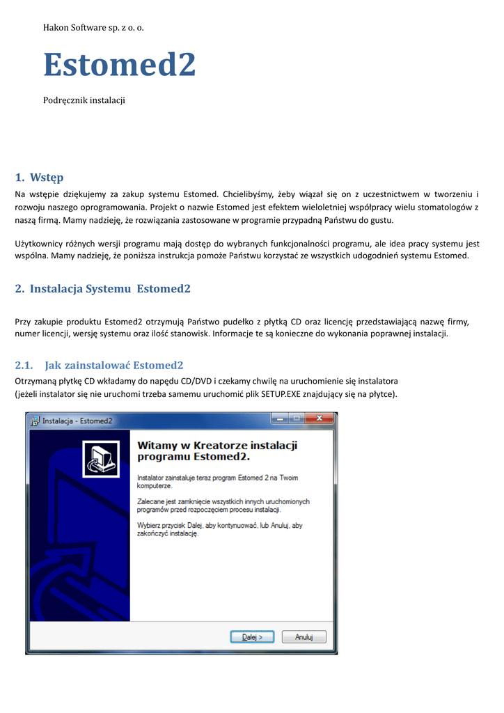 Hakon Software sp. z o. o. Estomed2 Podręcznik instalacji 1. Wstęp Na wstępie dziękujemy za zakup systemu Estomed. Chcielibyśmy, żeby wiązał się on z uczestnictwem w tworzeniu i rozwoju naszego oprogramowania. Projekt o nazwie Estomed jest efektem wieloletniej współpracy wielu stomatologów z naszą firmą. Mamy nadzieję, że rozwiązania zastosowane w programie przypadną Państwu do gustu. Użytkownicy różnych wersji programu mają dostęp do wybranych funkcjonalności programu, ale idea pracy systemu jest wspólna. Mamy nadzieję, że poniższa instrukcja pomoże Państwu korzystać ze wszystkich udogodnień systemu Estomed. 2. Instalacja Systemu Estomed2 Przy zakupie produktu Estomed2 otrzymują Państwo pudełko z płytką CD oraz licencję przedstawiającą nazwę firmy, numer licencji, wersję systemu oraz ilość stanowisk. Informacje te są konieczne do wykonania poprawnej instalacji. 2.1. Jak zainstalować Estomed2 Otrzymaną płytkę CD wkładamy do napędu CD/DVD i czekamy chwilę na uruchomienie się instalatora (jeżeli instalator się nie uruchomi trzeba samemu uruchomić plik SETUP.EXE znajdujący się na płytce). Następnie postępujemy krok po kroku za instalatorem. Wybieramy standardową ścieżkę instalacji, czyli C:\Program Files\Estomed2 lub wskazujemy inną. Następnie instalator zainstaluje pliki do wskazanego folderu. Po zakończeniu instalacji należy ponownie uruchomić komputer. Po zakończeniu poprawnej instalacji pokażą nam się na pulpicie dwie nowe ikony: Estomed - Pomoc jest to zdalne narzędzie, które służy do serwisu oraz aktualizacji Estomed2. Dzięki niemu jesteśmy w stanie zdalnie skonfigurować system według potrzeb użytkownika. Jeżeli użytkownik napotkał problem lub ma pytania związane z funkcjonalnością Estomed2, klika dwa razy myszką na ikonę Estomed - Pomoc na pulpicie lub jednokrotnie na ikonę Pomoc umieszczoną w prawym górnym rogu programu. Wyświetla się okno zdalnej pomocy Estomed2 z numerem telefonu (058) – 551-26-19. Narzędzie wymaga połączenia z Internetem komputera na którym zostaje uruchomione. Następnie należy zadzwonić pod wskazany numer telefonu i podać konsultantowi numer ID oraz hasło dostępu do komputera. Aby uruchomić system Estomed2 należy kliknąć dwa razy myszką na ikonę, która znajduje się na pulpicie komputera. Jeżeli Estomed2 nie był wcześniej uruchamiany na komputerze ukaże się okno dalszej konfiguracji systemu. Przechodzimy dalej zgodnie z instalatorem gdzie ukaże nam się okno wyboru konfiguracji. Następnie wybieramy spośród opcji widocznych na rysunku jedną przez nas oczekiwaną, przy wersji demo zaznaczamy demo. 2.2. Zainstaluj program Estomed2 z bazą danych Jeżeli chcemy zainstalować system na tym komputerze należy zaznaczyć tą opcje i nacisnąć Dalej. Mamy także możliwość wyboru lokalizacji bazy w innym miejscu np. na serwerze w firmie. Jeżeli użytkownik zdecyduje się na inną lokalizacje klika prawym klawiszem myszki w pole – Zainstaluj program Estomed z bazą danych - w celu wybrania innej lokalizacji. W oknie - Docelowy host instalacji głównej - należy wpisać nazwę lub IP komputera oraz numer portu. Standardowo zalecany jest numer portu 10020. Następnie należy kliknąć Dalej. Następnie pojawi się kolejne okno w którym będziemy musieli wygenerować klucz produktu Estomed2. Jeżeli gabinet stomatologiczny nie ma usługi internetowej, użytkownik powinien zadzwonić do serwisu Estomed na w/w numer telefonu. Serwisant wygeneruje klucz produktu automatycznie. Te gabinety, które posiadają Internet mogą aktywować program klikając na – Wejdź na stronę internetową aktywacji programu. Otworzy się strona WWW na której musimy podać numer licencji, następnie klikamy Dalej i podajemy numer instalacji w przypadku jej braku. Klikamy Generuj i wklejamy nasz wygenerowany klucz do programu. Jeżeli numer klucza jest poprawny ukaże się nam okno, w którym ustawiamy folder gdzie mają być przechowywane zdjęcia zębów pacjentów. Dzięki tej opcji wszystkie zdjęcia z różnych komputerów zapisują się do tego samego folderu. Poprawne skonfigurowanie folderu ze zdjęciami jest kluczowe do poprawnej pracy systemu Estomed2. Jeżeli gabinet będzie posiadać tylko jeden komputer z systemem Estomed2 należy pozostawić ścieżkę domyślną zaproponowaną przez instalator i nacisnąć przycisk Dalej. Jeżeli natomiast użytkownik wie, że system Estomed będzie zainstalowany na więcej niż jednym komputerze musi utworzyć folder o nazwie np. Images na komputerze gdzie jest zainstalowana baza i udostępnić go w sieci lokalnej. Następnie wpisać ścieżkę w pole konfiguracji systemu i kliknąć Dalej. Uwaga! W przypadku utraty dostępu do sieciowego folderu przechowywania zdjęć, Estomed rozpocznie pracę na katalogu „Estomed Folder” utworzonym domyślnie na pulpicie, o czym poinformuje odpowiednim komunikatem. Ukaże nam się okno gdzie wpisujemy Dane Użytkownika, który będzie obsługiwał Estomed2 na tym komputerze i nacisnąć Zakończ. Ostatnią informacją do uzupełnienia przez użytkownika jest podanie numeru licencji programu Estomedu. Po poprawnej konfiguracji pokaże nam się okno terminarza programu Estomed 2.