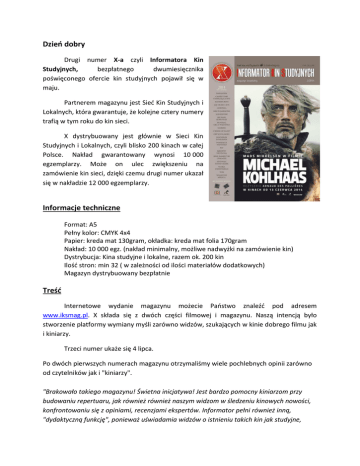 Dzień dobry Drugi numer X-a czyli Informatora Kin Studyjnych, bezpłatnego dwumiesięcznika poświęconego ofercie kin studyjnych pojawił się w maju. Partnerem magazynu jest Sieć Kin Studyjnych i Lokalnych, która gwarantuje, że kolejne cztery numery trafią w tym roku do kin sieci. X dystrybuowany jest głównie w Sieci Kin Studyjnych i Lokalnych, czyli blisko 200 kinach w całej Polsce. Nakład gwarantowany wynosi 10 000 egzemplarzy. Może on ulec zwiększeniu na zamówienie kin sieci, dzięki czemu drugi numer ukazał się w nakładzie 12 000 egzemplarzy. Informacje techniczne Format: A5 Pełny kolor: CMYK 4x4 Papier: kreda mat 130gram, okładka: kreda mat folia 170gram Nakład: 10 000 egz. (nakład minimalny, możliwe nadwyżki na zamówienie kin) Dystrybucja: Kina studyjne i lokalne, razem ok. 200 kin Ilość stron: min 32 ( w zależności od ilości materiałów dodatkowych) Magazyn dystrybuowany bezpłatnie Treść Internetowe wydanie magazynu możecie Państwo znaleźć pod adresem www.iksmag.pl. X składa się z dwóch części filmowej i magazynu. Naszą intencją było stworzenie platformy wymiany myśli zarówno widzów, szukających w kinie dobrego filmu jak i kiniarzy. Trzeci numer ukaże się 4 lipca. Po dwóch pierwszych numerach magazynu otrzymaliśmy wiele pochlebnych opinii zarówno od czytelników jak i "kiniarzy". "Brakowało takiego magazynu! Świetna inicjatywa! Jest bardzo pomocny kiniarzom przy budowaniu repertuaru, jak również również naszym widzom w śledzeniu kinowych nowości, konfrontowaniu się z opiniami, recenzjami ekspertów. Informator pełni również inną, "dydaktyczną funkcję", ponieważ uświadamia widzów o istnieniu takich kin jak studyjne, pokazuje widzowi alternatywne rozwiązanie... (Rydułtów, kino Fenix)" "Inicjatywa bardzo wartościowa i potrzebna. (Ciechanów, kino Ładynia)" Zaufali nam już i znaleźli się w X-ie: Przegląd Kino na Granicy Tarnowska Nagroda Filmowa Planet+ Doc Film Festiwal Sopot Film Festiwal Wiemy również, że nasz magazyn trafia do każdego, ale głównymi odbiorcami są ludzie zorientowani na kino, widzowie, którzy systematycznie uczestniczą w spotkaniach klubów filmowych, którzy kochają dobre kino. Efekty naszej pracy można podejrzeć na stronie: www.iksmag.pl SPECJALNA OFERTA FESTIWALOWA Sezon festiwalowy rozpoczyna się na dobre, widzowie kochający kino zaczynają rozglądać się za propozycjami letnich festiwali. W związku z tym w X-ie rezerwujemy miejsce dla Państwa. W standardowym cenniku jedna strona wewnątrz numeru kosztuje 500zł, ale dla Państwa mamy specjalną ofertę. Za tę cenę oddajemy Wam do dyspozycji DWIE całe strony, możecie je zagospodarować w dowolny sposób. Przygotujemy również dodatkowy nakład do dystrybucji w obiektach festiwalowych. Przykładowymi realizacjami oferty w numerze 2. X-a są materiały promocyjne Planet+ Doc Film Festiwalu i Sopot Film Festiwalu, do zobaczenia na stronie: www.iksmag.pl SZCZEGÓŁY OFERTY dwie strony A5, w pełnym kolorze, w nakładzie co najmniej 10 000 egzemplarzy, które najpóźniej 7 lipca trafią do blisko 200 kin w całej Polsce koszt 500zł (netto) Zapraszam Państwa do numeru wakacyjnego [email protected], Bogdan Balicki, 600875878. Materiały do numeru 3 przyjmujemy do 23 czerwca. Lista dystrybucyjna dostępna na stronie: www.kinastudyjne.pl/kina.html Bez względu na to czy skorzystacie Państwo z naszej oferty, chcemy zamieścić w X-ie informację o Państwa festiwalach, bardzo proszę o przesłanie, krótkiej informacji o festiwalu - do 1000 znaków ze spacjami - na adres redakcji: [email protected] X. Informator Kin Studyjnych wydajemy we współpracy z Siecią Kin Studyjnych i Lokalnych Magazyn posiada numer ISSN X jest bezpłatny dla widzów kin studyjnych i lokalnych