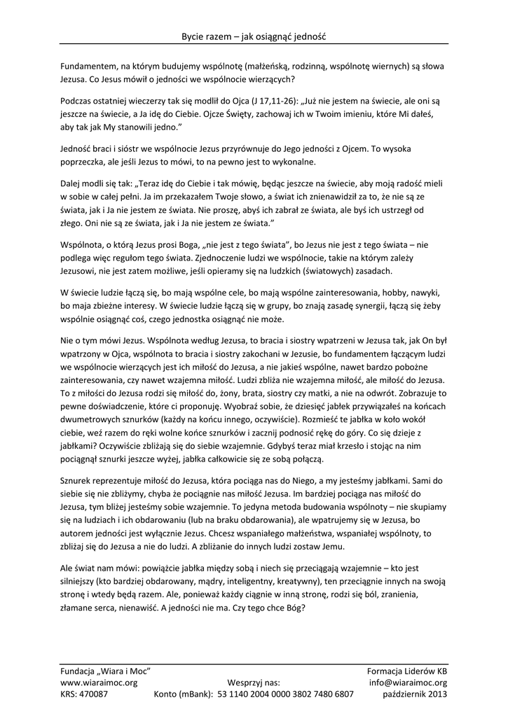 Bycie razem – jak osiągnąć jedność Fundamentem, na którym budujemy wspólnotę (małżeńską, rodzinną, wspólnotę wiernych) są słowa Jezusa. Co Jesus mówił o jedności we wspólnocie wierzących? Podczas ostatniej wieczerzy tak się modlił do Ojca (J 17,11-26): „Już nie jestem na świecie, ale oni są jeszcze na świecie, a Ja idę do Ciebie. Ojcze Święty, zachowaj ich w Twoim imieniu, które Mi dałeś, aby tak jak My stanowili jedno.” Jedność braci i sióstr we wspólnocie Jezus przyrównuje do Jego jedności z Ojcem. To wysoka poprzeczka, ale jeśli Jezus to mówi, to na pewno jest to wykonalne. Dalej modli się tak: „Teraz idę do Ciebie i tak mówię, będąc jeszcze na świecie, aby moją radość mieli w sobie w całej pełni. Ja im przekazałem Twoje słowo, a świat ich znienawidził za to, że nie są ze świata, jak i Ja nie jestem ze świata. Nie proszę, abyś ich zabrał ze świata, ale byś ich ustrzegł od złego. Oni nie są ze świata, jak i Ja nie jestem ze świata.” Wspólnota, o którą Jezus prosi Boga, „nie jest z tego świata”, bo Jezus nie jest z tego świata – nie podlega więc regułom tego świata. Zjednoczenie ludzi we wspólnocie, takie na którym zależy Jezusowi, nie jest zatem możliwe, jeśli opieramy się na ludzkich (światowych) zasadach. W świecie ludzie łączą się, bo mają wspólne cele, bo mają wspólne zainteresowania, hobby, nawyki, bo maja zbieżne interesy. W świecie ludzie łączą się w grupy, bo znają zasadę synergii, łączą się żeby wspólnie osiągnąć coś, czego jednostka osiągnąć nie może. Nie o tym mówi Jezus. Wspólnota według Jezusa, to bracia i siostry wpatrzeni w Jezusa tak, jak On był wpatrzony w Ojca, wspólnota to bracia i siostry zakochani w Jezusie, bo fundamentem łączącym ludzi we wspólnocie wierzących jest ich miłość do Jezusa, a nie jakieś wspólne, nawet bardzo pobożne zainteresowania, czy nawet wzajemna miłość. Ludzi zbliża nie wzajemna miłość, ale miłość do Jezusa. To z miłości do Jezusa rodzi się miłość do, żony, brata, siostry czy matki, a nie na odwrót. Zobrazuje to pewne doświadczenie, które ci proponuję. Wyobraź sobie, że dziesięć jabłek przywiązałeś na końcach dwumetrowych sznurków (każdy na końcu innego, oczywiście). Rozmieść te jabłka w koło wokół ciebie, weź razem do ręki wolne końce sznurków i zacznij podnosić rękę do góry. Co się dzieje z jabłkami? Oczywiście zbliżają się do siebie wzajemnie. Gdybyś teraz miał krzesło i stojąc na nim pociągnął sznurki jeszcze wyżej, jabłka całkowicie się ze sobą połączą. Sznurek reprezentuje miłość do Jezusa, która pociąga nas do Niego, a my jesteśmy jabłkami. Sami do siebie się nie zbliżymy, chyba że pociągnie nas miłość Jezusa. Im bardziej pociąga nas miłość do Jezusa, tym bliżej jesteśmy sobie wzajemnie. To jedyna metoda budowania wspólnoty – nie skupiamy się na ludziach i ich obdarowaniu (lub na braku obdarowania), ale wpatrujemy się w Jezusa, bo autorem jedności jest wyłącznie Jezus. Chcesz wspaniałego małżeństwa, wspaniałej wspólnoty, to zbliżaj się do Jezusa a nie do ludzi. A zbliżanie do innych ludzi zostaw Jemu. Ale świat nam mówi: powiążcie jabłka między sobą i niech się przeciągają wzajemnie – kto jest silniejszy (kto bardziej obdarowany, mądry, inteligentny, kreatywny), ten przeciągnie innych na swoją stronę i wtedy będą razem. Ale, ponieważ każdy ciągnie w inną stronę, rodzi się ból, zranienia, złamane serca, nienawiść. A jedności nie ma. Czy tego chce Bóg? Fundacja „Wiara i Moc” www.wiaraimoc.org Wesprzyj nas: KRS: 470087 Konto (mBank): 53 1140 2004 0000 3802 7480 6807 Formacja Liderów KB [email protected] październik 2013 Bycie razem – jak osiągnąć jedność Ta zasada zaczyna się już w małżeństwach. Gdy małżonkowie zbliżają się do Jezusa, to On ma moc i mądrość, wie jak ich połączyć wzajemną miłością, bo zna serce każdego człowieka. A gdy szukają u siebie wzajemnie oparcia i miłości, lub co gorsza, próbują się wzajemnie przeciągać (bo przecież ktoś musi być górą), wówczas zwiększają statystyki rozwodów. Dlaczego ludziom się wydaje, że są mądrzejsi od Boga? Jeremiasz prorokował (Jer 17,5) "Tak mówi Pan: Przeklęty mąż, który pokłada nadzieję w człowieku i który w ciele upatruje swą siłę, a od Pana odwraca swe serce.” Otrzymujemy błogosławieństwo tylko wtedy, gdy zwracamy swoje serce do Pana, a nie do człowieka – bez względu na to kim ten człowiek jest, jakie ma stanowisko, jakie umiejętności czy zasoby. Twoja żona nie jest ważniejsza od Jezusa, twoja matka nie jest ważniejsza od Jezusa. Bóg ustanowił Chrystusa najwyższym Panem i autorytetem. Najpierw więc zwróć swoje serce do Jezusa, a wtedy On ci powie, jak masz kochać żonę, jak masz szanować matkę. W świecie ludzie podporządkowują się innym, bo ci są mądrzejsi, bogatsi, mają więcej wpływów, mają władzę, mają aparat nacisku. W świecie ludzie sami sobie nadają tytuły, nominacje i budują hierarchie, i niemało wśród tego jest kłótni i sporów. W świecie panuje kolesiostwo w sukcesji stanowisk i nepotyzm. Jezus tego nie chce. On nam mówi (Mk 9,33-35): „Gdy był już w domu, zapytał ich: O czym to rozprawialiście w drodze? Lecz oni milczeli, w drodze bowiem posprzeczali się między sobą o to, kto z nich jest największy. On usiadł, przywołał Dwunastu i rzekł do nich: Jeśli ktoś chce być pierwszym, niech będzie ostatnim ze wszystkich i sługą wszystkich.” A w Ewangelii św. Mateusza dodaje (Mt 20,23): „Nie do Mnie należy dać miejsce po mojej stronie prawej i lewej, ale [dostanie się ono] tym, dla których mój Ojciec je przygotował”. To Bóg decyduje, kto jest kim we wspólnocie, a nie człowiek, nawet gdyby był najmądrzejszy. A św. Paweł pisze (Ef 4,7): „Każdemu zaś z n