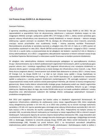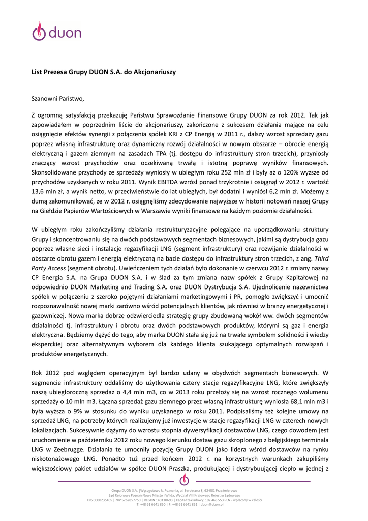 List Prezesa Grupy DUON S.A. do Akcjonariuszy Szanowni Państwo, Z ogromną satysfakcją przekazuję Państwu Sprawozdanie Finansowe Grupy DUON za rok 2012. Tak jak zapowiadałem w poprzednim liście do akcjonariuszy, zakończone z sukcesem działania mające na celu osiągnięcie efektów synergii z połączenia spółek KRI z CP Energią w 2011 r., dalszy wzrost sprzedaży gazu poprzez własną infrastrukturę oraz dynamiczny rozwój działalności w nowym obszarze – obrocie energią elektryczną i gazem ziemnym na zasadach TPA (tj. dostępu do infrastruktury stron trzecich), przyniosły znaczący wzrost przychodów oraz oczekiwaną trwałą i istotną poprawę wyników finansowych. Skonsolidowane przychody ze sprzedaży wyniosły w ubiegłym roku 252 mln zł i były aż o 120% wyższe od przychodów uzyskanych w roku 2011. Wynik EBITDA wzrósł ponad trzykrotnie i osiągnął w 2012 r. wartość 13,6 mln zł, a wynik netto, w przeciwieństwie do lat ubiegłych, był dodatni i wyniósł 6,2 mln zł. Możemy z dumą zakomunikować, że w 2012 r. osiągnęliśmy zdecydowanie najwyższe w historii notowań naszej Grupy na Giełdzie Papierów Wartościowych w Warszawie wyniki finansowe na każdym poziomie działalności. W ubiegłym roku zakończyliśmy działania restrukturyzacyjne polegające na uporządkowaniu struktury Grupy i skoncentrowaniu się na dwóch podstawowych segmentach biznesowych, jakimi są dystrybucja gazu poprzez własne sieci i instalacje regazyfikacji LNG (segment infrastruktury) oraz rozwijanie działalności w obszarze obrotu gazem i energią elektryczną na bazie dostępu do infrastruktury stron trzecich, z ang. Third Party Access (segment obrotu). Uwieńczeniem tych działań było dokonanie w czerwcu 2012 r. zmiany nazwy CP Energia S.A. na Grupa DUON S.A. i w ślad za tym zmiana nazw spółek z Grupy Kapitałowej na odpowiednio DUON Marketing and Trading S.A. oraz DUON Dystrybucja S.A. Ujednolicenie nazewnictwa spółek w połączeniu z szeroko pojętymi działaniami marketingowymi i PR, pomogło zwiększyć i umocnić rozpoznawalność nowej marki zarówno wśród potencjalnych klientów, jak również w branży energetycznej i gazowniczej. Nowa marka dobrze odzwierciedla strategię grupy zbudowaną wokół ww. dwóch segmentów działalności tj. infrastruktury i obrotu oraz dwóch podstawowych produktów, którymi są gaz i energia elektryczna. Będziemy dążyć do tego, aby marka DUON stała się już na trwałe symbolem solidności i wiedzy eksperckiej oraz alternatywnym wyborem dla każdego klienta szukającego optymalnych rozwiązań i produktów energetycznych. Rok 2012 pod względem operacyjnym był bardzo udany w obydwóch segmentach biznesowych. W segmencie infrastruktury oddaliśmy do użytkowania cztery stacje regazyfikacyjne LNG, które zwiększyły naszą ubiegłoroczną sprzedaż o 4,4 mln m3, co w 2013 roku przełoży się na wzrost rocznego wolumenu sprzedaży o 10 mln m3. Łączna sprzedaż gazu ziemnego przez własną infrastrukturę wyniosła 68,1 mln m3 i była wyższa o 9% w stosunku do wyniku uzyskanego w roku 2011. Podpisaliśmy też kolejne umowy na sprzedaż LNG, na potrzeby których realizujemy już inwestycje w stacje regazyfikacji LNG w czterech nowych lokalizacjach. Sukcesywnie dążymy do wzrostu stopnia dywersyfikacji dostawców LNG, czego dowodem jest uruchomienie w październiku 2012 roku nowego kierunku dostaw gazu skroplonego z belgijskiego terminala LNG w Zeebrugge. Działania te umocniły pozycję Grupy DUON jako lidera wśród dostawców na rynku niskotonażowego LNG. Ponadto tuż przed końcem 2012 r. na korzystnych warunkach zakupiliśmy większościowy pakiet udziałów w spółce DUON Praszka, produkującej i dystrybuującej ciepło w jednej z Grupa DUON S.A. |Wysogotowo k. Poznania, ul. Serdeczna 8, 62-081 Przeźmierowo Sąd Rejonowy Poznań Nowe Miasto i Wilda, Wydział VIII Krajowego Rejestru Sądowego KRS 0000235405 | NIP 5262857750 | REGON 140118693 | Kapitał zakładowy: 102 468 553 PLN - wpłacony w całości T: +48 61 6641 850 | F: +48 61 6641 851 | [email protected] lokalizacji w której posiadamy sieci gazowe – transakcja ta przyczyni się do uzyskania w kolejnych latach dodatkowej marży na sprzedawanym przez nas gazie. W segmencie obrotu bardzo dynamicznie zwiększyliśmy sprzedaż energii elektrycznej do klientów końcowych na bazie TPA. W ubiegłym roku sprzedaliśmy 164 MWh do ponad 5 000 odbiorców a na rok 2013 mamy już podpisane kontrakty na łączny wolumen ok. 250 MWh co daje roczny przyrost ok. 52%. Od kwietnia ubiegłego roku rozpoczęliśmy handel gazem na bazie TPA, zaopatrując w pierwszej kolejności klientów przyłączonych do własnej sieci dystrybucyjnej i sprzedając w ramach transakcji wewnątrzgrupowych ok. 15 mln m3 gazu ziemnego kupowanego na hurtowych rynkach zagranicznych. Spodziewamy się, że rok 2013 będzie rokiem przełomowym na liberalizującym się rynku gazu w Polsce. Pozyskaliśmy pierwsze kontrakty z klientami końcowymi na bazie TPA, a uruchomienie giełdy gazu oraz powstanie wirtualnego punktu na sieci przesyłowej spowodowało, że rozpoczęliśmy aktywny handel hurtowy gazem w Polsce. Możemy pochwalić się tym, że jako pierwszy podmiot w Polsce zawarliśmy transakcje kupna na polskiej giełdzie gazu. Spodziewamy się, że efekty rozwoju tej części biznesu będą widoczne w wynikach roku bieżącego. Utrzymanie wysokiej dynamiki wzrostu wyników finansowych, które będą przekładały się na wzrost wartości Grupy jest dla nas podstawowym celem na kolejne lata. Potwierdzeniem realizacji tego celu, jest między innymi publikowana równolegle ze Sprawozdaniem Finansowym prognoza wyników na rok 2013. Przewidujemy, że w bieżącym roku wynik EBITDA wzrośnie w stosunku do roku ubiegłego o 29% i osiągnie wartość 17,6 mln zł. Na uzyskanie takiego wyniku zasadniczy wpływ będzie miał zakontraktowany już wzrost sprzedaży gazu ziemnego dystrybuowanego prz