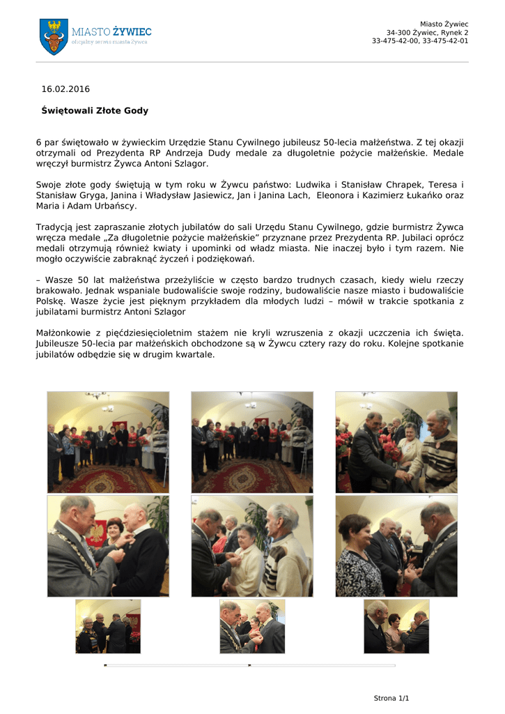Miasto Żywiec 34-300 Żywiec, Rynek 2 33-475-42-00, 33-475-42-01 16.02.2016 Świętowali Złote Gody 6 par świętowało w żywieckim Urzędzie Stanu Cywilnego jubileusz 50-lecia małżeństwa. Z tej okazji otrzymali od Prezydenta RP Andrzeja Dudy medale za długoletnie pożycie małżeńskie. Medale wręczył burmistrz Żywca Antoni Szlagor. Swoje złote gody świętują w tym roku w Żywcu państwo: Ludwika i Stanisław Chrapek, Teresa i Stanisław Gryga, Janina i Władysław Jasiewicz, Jan i Janina Lach, Eleonora i Kazimierz Łukańko oraz Maria i Adam Urbańscy. Tradycją jest zapraszanie złotych jubilatów do sali Urzędu Stanu Cywilnego, gdzie burmistrz Żywca wręcza medale „Za długoletnie pożycie małżeńskie” przyznane przez Prezydenta RP. Jubilaci oprócz medali otrzymują również kwiaty i upominki od władz miasta. Nie inaczej było i tym razem. Nie mogło oczywiście zabraknąć życzeń i podziękowań. – Wasze 50 lat małżeństwa przeżyliście w często bardzo trudnych czasach, kiedy wielu rzeczy brakowało. Jednak wspaniale budowaliście swoje rodziny, budowaliście nasze miasto i budowaliście Polskę. Wasze życie jest pięknym przykładem dla młodych ludzi – mówił w trakcie spotkania z jubilatami burmistrz Antoni Szlagor Małżonkowie z pięćdziesięcioletnim stażem nie kryli wzruszenia z okazji uczczenia ich święta. Jubileusze 50-lecia par małżeńskich obchodzone są w Żywcu cztery razy do roku. Kolejne spotkanie jubilatów odbędzie się w drugim kwartale. Strona 1/1 Powered by TCPDF (www.tcpdf.org)