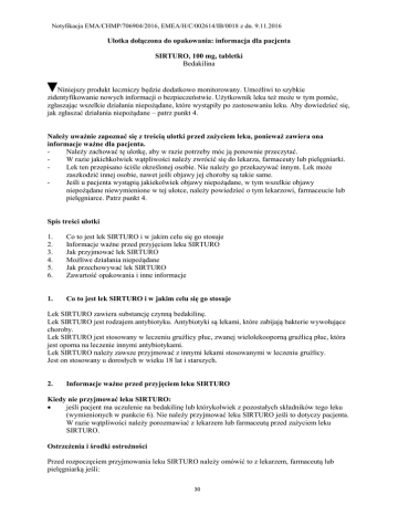 Notyfikacja EMA/CHMP/706904/2016, EMEA/H/C/002614/IB/0018 z dn. 9.11.2016 Ulotka dołączona do opakowania: informacja dla pacjenta SIRTURO, 100 mg, tabletki Bedakilina Niniejszy produkt leczniczy będzie dodatkowo monitorowany. Umożliwi to szybkie zidentyfikowanie nowych informacji o bezpieczeństwie. Użytkownik leku też może w tym pomóc, zgłaszając wszelkie działania niepożądane, które wystąpiły po zastosowaniu leku. Aby dowiedzieć się, jak zgłaszać działania niepożądane – patrz punkt 4. Należy uważnie zapoznać się z treścią ulotki przed zażyciem leku, ponieważ zawiera ona informacje ważne dla pacjenta. Należy zachować tę ulotkę, aby w razie potrzeby móc ją ponownie przeczytać. W razie jakichkolwiek wątpliwości należy zwrócić się do lekarza, farmaceuty lub pielęgniarki. Lek ten przepisano ściśle określonej osobie. Nie należy go przekazywać innym. Lek może zaszkodzić innej osobie, nawet jeśli objawy jej choroby są takie same. Jeśli u pacjenta wystąpią jakiekolwiek objawy niepożądane, w tym wszelkie objawy niepożądane niewymienione w tej ulotce, należy powiedzieć o tym lekarzowi, farmaceucie lub pielęgniarce. Patrz punkt 4. Spis treści ulotki 1. 2. 3. 4. 5. 6. Co to jest lek SIRTURO i w jakim celu się go stosuje Informacje ważne przed przyjęciem leku SIRTURO Jak przyjmować lek SIRTURO Możliwe działania niepożądane Jak przechowywać lek SIRTURO Zawartość opakowania i inne informacje 1. Co to jest lek SIRTURO i w jakim celu się go stosuje Lek SIRTURO zawiera substancję czynną bedakilinę. Lek SIRTURO jest rodzajem antybiotyku. Antybiotyki są lekami, które zabijają bakterie wywołujące choroby. Lek SIRTURO jest stosowany w leczeniu gruźlicy płuc, zwanej wielolekooporną gruźlicą płuc, która jest oporna na leczenie innymi antybiotykami. Lek SIRTURO należy zawsze przyjmować z innymi lekami stosowanymi w leczeniu gruźlicy. Jest on stosowany u dorosłych w wieku 18 lat i starszych. 2. Informacje ważne przed przyjęciem leku SIRTURO Kiedy nie przyjmować leku SIRTURO: jeśli pacjent ma uczulenie na bedakilinę lub którykolwiek z pozostałych składników tego leku (wymienionych w punkcie 6). Nie należy przyjmować leku SIRTURO jeśli to dotyczy pacjenta. W razie wątpliwości należy porozmawiać z lekarzem lub farmaceutą przed zażyciem leku SIRTURO. Ostrzeżenia i środki ostrożności Przed rozpoczęciem przyjmowania leku SIRTURO należy omówić to z lekarzem, farmaceutą lub pielęgniarką jeśli: 30 Notyfikacja EMA/CHMP/706904/2016, EMEA/H/C/002614/IB/0018 z dn. 9.11.2016 pacjent ma nieprawidłowy wynik EKG lub niewydolność serca; pacjent ma wrodzony zespół wydłużonego odstępu QT (zaburzenie przewodnictwa w mięśniu sercowym) lub zespól ten występuje w rodzinie pacjenta; pacjent ma niedoczynność tarczycy stwierdzoną w badaniu krwi; pacjent ma chorobę wątroby lub pije regularnie alkohol; pacjent ma zakażenie ludzkim wirusem niedoboru odporności (HIV). Jeśli którakolwiek z powyższych sytuacji dotyczy pacjenta, lub pacjent nie jest pewny należy porozmawiać z lekarzem, farmaceutą lub pielęgniarką przed zażyciem leku SIRTURO. Dzieci i młodzież Nie należy podawać tego leku dzieciom i młodzieży (w wieku poniżej 18 lat), gdyż lek nie był badany w tej grupie wiekowej. SIRTURO a inne leki Inne leki mogą wpływać na działanie leku SIRTURO. Należy powiedzieć lekarzowi lub farmaceucie o wszystkich lekach stosowanych przez pacjenta obecnie lub ostatnio, a także o lekach, które pacjent planuje przyjmować. Dotyczy to również leków wydawanych bez recepty oraz preparatów ziołowych. Poniżej przedstawiono przykłady leków, które często przyjmują pacjenci z wielolekooporną gruźlicą i które mogą wchodzić w interakcje z lekiem SIRTURO: Lek (nazwa substancji czynnej) ryfampicyna, ryfapentyna, ryfabutyna ketokonazol, flukonazol efawirenz, etrawiryna, lopinawir/rytonawir klofazymina karbamazepina, fenytoina ziele dziurawca zwyczajnego (Hypericum perforatum) cyprofloksacyna, erytromycyna, klarytromycyna Zastosowanie leku leczenie niektórych zakażeń, jak gruźlica (leki przeciwprątkowe) leczenie zakażeń grzybiczych (leki przeciwgrzybicze) leczenie zakażeń HIV (antyretrowirusowe nienukleozydowe inhibitory odwrotnej transkryptazy, antyretrowirusowe inhibitory proteazy) leczenie niektórych zakażeń jak trąd (lek przeciwprątkowy) leki przeciwpadaczkowe lek ziołowy stosowany w stanach lękowych leczenie zakażeń bakteryjnych (antybiotyki) Stosowanie lekuSIRTURO z alkoholem Nie wolno pić alkoholu podczas stosowania leku SIRTURO. Ciąża i karmienie piersią Jeśli pacjentka jest w ciąży lub karmi piersią, przypuszcza, że może być w ciąży lub gdy planuje mieć dziecko, powinna poradzić się lekarza lub farmaceuty przed zastosowaniem tego leku. Prowadzenie pojazdów i obsługiwanie maszyn Pacjent może odczuwać zawroty głowy podczas przyjmowania leku SIRTURO. Jeśli tak się dzieje nie należy prowadzić pojazdów i obsługiwać maszyn. Lek SIRTURO zawiera laktozę Lek SIRTURO zawiera “laktozę” (rodzaj cukru). Jeśli pacjent ma nietolerancję lub problemy z trawieniem niektórych cukrów, należy powiedzieć o tym lekarzowi przed zastosowaniem leku. 31 Notyfikacja EMA/CHMP/706904/2016, EMEA/H/C/002614/IB/0018 z dn. 9.11.2016 3. Jak przyjmować lek SIRTURO Ten lek należy zawsze przyjmować zgodnie z zaleceniami lekarza lub farmaceuty. W razie wątpliwości należy zwrócić się do lekarza lub farmaceuty. Lek SIRTURO musi zawsze być przyjmowany razem z innymi lekami przeciwgruźliczymi. Lekarz prowadzący zdecyduje, jakie inne leki pacjent powinien przyjmować razem z lekiem SIRTURO. Ile zażyć Pacjent będzie przyjmował lek SIRTURO w terapii trwającej 24 tygodnie. Pierwsze 2 tygodnie: 400 mg (4 tabletki po 100 mg) raz na dobę. Od tygodnia 3 do tygodnia 24: 200 mg (2 tabletki po 100 mg) raz na dobę, lecz tylko przez 3 dni w tygodniu. Mus