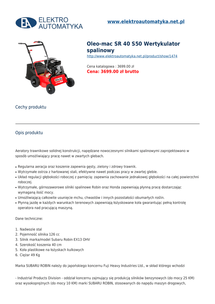 www.elektroautomatyka.net.pl Oleo-mac SR 40 S50 Wertykulator spalinowy http://www.elektroautomatyka.net.pl/product/show/1474 Cena katalogowa : 3699.00 zł Cena: 3699.00 zł brutto Cechy produktu Opis produktu Aeratory trawnikowe solidnej konstrukcji, napędzane nowoczesnymi silnikami spalinowymi zaprojektowano w sposób umożliwiający pracę nawet w zwartych glebach. ● ● ● ● ● ● Regularna aeracja oraz koszenie zapewnia gęsty, zielony i zdrowy trawnik. Wytrzymałe ostrza z hartowanej stali, efektywne nawet podczas pracy w zwartej glebie. Układ regulacji głębokości roboczej z pamięcią: zapewnia zachowanie jednakowej głębokości na całej powierzchni roboczej. Wytrzymałe, górnozaworowe silniki spalinowe Robin oraz Honda zapewniają płynną pracę dostarczając wymaganą ilość mocy. Umożliwiającą całkowite usunięcie mchu, chwastów i innych pozostałości obumarłych roślin. Płynną jazdę w każdych warunkach terenowych zapewniają łożyskowane koła gwarantując pełną kontrolę operatora nad pracującą maszyną. Dane techniczne: 1. 2. 3. 4. 5. 6. Nadwozie stal Pojemność silnika 126 cc Silnik marka/model Subaru Robin EX13 OHV Szerokość koszenia 40 cm Koła plastikowe na łożyskach kulkowych Ciężar 49 Kg Marka SUBARU ROBIN należy do japońskiego koncernu Fuji Heavy Industries Ltd., w skład którego wchodzi - Industrial Products Division - oddział koncernu zajmujący się produkcją silników benzynowych (do mocy 25 KM) oraz wysokoprężnych (do mocy 10 KM) marki SUBARU ROBIN, stosowanych do napędu maszyn drogowych, przemysłowych, sprzętu ogrodniczego. Rewolucyjnym rozwiązaniem w silnikach z serii EX jest napęd wałka rozrządu poprzez łańcuch. Rozwiązanie to oparte na konstrukcji silników samochodów SUBARU pozwoliło na dużą redukcję ilości części, zwiększenie żywotności oraz wzrost parametrów. ELEKTRO-AUTOMATYKA Sprzedaż elektronarzędzi, urządzeń spawalniczych, maszyn budowlanych, pneumatyki, narzędzi warsztatowych, firmowych ubrań roboczych oraz maszyn ogrodowo leśnych. Sklep Bochnia ul. Brzeska 50 32-700 Bochnia Sklep Brzesko ul. Szarych Szeregów 23 32-800 Brzesko Serwis, Magazyn ul. Św. Brata Alberta 4 32-800 Brzesko tel. 691 572 333 e-mail: [email protected] tel. 609 523 230 e-mail: [email protected] tel. 609 523 645 e-mail: [email protected]