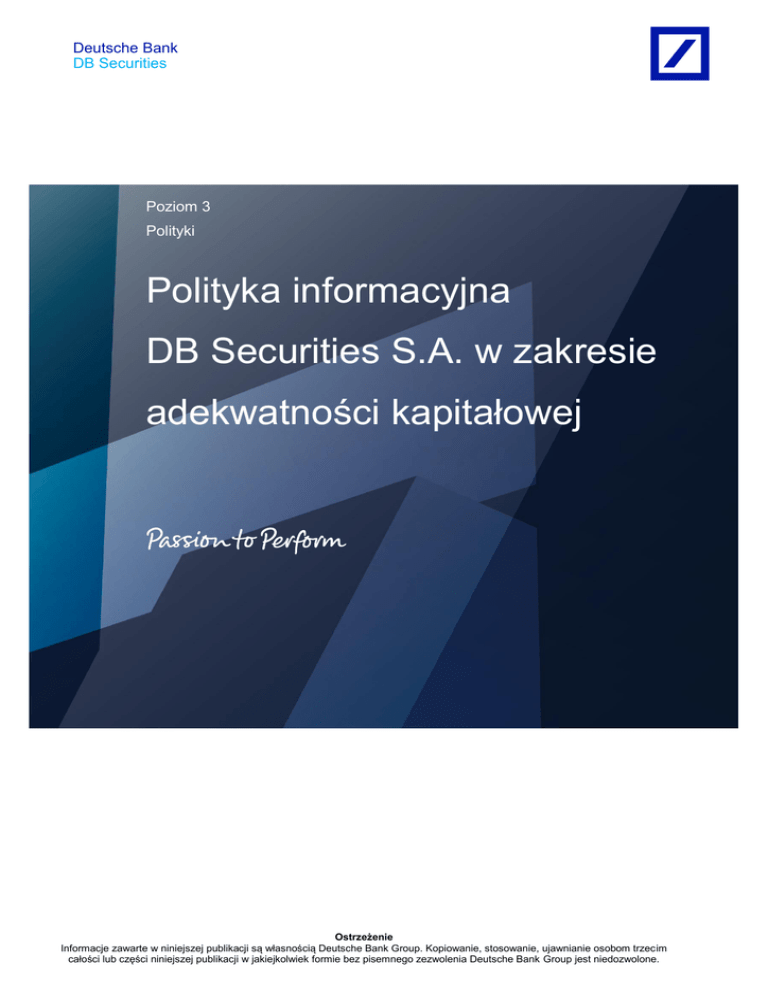 Deutsche Bank DB Securities Poziom 3 Polityki Polityka informacyjna DB Securities S.A. w zakresie adekwatności kapitałowej Ostrzeżenie Informacje zawarte w niniejszej publikacji są własnością Deutsche Bank Group. Kopiowanie, stosowanie, ujawnianie osobom trzecim całości lub części niniejszej publikacji w jakiejkolwiek formie bez pisemnego zezwolenia Deutsche Bank Group jest niedozwolone. Deutsche Bank DB Securities Polityka informacyjna DB Securities S.A. w zakresie adekwatności kapitałowej Spis treści 1. WSTĘP ................................................................................................................... 3 2. ZAKRES I CZĘSTOTLIWOŚĆ UJAWNIANYCH INFORMACJI............................. 4 3. MIEJSCE I FORMA PUBLIKOWANYCH INFORMACJI ........................................ 4 4. ZASADY ZATWIERDZANIA I WERYFIKACJI UJAWNIANYCH INFORMACJI .... 4 5. ZASADY WERYFIKACJI POLITYKI INFORMACYJNEJ ....................................... 5 6. POSTANOWIENIA KOŃCOWE.............................................................................. 5 Deutsche Bank DB Securities Polityka informacyjna DB Securities S.A. w zakresie adekwatności kapitałowej Wstęp I. DB Securities S.A. (dalej jako: „DBS”) wprowadza niniejszą politykę w celu wypełnienia obowiązków określonych w: 1) Rozporządzeniu Parlamentu Europejskiego i Rady (UE) nr 575/2013 z dnia 26 czerwca 2013 roku w sprawie wymogów ostrożnościowych dla instytucji kredytowych i firm inwestycyjnych, zmieniającego Rozporządzenie (UE) nr 648/2012 (dalej jako: „CRR”), 2) Aktach wykonawczych do CRR, 3) Aktach prawa krajowego transponujących postanowienia Dyrektywy Parlamentu Europejskiego i Rady 2013/36/UE z dnia 26 czerwca 2013 roku w sprawie warunków dopuszczenia instytucji kredytowych do działalności oraz nadzoru ostrożnościowego nad instytucjami kredytowymi i firmami inwestycyjnymi, zmieniająca dyrektywę 2002/87/WE i uchylająca dyrektywy 2006/48/WE oraz 2006/49/WE (dalej jako: „CRD IV”). Niniejsza polityka reguluje następujące obszary, opisane w poszczególnych rozdziałach niniejszego dokumentu: 1) Zakres ujawnianych informacji, 2) Częstotliwość, formę i miejsce ogłaszania informacji, 3) Zasady zatwierdzania oraz weryfikacji ujawnianych informacji, 4) Proces zatwierdzania polityki, 5) Tryb weryfikacji zasad polityki. II. Kryteria ogólne 1) Zasada istotności DBS decyduje, w oparciu o zasadę istotności, o zakresie sporządzanej sprawozdawczości zgodnie z art. 432 ust. 1 CRR. Informację uznaje się za istotną, jeśli jej pominięcie lub nieprawidłowość może zmienić lub wpłynąć na ocenę lub decyzję użytkownika opierającego się na tych informacjach przy podejmowaniu decyzji ekonomicznych. 2) Informacje poufne i zastrzeżone Zgodnie z art. 432 ust. 2 CRR informacje uznaje się za poufne, jeśli DBS zobowiązuje się wobec klienta lub innego kontrahenta do zachowania poufności. Zgodnie z art. 432 ust. 2 CRR uznaje się, że informacje mają charakter zastrzeżony, jeśli ich podanie do wiadomości publicznej osłabiłoby pozycję konkurencyjną DBS. Informacje te mogą dotyczyć produktów lub systemów, których ujawnienie konkurencji obniżyłoby wartość inwestycji DBS w te produkty lub systemy. DBS może pominąć jedną lub więcej informacji wyszczególnionych w ustępie III pkt. 5 niniejszej polityki, jeśli informacje takie zawierają elementy, które mogą zostać uznane za prawnie zastrzeżone, poufne lub nieistotne. Deutsche Bank DB Securities Polityka informacyjna DB Securities S.A. w zakresie adekwatności kapitałowej W takiej sytuacji DBS podaje w swoich ujawnieniach, że poszczególne informacje nie są ujawnione, podaje powód ich nieujawnienia oraz publikuje bardziej ogólną informację na temat kwestii objętej wymogiem ujawniania. III. Zakres i częstotliwość ujawnianych informacji 1. DBS ujawnia dane w ujęciu jednostkowym. 2. Pełny zakres ujawnianych informacji DBS ogłasza w cyklu rocznym według stanu na dzień 31 grudnia każdego roku. 3. DBS upowszechnia informacje związane z adekwatnością kapitałową co najmniej raz w roku, a termin publikacji informacji pokrywa się z opublikowaniem zaudytowanego rocznego sprawozdania finansowego. 4. DBS przedstawia zaktualizowane informacje w przypadku wystąpienia znaczących zmian w zakresie ujawnianych informacji w postaci raportów bieżących. DBS, jako jednostka zależna unijnej instytucji dominującej, zgodnie art. 13 ust. 1 CRR upowszechnia informacje określone w tytule II oraz III części ósmej CRR, tj. informacje o charakterze jakościowym i ilościowym opisujące sytuację kapitałową DBS oraz inne informacje mające istotny wpływ na ocenę ryzyk prowadzonej działalności. 5. W szczególności prezentowane są: 1) Informacje na temat funduszy własnych DBS, ich składników, pomniejszeń, zastosowania okresów przejściowych (art. 437 CRR z uwzględnieniem art. 492 CRR), 2) Informacje na temat wymogów kapitałowych z tytułu poszczególnych rodzajów ryzyka (art. 438 CRR), 3) Informacje dotyczące buforów kapitałowych (art. 440 CRR), 4) Informacje dotyczące korekt z tytułu ryzyka kredytowego (art. 442 CRR), 5) Informacje w zakresie polityki i praktyk instytucji w zakresie wynagrodzeń dla kategorii pracowników, których działalność zawodowa ma istotny wpływ na profil ryzyka (art. 450 CRR), 6) Informacje w zakresie dźwigni finansowej (art. 451 CRR), 7) Informacje w zakresie technik ograniczania ryzyka kredytowego (art. 453 CRR). IV. Miejsce i forma publikowanych informacji 1. Polityka oraz informacje ujawniane na jej podstawie publikowane są na stronie internetowej DBS. 2. Informacje ujawniane na podstawie niniejszej polityki są upowszechniane w języku polskim. V. 1. Zasady zatwierdzania i weryfikacji ujawnianych informacji Informacje ogłaszane przez DBS są przygotowane na podstawie zaudytowanego sprawozdania finansowego DBS. 2. Zarząd DBS może zlecić weryfikacj