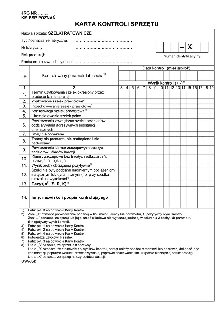 JRG NR …….. KM PSP POZNAŃ KARTA KONTROLI SPRZĘTU Nazwa sprzętu: SZELKI RATOWNICZE Typ / oznaczenie fabryczne: …………………………………… Nr fabryczny: …………………………………… Rok produkcji: …………………………………… – X Numer identyfikacyjny Producent (nazwa lub symbol): …………………………………… Data kontroli (miesiąc/rok) Kontrolowany parametr lub cecha1) Lp. Wynik kontroli (+ -)2) 1 1. 2. 3. 4. 5. 6. 7. 8. 9. 10. 11. 12. 2 Termin użytkowania szelek określony przez producenta nie upłynął Znakowanie szelek prawidłowe3) Przechowywanie szelek prawidłowe4) Konserwacja szelek prawidłowa4) Ukompletowanie szelek pełne Powierzchnia zewnętrzna szelek bez śladów oddziaływania agresywnych substancji chemicznych Szwy nie popękane Taśmy nie przetarte, nie nadtopione i nie naderwane Powierzchnie klamer zaczepowych bez rys, zadziorów i śladów korozji Klamry zaczepowe bez trwałych odkształceń, przewężeń i pęknięć Wynik próby obciążenia pozytywne5) Szelki nie były poddane nadmiernym obciążeniom statycznym lub dynamicznym (np. przy spadku strażaka z wysokości6) 13. Decyzja7) (S, R, K)8) 14. Imię, nazwisko i podpis kontrolującego 1) 2) 3) 4) 5) 6) 7) 8) 3 4 5 6 7 8 9 10 11 12 13 14 15 16 17 18 19 Patrz pkt. 3 na odwrocie Karty Kontroli. Znak „+” oznacza potwierdzenie podanej w kolumnie 2 cechy lub parametru, tj. pozytywny wynik kontroli. Znak „-” oznacza, że sprzęt lub jego część składowa nie wykazują podanej w kolumnie 2 cechy lub parametru, tj. negatywny wynik kontroli. Patrz pkt. 1 na odwrocie Karty Kontroli. Patrz pkt. 2 na odwrocie Karty Kontroli. Patrz pkt. 4 na odwrocie Karty Kontroli. Potwierdza użytkownik szelek. Patrz pkt. 3 na odwrocie Karty Kontroli. Litera „S” oznacza, że sprzęt jest sprawny. Litera „R” oznacza, że stosownie do wyników kontroli, sprzęt należy poddać remontowi lub naprawie, dokonać jego konserwacji, poprawić warunki przechowywania, poprawić znakowanie lub uzupełnić niezbędną dokumentację. Litera „K” oznacza, że sprzęt należy poddać kasacji. UWAGI: 1. ZNAKOWANIE Szelki powinny być trwale i czytelnie oznakowane numerem identyfikacyjnym (inwentarzowym lub serwisowym). Znakowanie powinno być wykonane w sposób nie utrudniający odczytu znakowania producenta. Znakowanie nie powinno pogarszać cech użytkowych szelek. 2. KONSERWACJA I PRZECHOWYWANIE Jeżeli w instrukcji fabrycznej nie zalecono inaczej, konserwację i przechowywanie szelek należy prowadzić według podanych niżej zasad. Konserwację należy przeprowadzać po każdym użyciu szelek, podczas którego szelki uległy zawilgoceniu lub zabrudzeniu oraz okresowo raz na miesiąc, niezależnie od warunków, w których szelki były użytkowane. Szelki należy umyć za pomocą miękkiej szczotki, stosując roztwory łagodnych środków myjących, o temperaturze nie wyższej niż +50oC. Szelki należy suszyć w temperaturze pokojowej w stanie rozwiniętym, w miejscu przewiewnym, zabezpieczonym przed bezpośrednim działaniem światła słonecznego oraz promieniowania ultrafioletowego. Części metalowe szelek powinny być dokładnie oczyszczone za pomocą miękkiej szmatki. Nieznaczne ślady korozji oraz drobne zarysowania, o ile występują na powierzchniach części metalowych, należy usunąć poprzez wypolerowanie za pomocą pasty polerskiej i filcu. Szelki nie będące w ogóle w użytkowaniu (znajdujące się w magazynie) należy konserwować regularnie co 12 miesięcy, odpowiednio według podanych zasad oraz dodatkowo pokryć cienką warstwą wazeliny technicznej części metalowe szelek. Magazynowanie szelek powinno odbywać się w pomieszczeniach suchych, przewiewnych, w warunkach zabezpieczających je przed działaniem wilgoci, substancji chemicznych, uszkodzeniami mechanicznymi, zabrudzeniami, bezpośrednim działaniem światła słonecznego oraz promieniowania ultrafioletowego i z dala od źródeł ciepła. 3. KONTROLA 3.1. Kontrola okresowa Kontrolę okresową wykonuje jednostka PSP, w której posiadaniu są szelki. Kontrola obejmuje szelki będące w użytkowaniu oraz szelki znajdujące się w magazynie. Kontrolę należy wykonywać co 6 miesięcy. Kontrola polega na sprawdzeniu kolejno wszystkich parametrów lub cech podanych w Karcie Kontroli. Wyniki kontroli i podjętą decyzję należy zapisać w Karcie zgodnie z podanymi w niej wskazówkami. Decyzja „S” powinna być podejmowana w przypadku, gdy wyniki wszystkich kontroli podanych w lp. 1 – 12 Karty są pozytywne. Decyzja „R” powinna być podejmowana, gdy negatywne są co najwyżej wyniki kontroli według lp. 2 – 5, 7, 10, a naprawa daje gwarancję odtworzenia wymaganych cech bez pogorszenia pozostałych parametrów lub cech podanych w Karcie. Bezpośrednio po usunięciu przyczyn podjęcia decyzji „R” (np. w wyniku wykonanej naprawy) należy dokonać ponownej kontroli co najmniej tych parametrów lub cech, które spowodowały tę decyzję. Ponownie zapisać wyniki kontroli i podjętą decyzję w Karcie. Decyzja „K” powinna być podejmowana, gdy negatywne są wyniki choć jednej z kontroli według lp. 1, 6, 8, 11, 12 oraz w pozostałych przypadkach, w których podjęcie decyzji „R” jest nieuzasadnione. 3.2. Kontrola bieżąca Kontrolę bieżącą wykonuje użytkownik szelek. Kontrola obejmuje wyłącznie szelki będące w użytkowaniu. Kontrolę należy przeprowadzać po każdym użyciu szelek. Kontrola polega na sprawdzeniu cech i parametrów według lp. 4 – 12 Karty. Sposób kontroli, zapisy i podejmowanie decyzji powinny odbywać się na zasadach, jak dla kontroli okresowej według pkt. 3.1. W przypadku, gdy wszystkie wyniki kontroli bieżącej są pozytywne, można nie dokonywać jej zapisów. 4. PRÓBA OBCIĄŻENIA Strażak powinien założyć szelki i wisieć w szelkach przez 10 minut. Wynik próby obciążenia należy uznać za pozytywny, jeżeli po tym czasie stra