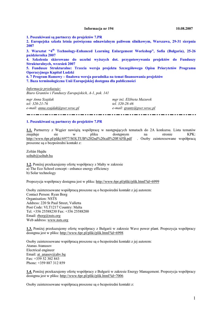 Informacja nr 194 10.08.2007 1. Poszukiwani są partnerzy do