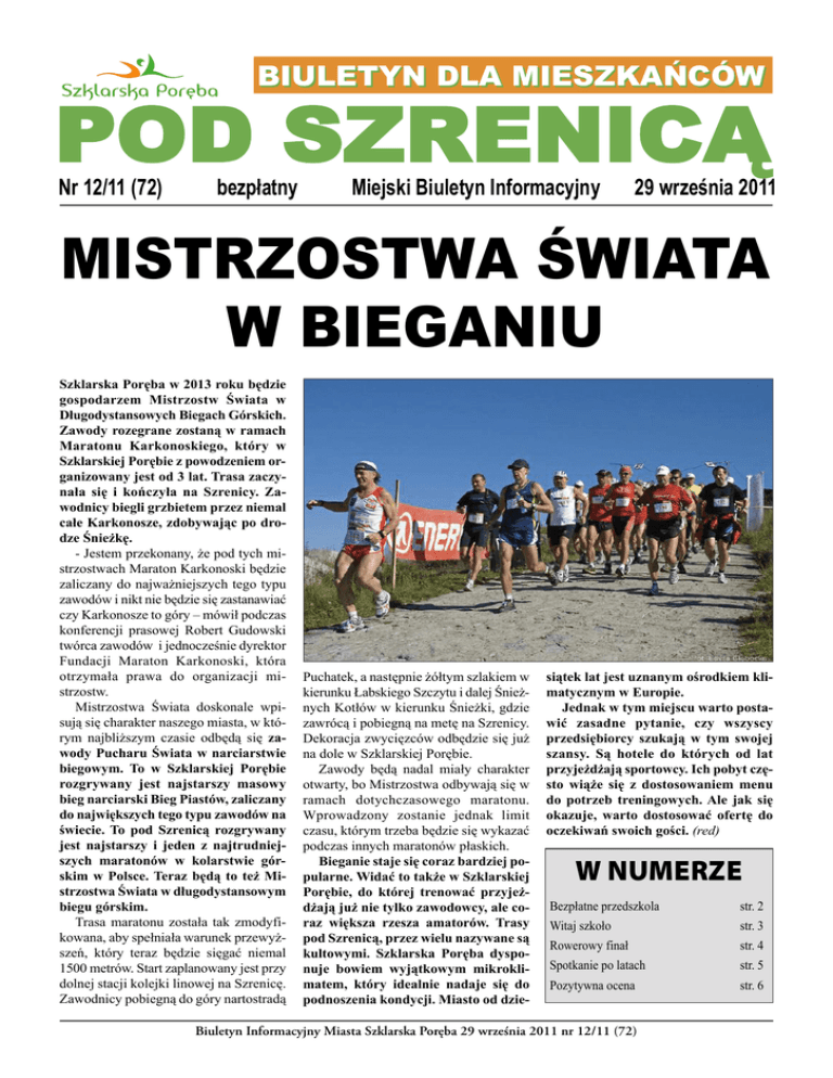 biuLetYn DLa mieszKaŃCÓw PoD szreniCą Nr 12/11 (72) bezpłatny Miejski Biuletyn Informacyjny 29 września 2011 mistrzostwa świata w bieganiu Szklarska Poręba w 2013 roku będzie gospodarzem Mistrzostw Świata w Długodystansowych Biegach Górskich. Zawody rozegrane zostaną w ramach Maratonu Karkonoskiego, który w Szklarskiej Porębie z powodzeniem organizowany jest od 3 lat. Trasa zaczynała się i kończyła na Szrenicy. Zawodnicy biegli grzbietem przez niemal całe Karkonosze, zdobywając po drodze Śnieżkę. - Jestem przekonany, że pod tych mistrzostwach Maraton Karkonoski będzie zaliczany do najważniejszych tego typu zawodów i nikt nie będzie się zastanawiać czy Karkonosze to góry – mówił podczas konferencji prasowej Robert Gudowski twórca zawodów i jednocześnie dyrektor Fundacji Maraton Karkonoski, która otrzymała prawa do organizacji mistrzostw. Mistrzostwa Świata doskonale wpisują się charakter naszego miasta, w którym najbliższym czasie odbędą się zawody Pucharu Świata w narciarstwie biegowym. To w Szklarskiej Porębie rozgrywany jest najstarszy masowy bieg narciarski Bieg Piastów, zaliczany do największych tego typu zawodów na świecie. To pod Szrenicą rozgrywany jest najstarszy i jeden z najtrudniejszych maratonów w kolarstwie górskim w Polsce. Teraz będą to też Mistrzostwa Świata w długodystansowym biegu górskim. Trasa maratonu została tak zmodyfikowana, aby spełniała warunek przewyższeń, który teraz będzie sięgać niemal 1500 metrów. Start zaplanowany jest przy dolnej stacji kolejki linowej na Szrenicę. Zawodnicy pobiegną do góry nartostradą Puchatek, a następnie żółtym szlakiem w kierunku Łabskiego Szczytu i dalej Śnieżnych Kotłów w kierunku Śnieżki, gdzie zawrócą i pobiegną na metę na Szrenicy. Dekoracja zwycięzców odbędzie się już na dole w Szklarskiej Porębie. Zawody będą nadal miały charakter otwarty, bo Mistrzostwa odbywają się w ramach dotychczasowego maratonu. Wprowadzony zostanie jednak limit czasu, którym trzeba będzie się wykazać podczas innych maratonów płaskich. Bieganie staje się coraz bardziej popularne. Widać to także w Szklarskiej Porębie, do której trenować przyjeżdżają już nie tylko zawodowcy, ale coraz większa rzesza amatorów. Trasy pod Szrenicą, przez wielu nazywane są kultowymi. Szklarska Poręba dysponuje bowiem wyjątkowym mikroklimatem, który idealnie nadaje się do podnoszenia kondycji. Miasto od dzie- siątek lat jest uznanym ośrodkiem klimatycznym w Europie. Jednak w tym miejscu warto postawić zasadne pytanie, czy wszyscy przedsiębiorcy szukają w tym swojej szansy. Są hotele do których od lat przyjeżdżają sportowcy. Ich pobyt często wiąże się z dostosowaniem menu do potrzeb treningowych. Ale jak się okazuje, warto dostosować ofertę do oczekiwań swoich gości. (red) W NUMERZE Bezpłatne przedszkola str. 2 Witaj szkoło str. 3 Rowerowy finał str. 4 Spotkanie po latach str. 5 Pozytywna ocena str. 6 Biuletyn Informacyjny Miasta Szklarska Poręba 29 września 2011 nr 12/11 (72) bezPłatne PrzeDszKoLa Niemal w całej Polsce rodzice narzekają na drastyczne podwyżki czesnego w przedszkolach. Są miasta, gdzie za pobyt dziecka trzeba zapłacić ponad 600 złotych. W Szklarskiej Porębie jest inaczej. Nasze miasto jest jednym z nielicznych wyjątków na mapie Polski. Rada Miasta kolejny raz podjęła uchwałę, na mocy której „świadczenia udzielane przez publiczne przedszkola prowadzone przez miasto Szklarska Poręba w zakresie wychowania przedszkolnego, obejmującego podstawę programową wychowania przedszkolnego, o której mowa w odrębnych przepisach, są realizowane bezpłatnie w wymiarze pięciu godzin dziennie, a za świadczenia publicznych przedszkoli, wykraczające poza podstawę programową wychowania przedszkolnego ustalono opłatę miesięczną w wysokości „0” zł.” Innymi słowy czesne w przedszkolach jest bezpłatne. Rodzice muszą pokryć tylko koszty wyżywienia lub ewentualnych zajęć dodatkowych, jeśli chcą, aby ich dzieci w nich uczestniczyły. uwaga w sPrawie Cmentarza Program soLarnY W związku z inwentaryzacją miejsc do pochówku części parafialnej cmentarza przy ul. Stefana Kardynała Wyszyńskiego uprasza się o uregulowanie zaległych opłat za groby i miejsca zarezerwowane. Opłat należy dokonać w kancelarii parafialnej przy ul. Wyszyńskiego. W przypadku nieuregulowania opłat groby oraz miejsca za- rezerwowane zostaną przekopane i przeznaczone do ponownego pochówku. Jednocześnie prosimy o uporządkowanie ww. miejsc i nie wyrzucanie śmieci poza miejsca wyznaczone na cmentarzu. OO. Franciszkanie i radni RM w Szklarskiej Porębie 5 października (środa) o godz. 14.00 w sali narad Urzędu Miejskiego odbędzie się kolejne spotkanie zainteresowanych programem dotacji do 70% na zakup zestawów solarnych. Na spotkaniu przedstawiciele firmy HETMAN CD (operator i koordynator projektu) przedstawią założenia projektu i udzielą odpowiedzi na wszystkie pytania zainteresowanych przystąpieniem do programu. Dodatkowe informacje co do spotkania można uzyskać w Urzędzie Miejskim pod nr tel. 75/75 47 733 nabÓr narCiarzY Klub sportowy „Szrenica” prowadzi nabór dzieci i młodzieży do sekcji narciarstwa zjazdowego. Klub istnieje od 1994 roku. Naszą działalność prowadzimy w formie stowarzyszenia. Zajmujemy się rozwojem narciarstwa alpejskiego wśród dzieci i młodzieży poprzez zorganizowane szkolenie rekreacyjne i zawodnicze. Wyodrębnione są 3 kategorie: dzieci najmłodsze, grupa rekreacyjna, grupa sportowa. Ilość oraz wielkość grup w w/w kategoriach jest zależna od ilości dzieci i nie przekracza 10 osób w grupie. Podstawowym warunkiem rozpoczęcia treningów przez dziecko, prócz spełnienia wymogów formalnych, jest posiadanie ważnych badań lekarskich oraz umiejętność pod- stawy jazdy na nartach. Jesienią i wiosną zajęcia odbywają się na basenie, sali gimnastyczne