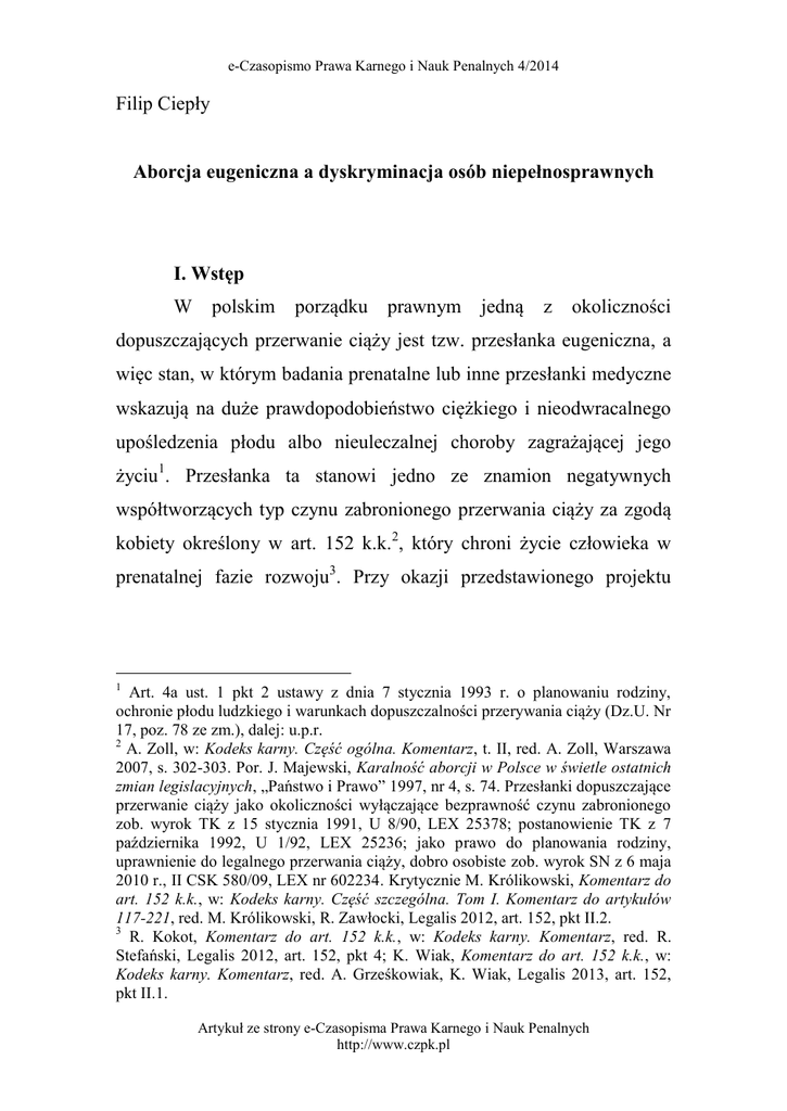 e-Czasopismo Prawa Karnego i Nauk Penalnych 4/2014 Filip Ciepły Aborcja eugeniczna a dyskryminacja osób niepełnosprawnych I. Wstęp W polskim porządku prawnym jedną z okoliczności dopuszczających przerwanie ciąży jest tzw. przesłanka eugeniczna, a więc stan, w którym badania prenatalne lub inne przesłanki medyczne wskazują na duże prawdopodobieństwo ciężkiego i nieodwracalnego upośledzenia płodu albo nieuleczalnej choroby zagrażającej jego życiu1. Przesłanka ta stanowi jedno ze znamion negatywnych współtworzących typ czynu zabronionego przerwania ciąży za zgodą kobiety określony w art. 152 k.k.2, który chroni życie człowieka w prenatalnej fazie rozwoju3. Przy okazji przedstawionego projektu 1 Art. 4a ust. 1 pkt 2 ustawy z dnia 7 stycznia 1993 r. o planowaniu rodziny, ochronie płodu ludzkiego i warunkach dopuszczalności przerywania ciąży (Dz.U. Nr 17, poz. 78 ze zm.), dalej: u.p.r. 2 A. Zoll, w: Kodeks karny. Część ogólna. Komentarz, t. II, red. A. Zoll, Warszawa 2007, s. 302-303. Por. J. Majewski, Karalność aborcji w Polsce w świetle ostatnich zmian legislacyjnych, „Państwo i Prawo” 1997, nr 4, s. 74. Przesłanki dopuszczające przerwanie ciąży jako okoliczności wyłączające bezprawność czynu zabronionego zob. wyrok TK z 15 stycznia 1991, U 8/90, LEX 25378; postanowienie TK z 7 października 1992, U 1/92, LEX 25236; jako prawo do planowania rodziny, uprawnienie do legalnego przerwania ciąży, dobro osobiste zob. wyrok SN z 6 maja 2010 r., II CSK 580/09, LEX nr 602234. Krytycznie M. Królikowski, Komentarz do art. 152 k.k., w: Kodeks karny. Część szczególna. Tom I. Komentarz do artykułów 117-221, red. M. Królikowski, R. Zawłocki, Legalis 2012, art. 152, pkt II.2. 3 R. Kokot, Komentarz do art. 152 k.k., w: Kodeks karny. Komentarz, red. R. Stefański, Legalis 2012, art. 152, pkt 4; K. Wiak, Komentarz do art. 152 k.k., w: Kodeks karny. Komentarz, red. A. Grześkowiak, K. Wiak, Legalis 2013, art. 152, pkt II.1. Artykuł ze strony e-Czasopisma Prawa Karnego i Nauk Penalnych http://www.czpk.pl e-Czasopismo Prawa Karnego i Nauk Penalnych 4/2014 nowelizacji kodeksu karnego4 warto przyjrzeć się głosom krytycznym kierowanym wobec dopuszczalności przerwania ciąży ze względów eugenicznych. Wśród zarzutów stawianych dopuszczalności aborcji z powodu wad rozwojowych płodu pojawiają się zarzuty dyskryminacji i nierównego traktowania. Były one podnoszone między innymi kilka miesięcy temu w Sejmie w związku z obywatelską inicjatywą ustawodawczą nowelizacji ustawy o planowaniu rodziny5. Podobna debata, zawierająca zarzuty dyskryminacyjne, miała niedawno miejsce w parlamencie Wielkiej Brytanii6. Głosy krytyczne wobec dopuszczalności selektywnej aborcji płodów upośledzonych są podnoszone przez obrońców praw osób niepełnosprawnych w Stanach Zjednoczonych, Niemczech, Japonii i innych krajach7. We wstępie trzeba zaznaczyć, że problem prawnokarnej ochrony życia człowieka w prenatalnej fazie rozwoju należy do grupy tematów spornych. Mimo że zagadnienie w pewnym stopniu odnosi się do indywidualnych postaw światopoglądowych, to jego społeczna doniosłość i związek z godnością człowieka uzasadnia podjęcie racjonalnego dyskursu na bazie argumentów 4 formalno- Projekt nowelizacji kodeksu karnego z 5 listopada 2013 r. przygotowany przez Komisję Kodyfikacyjną Prawa Karnego przewiduje m.in. przeniesienie warunków dopuszczalności aborcji do kodeksu karnego wraz z zastąpieniem dotychczasowej przesłanki eugenicznej bardziej syntetycznym sformułowaniem „ciężkie i nieodwracalne uszkodzenie dziecka poczętego”. 5 Zob. Sprawozdanie stenograficzne z 50. posiedzenia Sejmu Rzeczypospolitej Polskiej w dniu 26 września 2013 r. (drugi dzień obrad), Warszawa 2013, s. 208226. 6 Zob. www.abortionanddisability.org. 7 M. Saxton, Disability Rights and Selective Abortion, w: The Disabilities Studies Reader, red. L.J. Davis, New York 2013; M. Kato, Women’s Rights?: The Politics of Eugenic Abortion in Modern Japan, Amsterdam University Press 2009; Abortion Wars: A Half Century of Struggle 1950-2000, red. R. Solinger, University of California Press 1998, s. 380 inn. Artykuł ze strony e-Czasopisma Prawa Karnego i Nauk Penalnych http://www.czpk.pl e-Czasopismo Prawa Karnego i Nauk Penalnych 4/2014 dogmatycznych, aksjologicznych, antropologicznych czy socjologicznych, uznanych na gruncie metody właściwej nauce prawa karnego, zarówno na płaszczyźnie de lege lata, jak i de lege ferenda8. Celem niniejszego artykułu jest próba przedstawienia krytycznego spojrzenia na przesłankę eugeniczną z perspektywy zarzutów nierównego traktowania i dyskryminacji. Zagadnienie będzie rozpatrywane na tle następujących pytań: Czy płód ludzki w ogóle może być przedmiotem działań dyskryminacyjnych? Czy w zakresie prawnokarnej ochrony życia płód z wadami rozwojowymi jest dyskryminowany w porównaniu do płodu rozwijającego się prawidłowo? Czy ze względu na motywacyjną funkcję prawa przesłanka eugeniczna utrwala postawy dyskryminacyjne wobec osób niepełnosprawnych? Czyniąc wstępne uwagi terminologiczne należy zaznaczyć, że w literaturze prawniczej w odniesieniu do człowieka w prenatalnej fazie rozwojowej stosuje się różne pojęcia, często wskazujące na określony etap rozwoju biologicznego: embrion, zygota, zarodek, płód, a także nasciturus, dziecko poczęte, dziecko nienarodzone, organizm ludzki od momentu zapłodnienia, istota ludzka przed 8 Warto zaznaczyć, że nie mają merytorycznej wagi zarzuty przynależności konfesyjnej poszczególnych członków Komisji Kodyfikacyjnej. Komisja uzasadnia potrzebę nowelizacji art. 152 i nast. w oparciu o argumenty formalno-dogmatyczne i aksjologiczne, właściwe dla nauki prawa, nie odwołuje się do argumentów opartych na autorytecie źródeł uznanych na gruncie tradycji religijnych i teologicznych (Biblii, Talmudu, Koranu, Wed, pism Konfucj