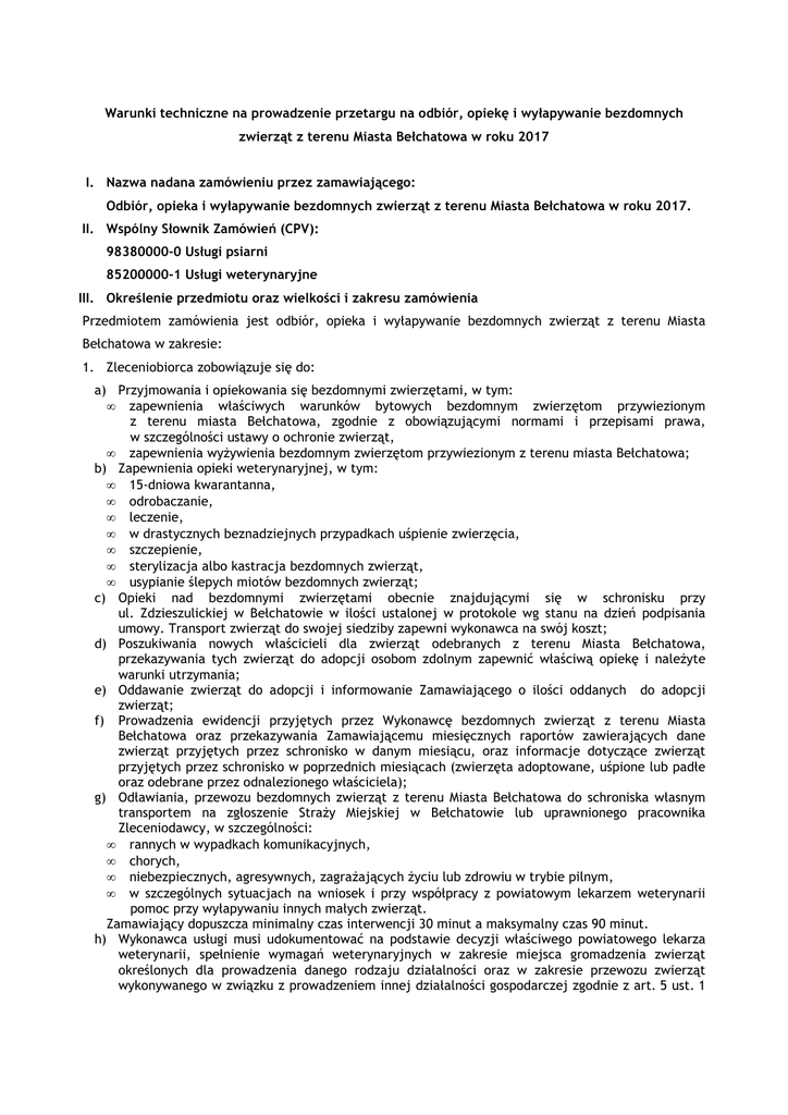 Warunki techniczne na prowadzenie przetargu na odbiór, opiekę i wyłapywanie bezdomnych zwierząt z terenu Miasta Bełchatowa w roku 2017 I. Nazwa nadana zamówieniu przez zamawiającego: Odbiór, opieka i wyłapywanie bezdomnych zwierząt z terenu Miasta Bełchatowa w roku 2017. II. Wspólny Słownik Zamówień (CPV): 98380000-0 Usługi psiarni 85200000-1 Usługi weterynaryjne III. Określenie przedmiotu oraz wielkości i zakresu zamówienia Przedmiotem zamówienia jest odbiór, opieka i wyłapywanie bezdomnych zwierząt z terenu Miasta Bełchatowa w zakresie: 1. Zleceniobiorca zobowiązuje się do: a) Przyjmowania i opiekowania się bezdomnymi zwierzętami, w tym: • zapewnienia właściwych warunków bytowych bezdomnym zwierzętom przywiezionym z terenu miasta Bełchatowa, zgodnie z obowiązującymi normami i przepisami prawa, w szczególności ustawy o ochronie zwierząt, • zapewnienia wyżywienia bezdomnym zwierzętom przywiezionym z terenu miasta Bełchatowa; b) Zapewnienia opieki weterynaryjnej, w tym: • 15-dniowa kwarantanna, • odrobaczanie, • leczenie, • w drastycznych beznadziejnych przypadkach uśpienie zwierzęcia, • szczepienie, • sterylizacja albo kastracja bezdomnych zwierząt, • usypianie ślepych miotów bezdomnych zwierząt; c) Opieki nad bezdomnymi zwierzętami obecnie znajdującymi się w schronisku przy ul. Zdzieszulickiej w Bełchatowie w ilości ustalonej w protokole wg stanu na dzień podpisania umowy. Transport zwierząt do swojej siedziby zapewni wykonawca na swój koszt; d) Poszukiwania nowych właścicieli dla zwierząt odebranych z terenu Miasta Bełchatowa, przekazywania tych zwierząt do adopcji osobom zdolnym zapewnić właściwą opiekę i należyte warunki utrzymania; e) Oddawanie zwierząt do adopcji i informowanie Zamawiającego o ilości oddanych do adopcji zwierząt; f) Prowadzenia ewidencji przyjętych przez Wykonawcę bezdomnych zwierząt z terenu Miasta Bełchatowa oraz przekazywania Zamawiającemu miesięcznych raportów zawierających dane zwierząt przyjętych przez schronisko w danym miesiącu, oraz informacje dotyczące zwierząt przyjętych przez schronisko w poprzednich miesiącach (zwierzęta adoptowane, uśpione lub padłe oraz odebrane przez odnalezionego właściciela); g) Odławiania, przewozu bezdomnych zwierząt z terenu Miasta Bełchatowa do schroniska własnym transportem na zgłoszenie Straży Miejskiej w Bełchatowie lub uprawnionego pracownika Zleceniodawcy, w szczególności: • rannych w wypadkach komunikacyjnych, • chorych, • niebezpiecznych, agresywnych, zagrażających życiu lub zdrowiu w trybie pilnym, • w szczególnych sytuacjach na wniosek i przy współpracy z powiatowym lekarzem weterynarii pomoc przy wyłapywaniu innych małych zwierząt. Zamawiający dopuszcza minimalny czas interwencji 30 minut a maksymalny czas 90 minut. h) Wykonawca usługi musi udokumentować na podstawie decyzji właściwego powiatowego lekarza weterynarii, spełnienie wymagań weterynaryjnych w zakresie miejsca gromadzenia zwierząt określonych dla prowadzenia danego rodzaju działalności oraz w zakresie przewozu zwierząt wykonywanego w związku z prowadzeniem innej działalności gospodarczej zgodnie z art. 5 ust. 1 i) • • j) k) l) • • • • m) • • n) o) p) q) r) s) t) • • u) • • v) w) x) y) ustawy z dnia 11 marca 2004r. o ochronie zdrowia zwierząt oraz zwalczaniu chorób zakaźnych zwierząt; Wykonawca zobowiązany jest przy odławianiu zwierząt do: posługiwania się urządzeniami i środkami nie stwarzającymi zagrożenia dla życia, zdrowia ani zadawania cierpień odławianym zwierzętom, stosowania środków do przewozu zwierząt spełniających warunki określone w ustawie o ochronie zwierząt; Wykonawca zobowiązany jest dostosować się do warunków Programu opieki nad zwierzętami bezdomnymi oraz zapobiegania bezdomności zwierząt na terenie Miasta Bełchatowa; Zamawiający wymaga by przedmiot zamówienia był wykonywany zgodnie z obowiązującymi przepisami prawa w zakresie ochrony zwierząt; Wykonawca zobowiązany jest do przestrzegania przepisów prawa ujętych w: ustawie z dnia 21 sierpnia 1997r. o ochronie zwierząt, ustawie z dnia 11 marca 2004r. o ochronie zdrowia zwierząt oraz zwalczaniu chorób zakaźnych zwierząt, ustawie z dnia 13 września 1996r. o utrzymaniu czystości i porządku w gminach, właściwych rozporządzeniach wydanych na podstawie ww. ustaw; Wykonawca wykonujący przedmiot zamówienia musi posiadać aktualne na dzień złożenia oferty zezwolenie na: prowadzenie działalności w zakresie prowadzenia schronisk dla bezdomnych zwierząt, zezwolenie w zakresie ochrony przed bezdomnymi zwierzętami na obszarze Gminy Miasto Bełchatów; Wykonawca zobowiązany jest do zachowania bezpieczeństwa, porządku i czystości podczas realizacji przedmiotu umowy; Wykonawca zobowiązany jest do powierzenia prac objętych przedmiotem umowy pracownikom posiadającym wymagane do tego kwalifikacje i uprawnienia oraz zaopatrzenia ich w odpowiedni sprzęt zapewniający bezpieczeństwo; Wykonawca winien dysponować przynajmniej jednym środkiem transportu przeznaczonym do świadczenia usług w zakresie przewozu zwierząt oraz spełniającym obowiązujące w Polsce przepisy dotyczące transportu zwierząt; Wykonawca winien dysponować urządzeniami i środkami przy pomocy których wyłapywane będą bezdomne zwierzęta, w tym klatki do transportu zwierząt min. 2 szt. oraz 1 szt. klatek rozkładanych (rozmiarowo dobrane do wielkości zwierzęcia). Używane przy wyłapywaniu zwierząt bezdomnych urządzenia i środki nie mogą stwarzać zagrożenia dla ich życia i zdrowia ani zadawać im cierpienia. Do wyłapywania zwierząt niezbędny jest aplikator gazowy (strzelba pneumatyczna) z zestawem strzykawek oraz chwytaki dla psów i kotów (po jednej sztuce); Wykonawca winien dysponować minimum sześcioma osobami posiadających licencję dla kierowców i osób obsługujących trans