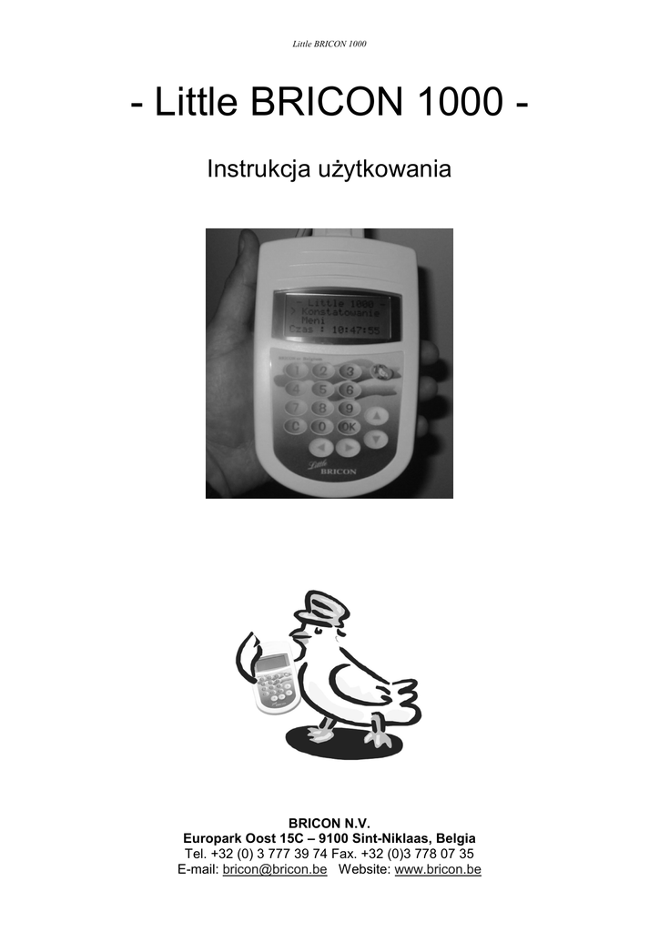 Little BRICON 1000 - Little BRICON 1000 Instrukcja użytkowania BRICON N.V. Europark Oost 15C – 9100 Sint-Niklaas, Belgia Tel. +32 (0) 3 777 39 74 Fax. +32 (0)3 778 07 35 E-mail: [email protected] Website: www.bricon.be Little BRICON 1000 SPIS TREŚCI I WSTĘP 3 II SZYBKI START 6 III FUNKCJE MENU (MENU GŁÓWNE) 7 1. Koszowanie gołębi na lot 9 2. Odczyt danych po odbytym locie 13 3. Typowanie gołębi na lot 15 4. Funkcja ”Status lotu” 16 5. Funkcja ”Masterclock” 16 6. Funkcja ”Usun” 17 7. Wydruk spisu przyporządkowanych gołębi 18 8. Wprowadzanie gołębi 20 9. Wprowadzanie danych hodowcy 22 10. Opisy lotów (dodawanie/usuwanie/modyfikacja) 24 11. Konfiguracja funkcji SMS 26 12. Konfiguracja wydruków 29 13. Ręczne ustawianie zegara 32 14. Konfiguracja anten 33 15. Inne opcje (zmiana języka, zmiana hasła ...) 35 IV DANE TECHNICZNE Little Bricon 1000 37 Instrukcja użytkowania - version 4.0 Polski 2/2 Little BRICON 1000 I - WSTĘP „Little Bricon” jest sterowany z Menu. Wyświetlacz jest w kodzie ASCII - ma 4 rzędy po 16 znaków. Gdy podłączysz zasilanie do „Little Bricon” – zegar uruchamiając się testuje oprogramowanie i urządzenia. SYSCHECK 0123 Zajetych … 14 V4.0 Polski "14" - liczba gołębi zarejestrowanych w zegarze (maksimum 999). "V4.0 Polski" - wersja oprogramowania. - Little 1000 Jan Kowacz 0346013201 Imię, Nazwisko i numer rejestracyjny (tzw. licencja) hodowcy pokazane są przez kilku sekund. Jeśli nie są podłączone żadne anteny do zegara, „Little Bricon” wyświetli menu główne z aktualnym czasem. - Little 1000 > Konstatowanie Meni Czas: 19:57:24 Little Bricon 1000 Instrukcja użytkowania - version 4.0 Polski 3/3 Little BRICON 1000 Gdy „Little Bricon” wykryje jedną lub więcej anten i jeśli są zarejestrowane gołębie w zegarze, automatycznie przejdzie w tryb konstatowania. Widok 1. Konst. z 03 Ant P011 T014 R002 T PL-05-0346004159 24/06-15:54:59 Widok 2. Konst. z 03 Ant P012 T014 R002 TR PL-05-0346004158 24/06-15:55:40 Opis ‘WIDOK 1’: "Konst. z 03 Ant" - ilość podłączonych anten. "P011" – przeglądanie 11-tego skonstatowanego gołębia. "T014" – ilość, wszystkich skonstatowanych gołębi (T-total). "R002" – zegar wykrył 2 ptaki z lotu konkursowego, (pozostałe 12 szt. są to gołębie które nie brały udziału w locie konkursowym). Strzałkami (”GÓRA” - ”DÓŁ”) można przeglądać wszystkie skonstatowane ptaki. Jeśli podczas podłączenia „Little Bricon” wykryje Club-Antena (tzw. matkę), zegar automatycznie przechodzi do poniższego menu („- -KONKURS(6)- -”. - Meni-1) ‘T’ -oznacza że jest to gołąb typowany ‘TR’ - Oznacza gołębia który został zarejestrowany ale nie bierze udziału w danym locie (TR=trening) – WIDOK 2. --Konkurs(6)-->1 Koszowanie 2 Odczyt 3 pom. odczyt "(6)" oznacza, że w tej części menu jest 6 funkcji. Strzałkami (”GÓRA” - ”DÓŁ”) przeglądamy funkcje. --Konkurs(6)-->4 Typowanie 5 Loty 6 Masterclock Little Bricon 1000 Instrukcja użytkowania - version 4.0 Polski 4/4 Little BRICON 1000 Wszystkie funkcje objaśnione są w dalszej części instrukcji. Opis klawiatury zegara „Little 1000”: Wyświetlacz Klawiatura numeryczna Przycisk <C> Przyciski ”GÓRA” - ”DÓŁ” Przycisk <OK> Przyciski <<-lewo- -prawo->>) BRICON N.V. Europark Oost 15C – 9100 Sint-Niklaas, Belgia Tel. +32 (0) 3 777 39 74 Fax. +32 (0)3 778 07 35 E-mail: [email protected] Website: www.bricon.be Little BRICON 1000 II - SZYBKI START!!! Gratulujemy Ci z wyboru kupna nowego zegara. "Little Bricon 1000" jest zegarem z wieloma funkcjami i stał się najpopularniejszym na świecie. Oczywiście chcesz go użyć jak najszybciej. Ta część instrukcji jest szybkim przewodnikiem, aby w krótkim czasie poprawnie go uruchomić. Jak szybko wejść w opcje „Menu?. Opis „Meni-4-3-1”: oznacza, że aby wejść do danej funkcji z głównego menu musisz nacisnąć cyfry: 4 3 1. Jakie kroki musisz wykonać? A) Instalacja. Zamontuj anteny w wejściach do gołębnika, musisz być pewien, że nie ma na wejściach tzw. martwych pól. Przed montowaniem anten nadaj każdej unikalny numer (1->16). Programowanie anten jest wyjaśnione w części 14. Konfiguracja anten na stronie 32 (Meni-4-3-1). Teraz połącz anteny kablami ze sobą. Podłączać ostatnią antenę z zegarem. Upewnij się, że wtyczka „męska” (z bolcami) jest od strony zegara. Jeśli instalacja jest zakończona podłącz zasilanie do „Little Bricon” i uruchom „Test. Ant.”, Na stronie 34. (Meni-4-3-2) B) wprowadź imię, nazwisko i nr licencji do zegara Wyjaśnione to jest w części 9. Wprowadzanie danych hodowcy na stronie 22. (Meni-2-5-1) C) wprowadź gołębie do zegara Wyjaśnione to jest w części 8. Wprowadzanie gołębi na stronie 20. (Meni-2-4-1) D) koszowanie ptaków na lot Wyjaśnione to jest w części 1. Koszowanie gołębi na lot na stronie 9. (Meni-1-1) E) odczyt danych z lotu. Wyjaśnione to jest w części 2. Odczyt danych po odbytym locie na stronie 13. (Meni-1-2) F) usuwanie danych Wyjaśnione to jest w części 6. Funkcja ”Usun” na stronie 17. (Meni-2-2) Little Bricon 1000 Instrukcja użytkowania - version 4.0 Polski 6/6 Little BRICON 1000 III - FUNKCJE MENU Menu główne. - Little 1000 Konstatowanie >Meni Czas: 19:57:24 ** Meni (5) ** >1 Konkurs 2 Widok 3 Opcje ** Meni (5) ** 4 Ustawienia 5 PC-COM 1. Menu ** >1 2 3 Meni (5) ** Konkurs Widok Opcje 1.1 Konkurs --Konkurs(6)— >1 Koszowanie 2 Odczyt 3 Pom. odczyt --Konkurs(6)->4 Typowanie 5 Loty Status 6 Masterclock ** 1 >2 3 Meni (5) ** Konkurs Widok Opcje Little Bricon 1000 Instrukcja użytkowania - version 4.0 Polski 7/7 Little BRICON 1000 1.2. Widok ---Widok(6)-->1 Przeg.Konst. 2 Usun 3 Drukuj ---Widok(6)-->4 Spis Golebi 5 Hodowca 6 Loty ** 1 2 >3 Meni (5) ** Konkurs Widok Opcje 1.3. Opcje --Opcje(3)—>1 Wloz golebia 5 Modem 6 SMS ** Meni (5) ** >4 Ustawienia 5 PC-COM 1.4. Przyklad --Przyklad(5)->1 Opcje drukar 2 Zegar 3 Anten